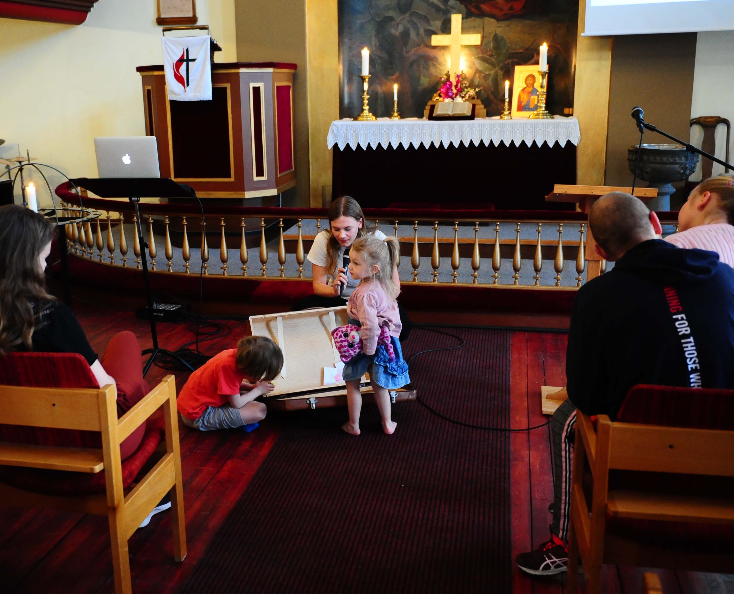 Kjærlighet og misjon var tema som preget søndagens gudstjeneste. Også i kofferten var det kjærlighet (på pinne) til barna. Men alle frammøtte ble oppfordret til å ta med seg en kjærlighet på vei ut av kirken; og kanskje henge den opp i et tre, en lyktestolpe eller legge den igjen på bussen – til glede for andre.