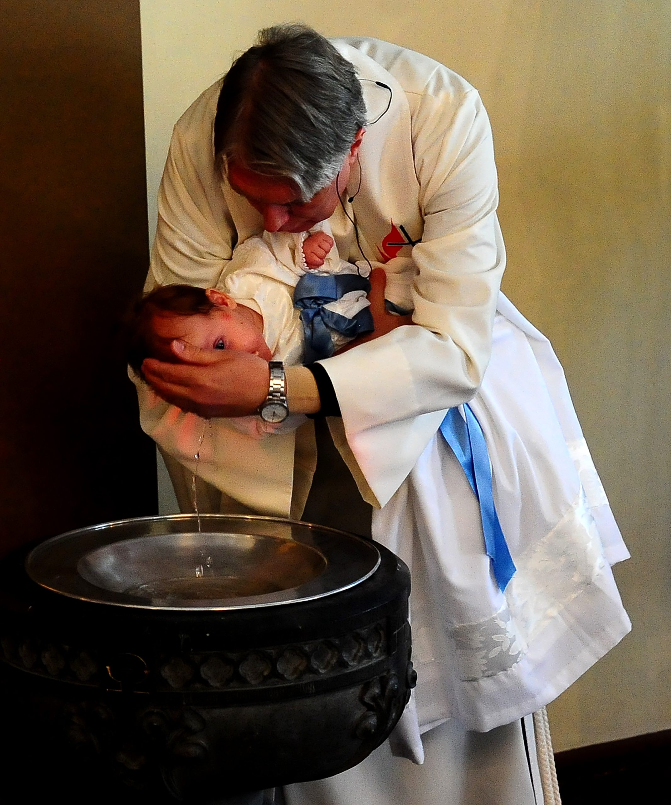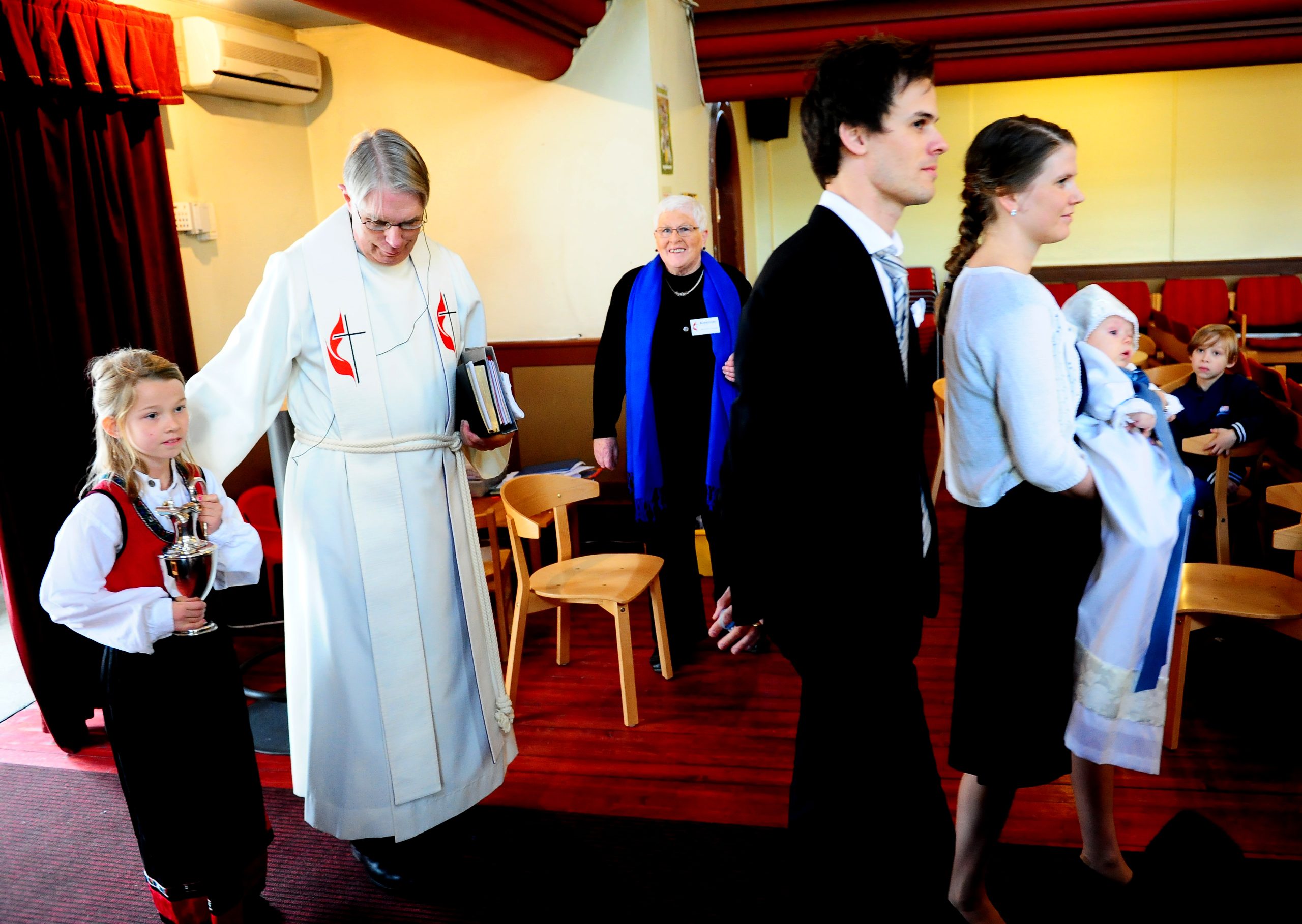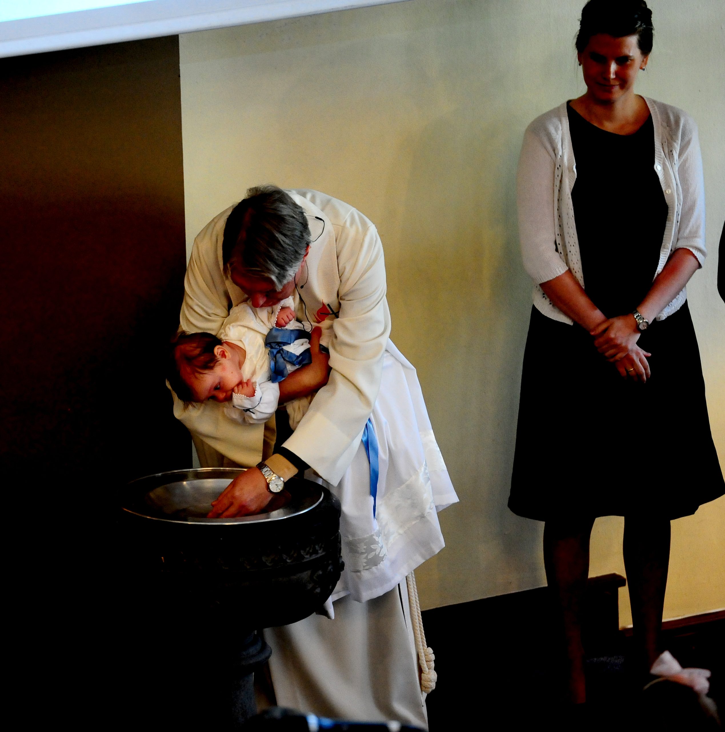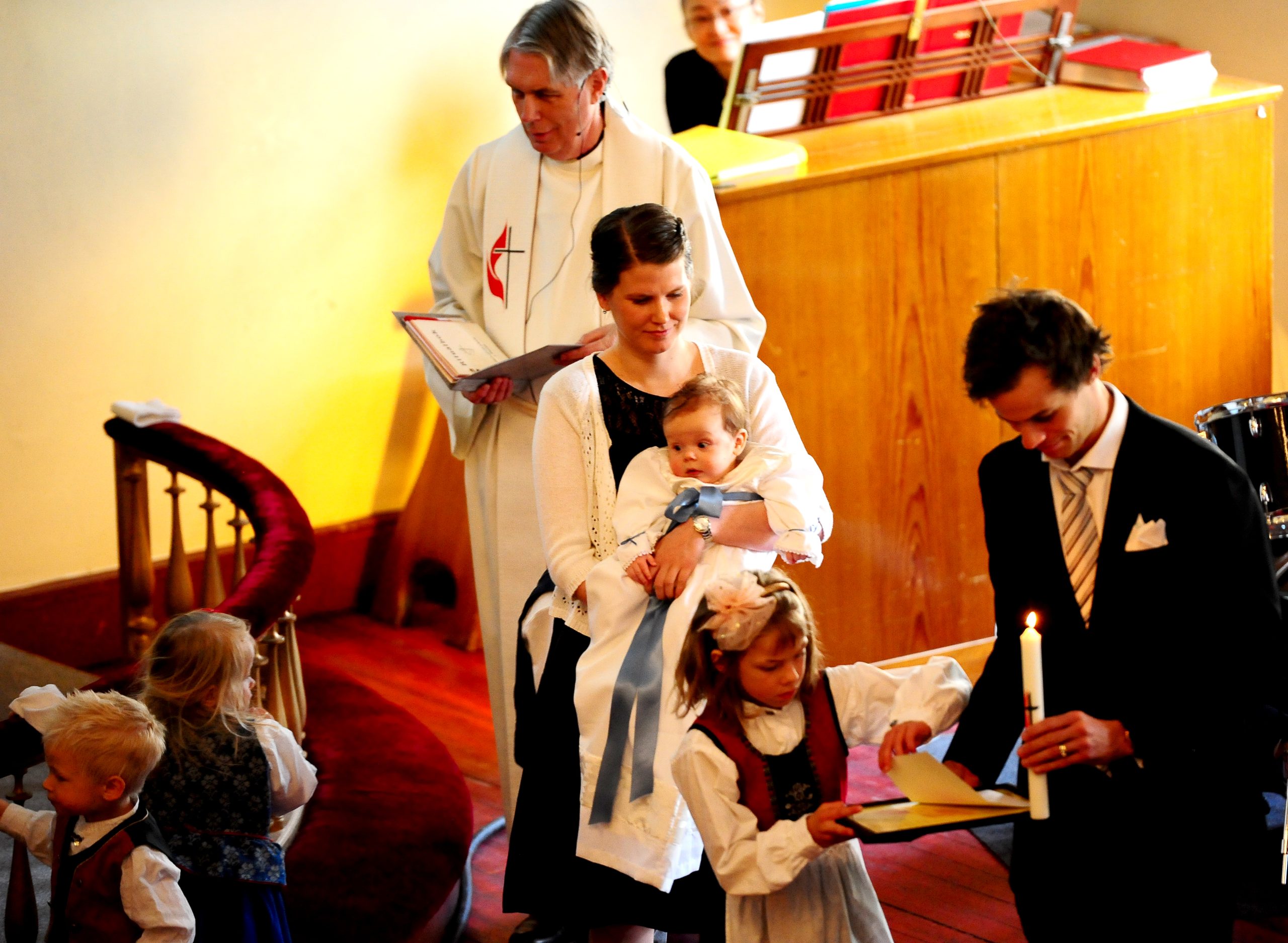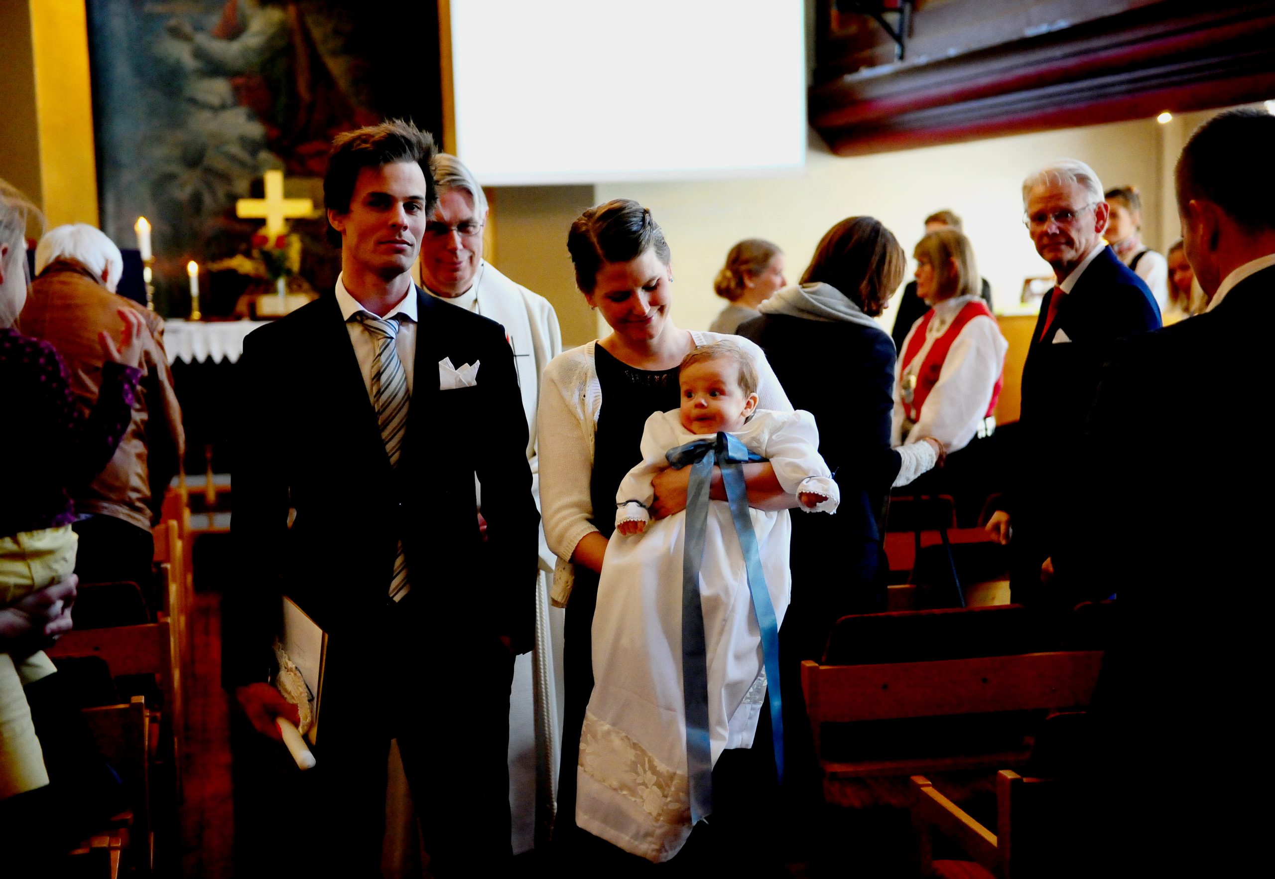 – Nøyaktig hva som skjer i dåpen er et mysterium, sa han. Her i kirken liker vi å tenke oss at Guds nåde er virksom i barnet allerede før, i og etter dåpen. I dag feirer vi at dåpsbarnet blir tatt opp i Guds store menighet og i vår menighet. Dåpsbarnet får stempelet, tegnet på at det er et Guds bar, og vi ber om at Gud selv må døpe det med Den hellige Ånd, når vi døper med vann. Så må barnet selv etter hvert som det vokser til velge om det vil bli værende i den dåpspakten som det ble døpt inn, i eller finne sin egen vei.