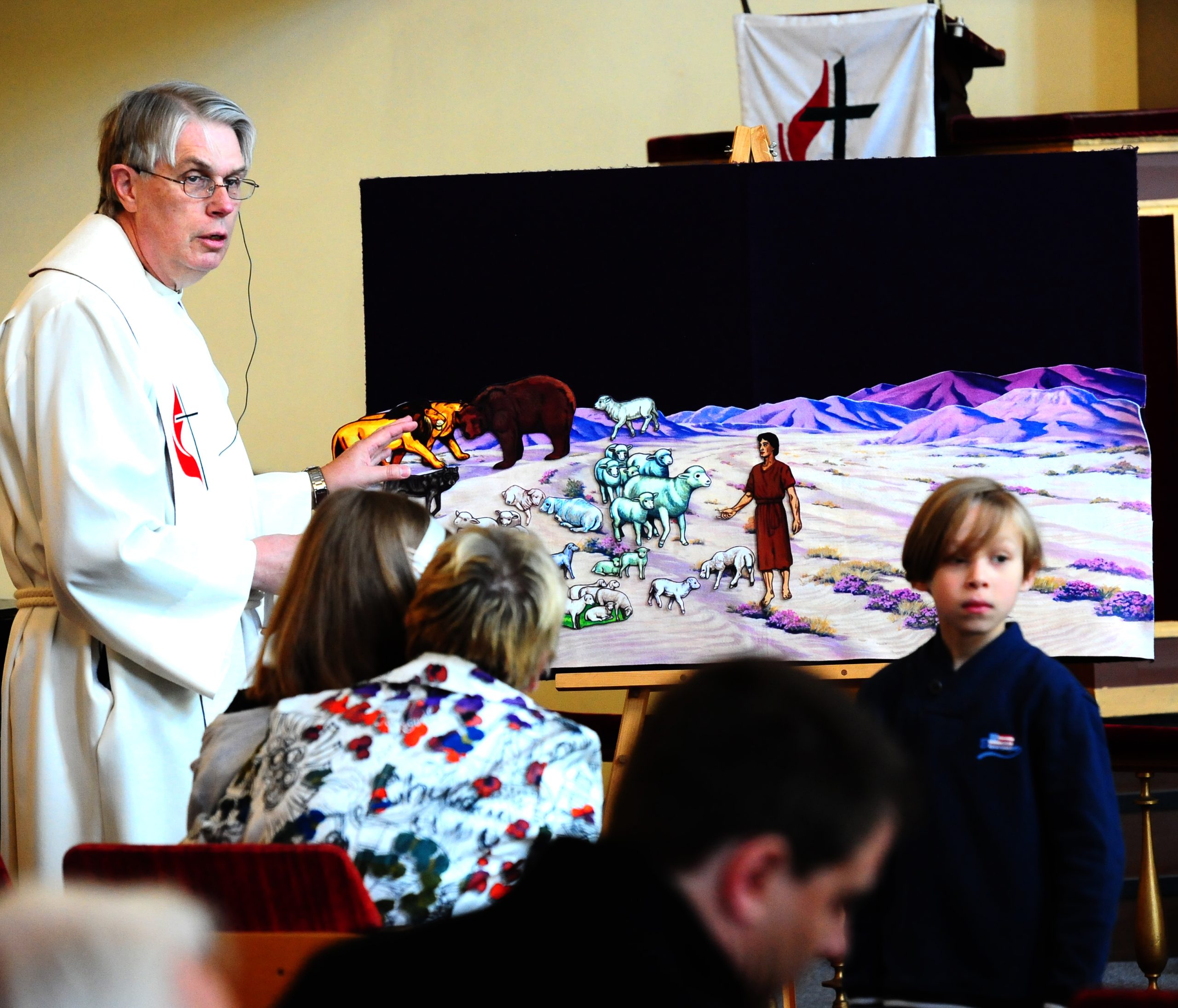 Sander-11 (dåpen)Dåp er ingen hver(søn)dagslig hendelse i kirken vår. Dåp er alltid en fest, og vi var omkring 50 tilstede på søndagens dåpsfestgudstjeneste. Takako (Ueno) spilte orgel. Bjørg (Burkeland) leste tekstene. Trygve (Sivertsen) styrte teknikken. Pastor Nordby tok selv hånd om praten med barna, og «kofferten» inneholdt denne gangen både sauer og ville dyr som barna festet på en flanellograf som var med på å belyse dagens tema: «Den gode hyrde». Etter gudstjenesten var det kirkebakkekaffe for menighet og det store dåpsfølget.