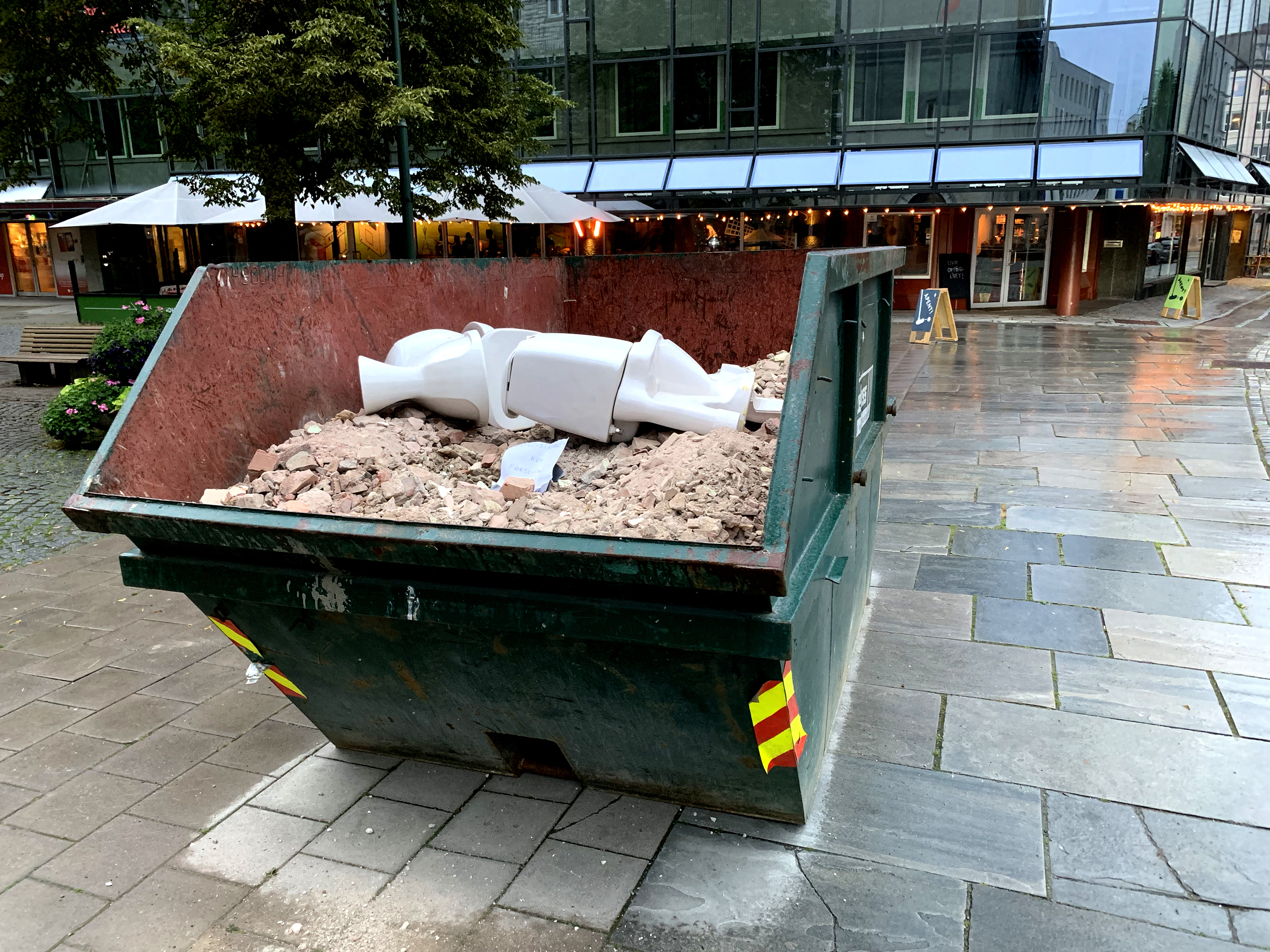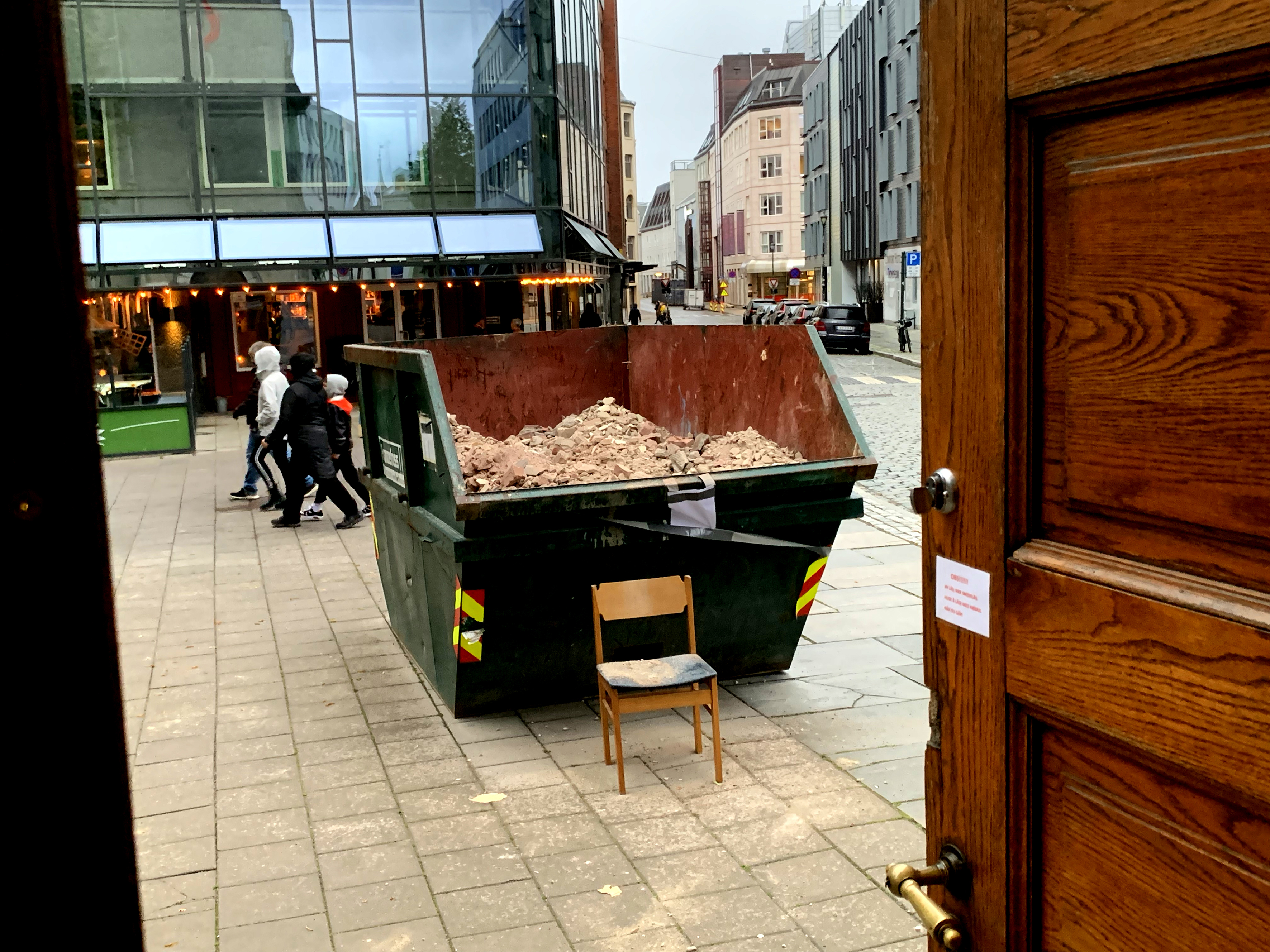I løpet av «mursteinsdugnaden» tirsdag, ble mellom sju og åtte tonn (!) murstein lempet fra kirkekjelleren og kastet i container utenfor kirketrappa! Arne Garborg ville nikket anerkjennende til innsatsen!