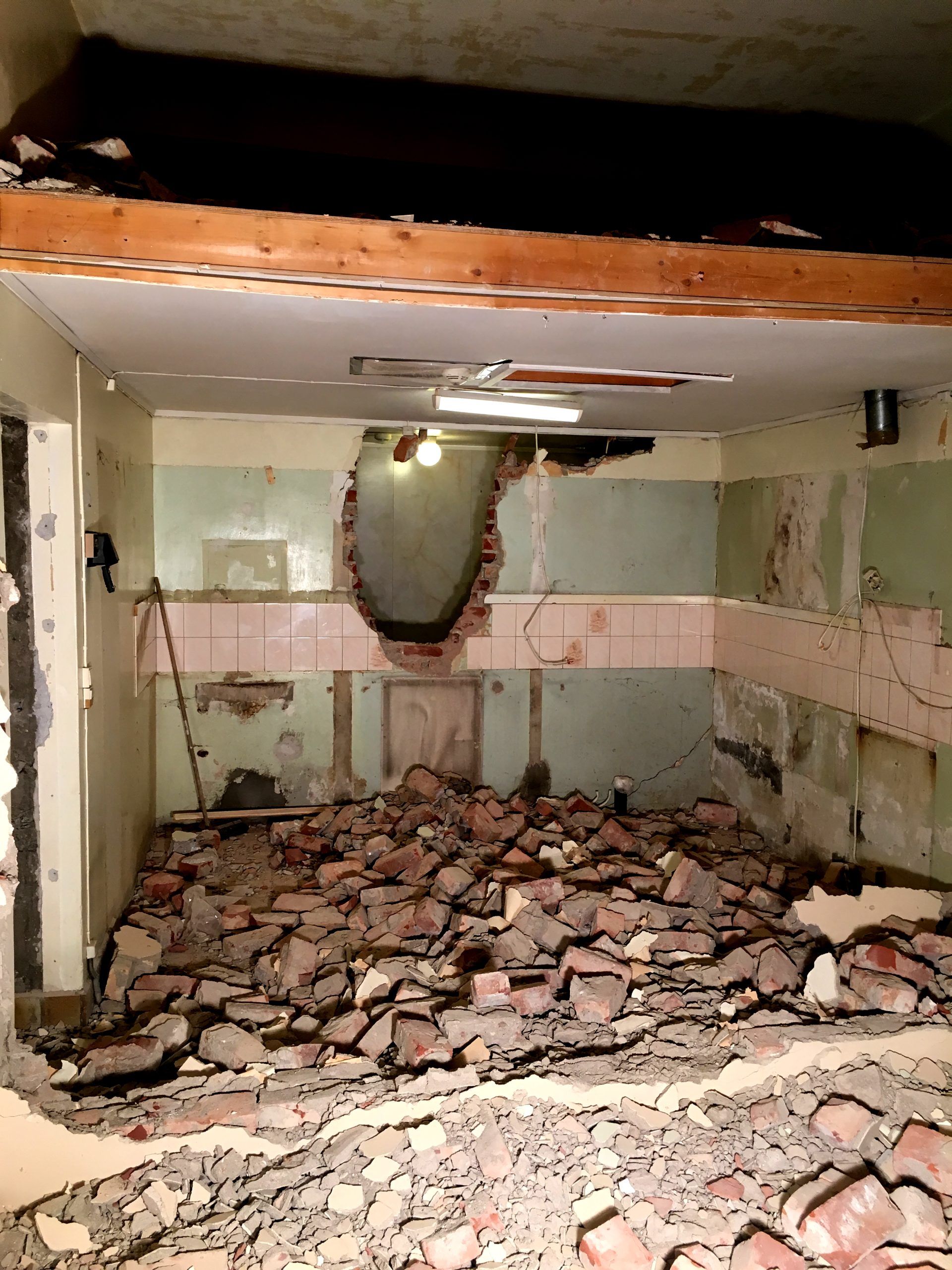 Det var nemlig veldig mye murstein som ventet på å bli fjernet i kirkekjelleren etter at to vegger var revet ned for å gi rom til nytt og større kirkekjøkken. Bøtte etter bøtte etter bøtte ble fylt med murstein, båret opp fra kjelleren og kastet i containeren utenfor kirkedøra. Etter kjempeinnsats var hver bidige murstein fjernet løpet av knapt fire timer!! Og vekta av mursteinen er troverdig ingeniør-beregnet til mellom 7 og 8 tonn!!