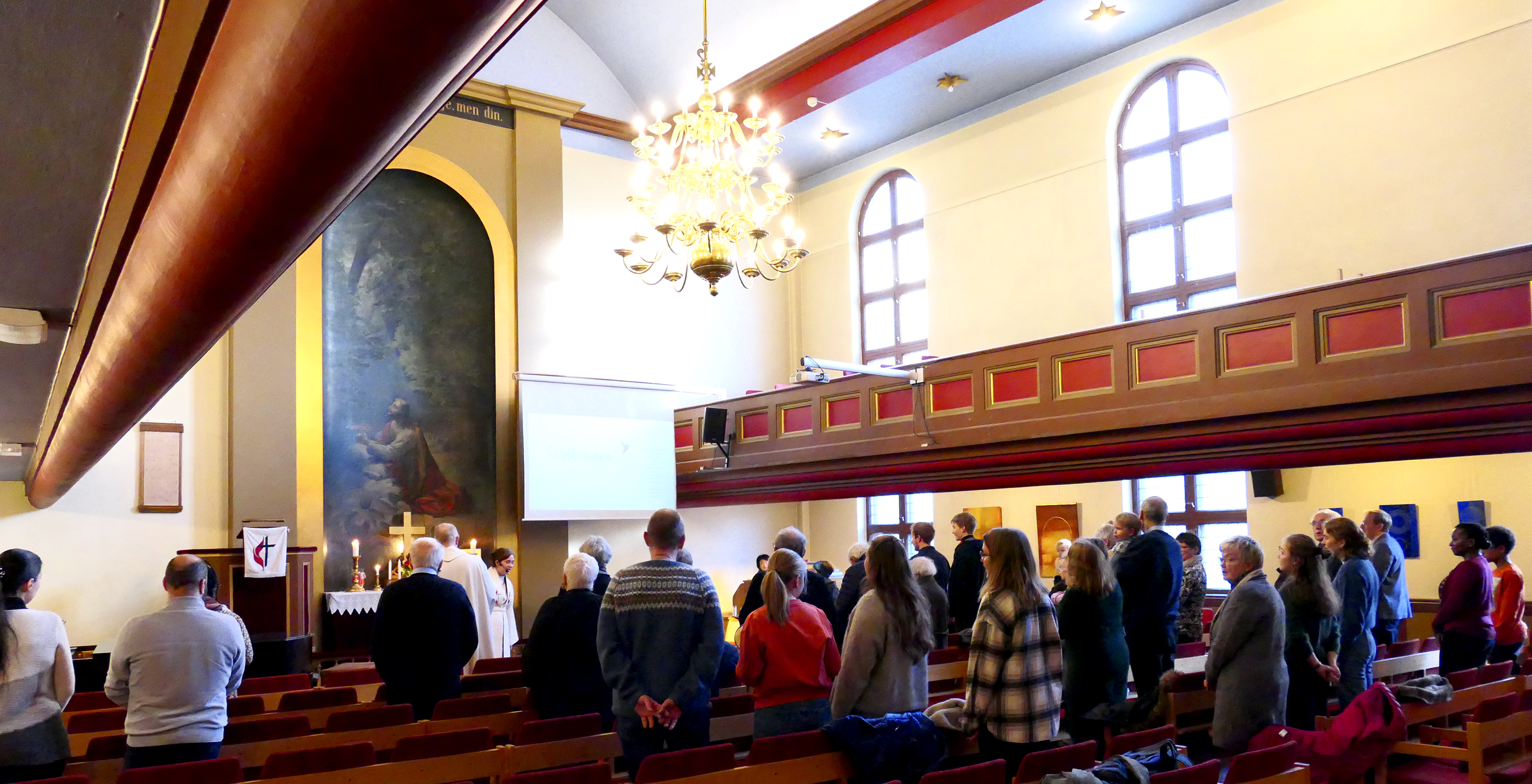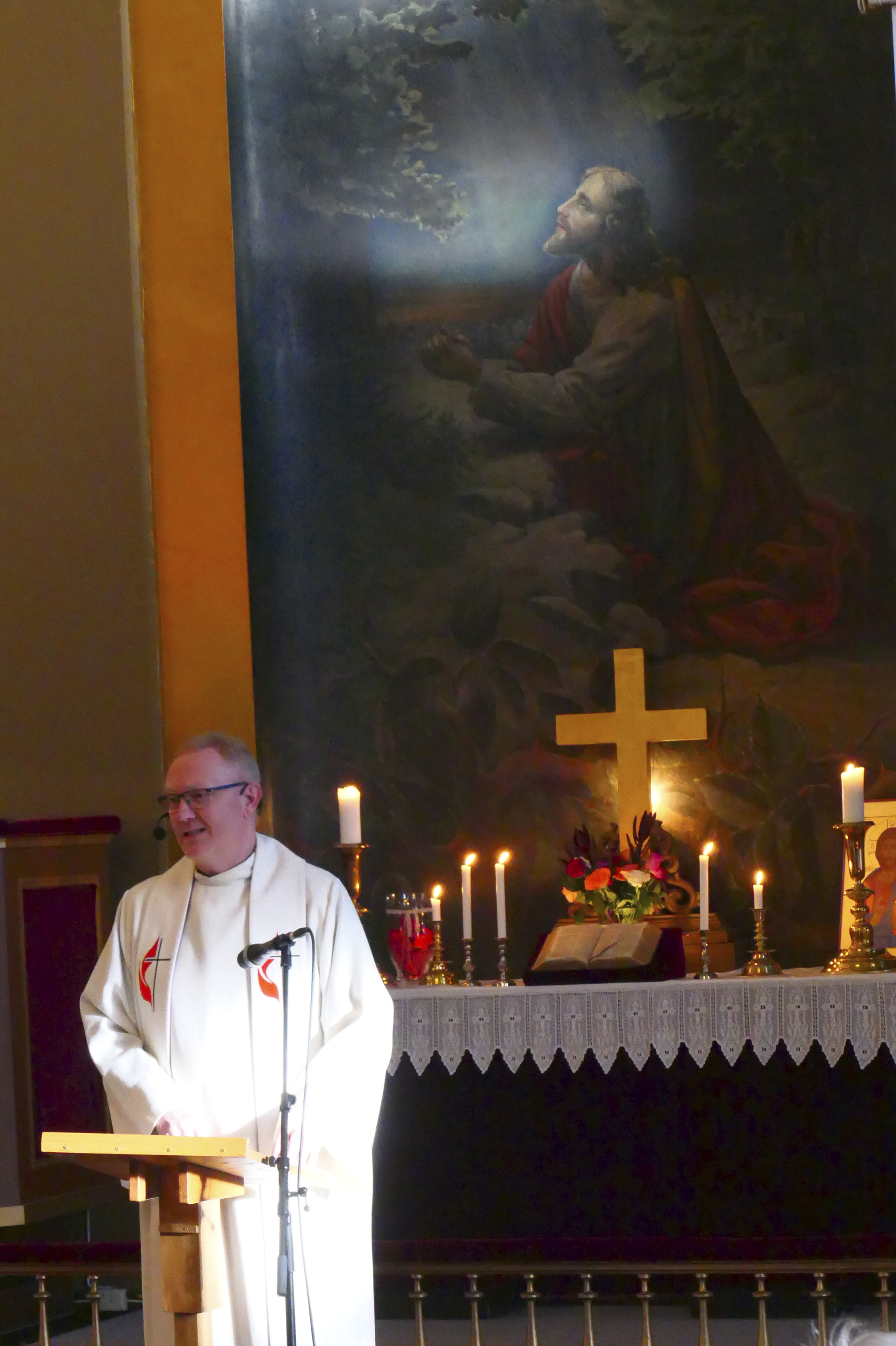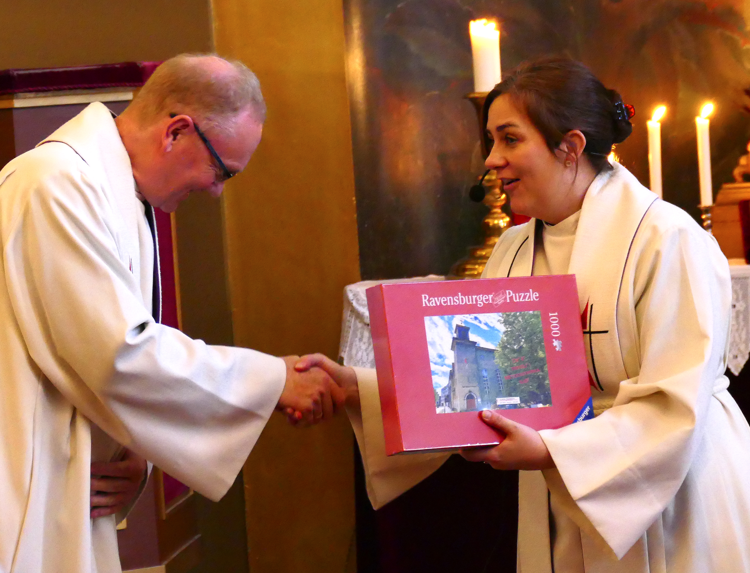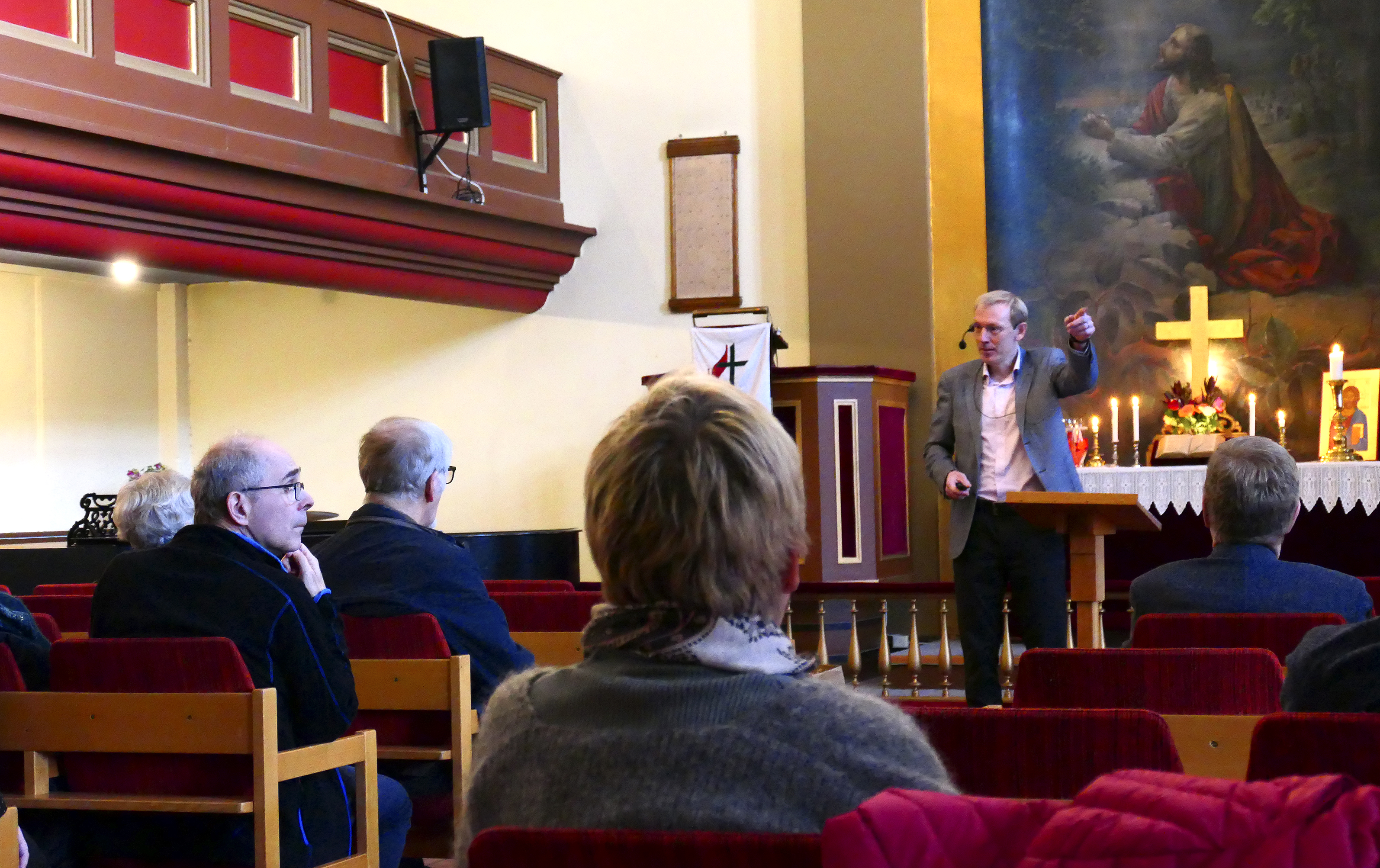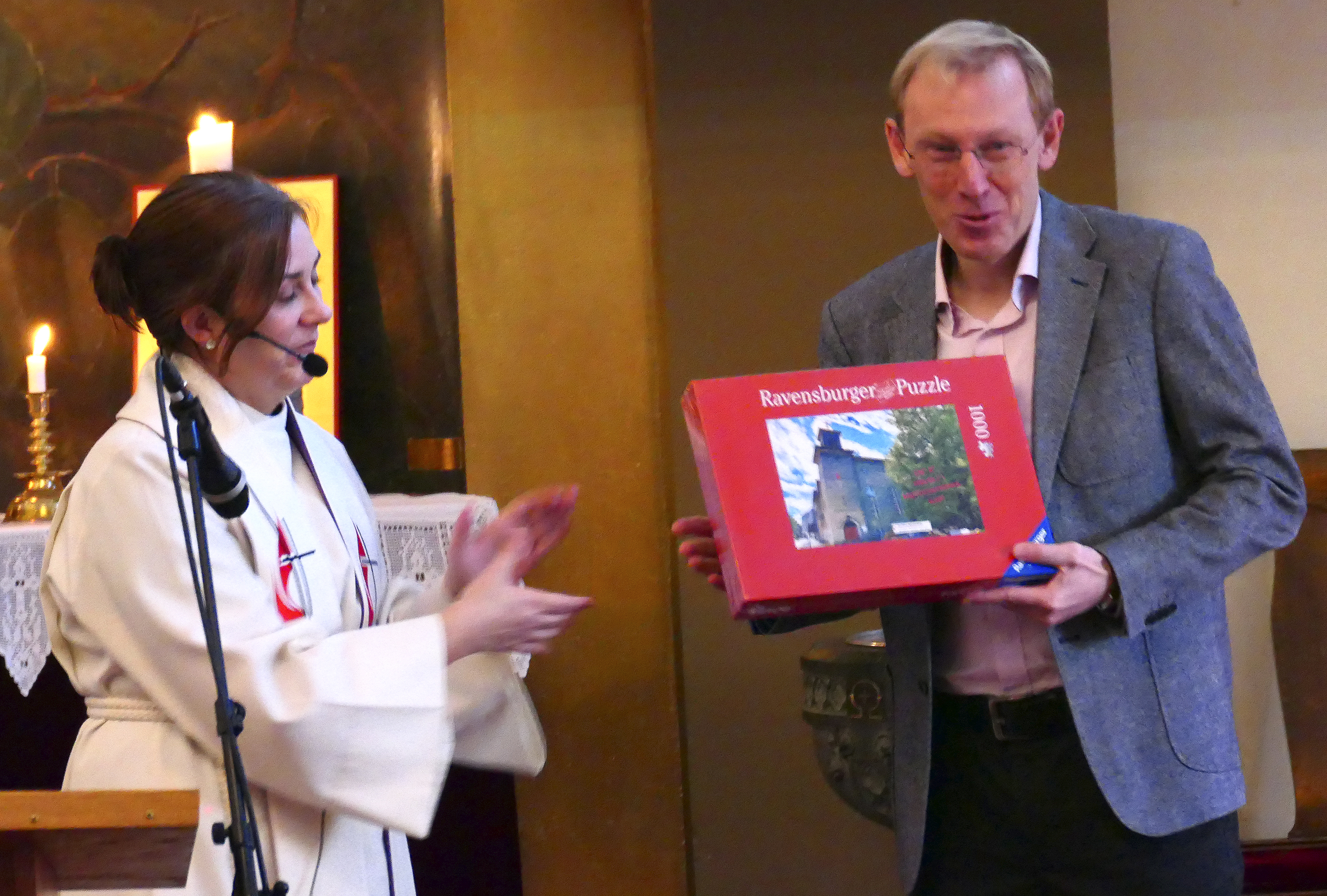 Etter en halvtimes kirkekaffe i kirkesalen, holdt Eystein Mattias Andersen et kåseri med tittelen «140 år med metodistmenighet – hinsides Dovre», Både Eystein og Steinar fikk for øvrig under gudstjenesten overrakt hvert sittg puslespill med Trondheim Metodistkirke i 1000 biter, som takk for besøket og alt de ga oss gjennom jubileumshelga. De lovet vel også å sende oss et bilde når puslespillene var ferdig lagt. Det skal vi nok minne dem på, hvis det drøyer for lenge….