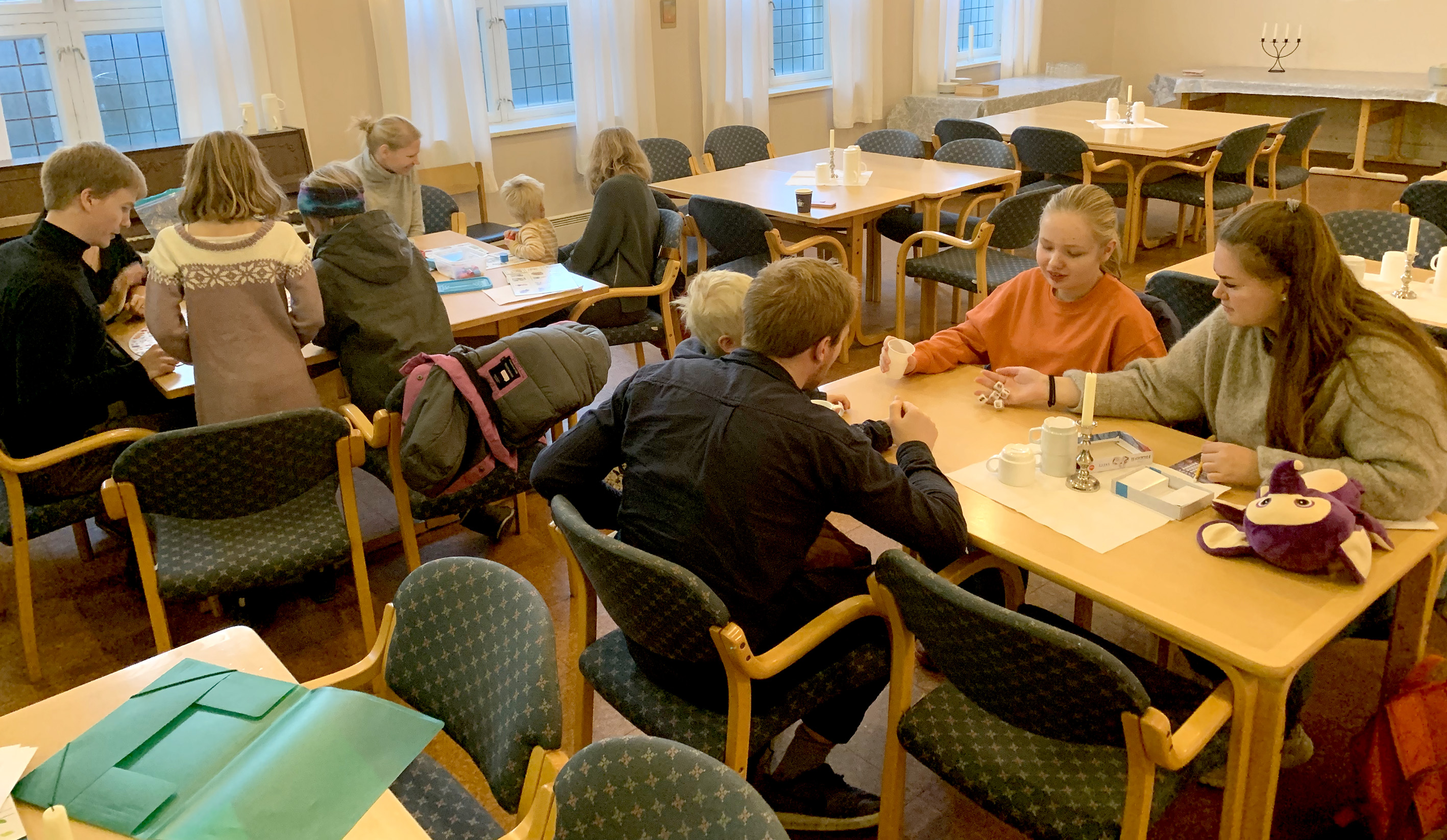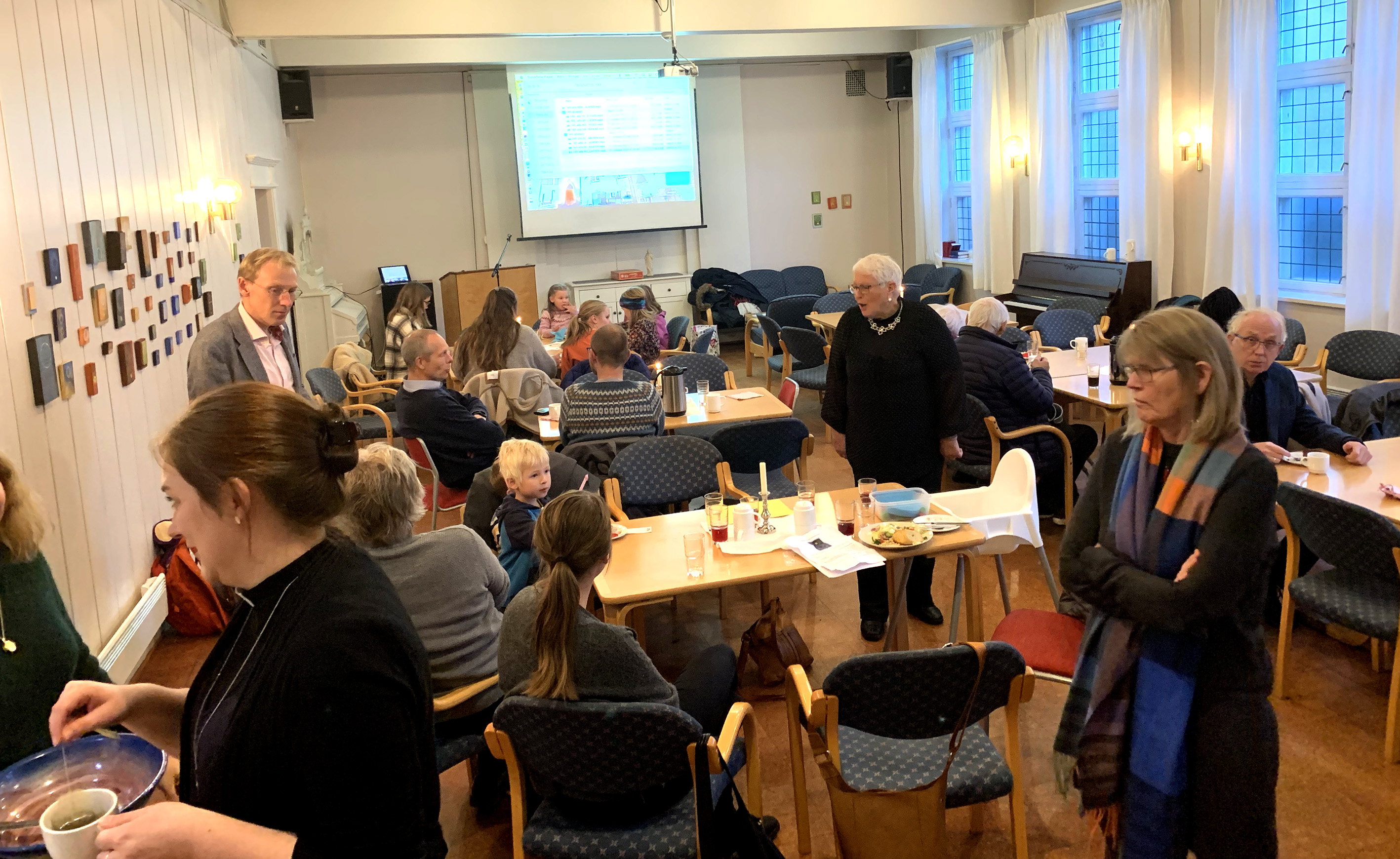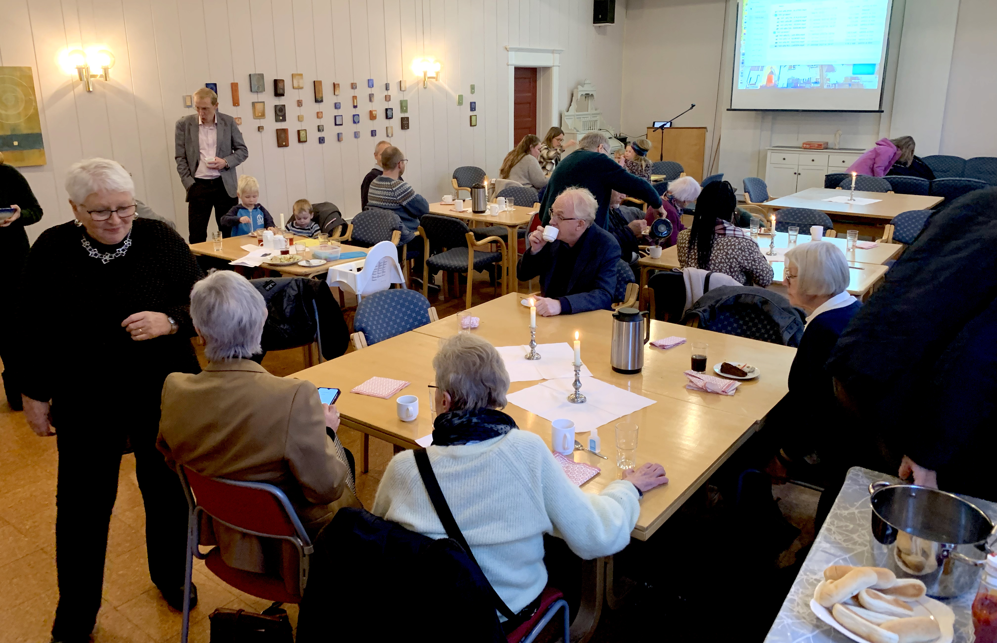Under kåseriet var det eget opplegg (og pølser) for de gledelig mange barna i Wesleysalen, og etter kåseriet gikk alle ned dit til en meget variert og velsmakende «salatlunsj» + kaffe og kaker. Godt jobbet av bevertningskomiteen!