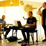 Søndag morgen kom heldigvis det tørre land nok en gang til syne, og vi kunne ferie gudstjeneste med solen flommende inn gjennom vinduene! Pastor Kjell Werner Rødder prekte, og vi hadde flott sang av både en barnegruppe og en ungdomsgruppe. Deler av gudstjenesten hadde form av en bønnevandring, med nattverd og andre «poster» som lystenning, bønnelapper og mulighet til dåpsbekreftelse ved å dyppe et par fingre i vann tegne seg selv med korstegn på pannen.
