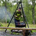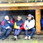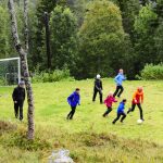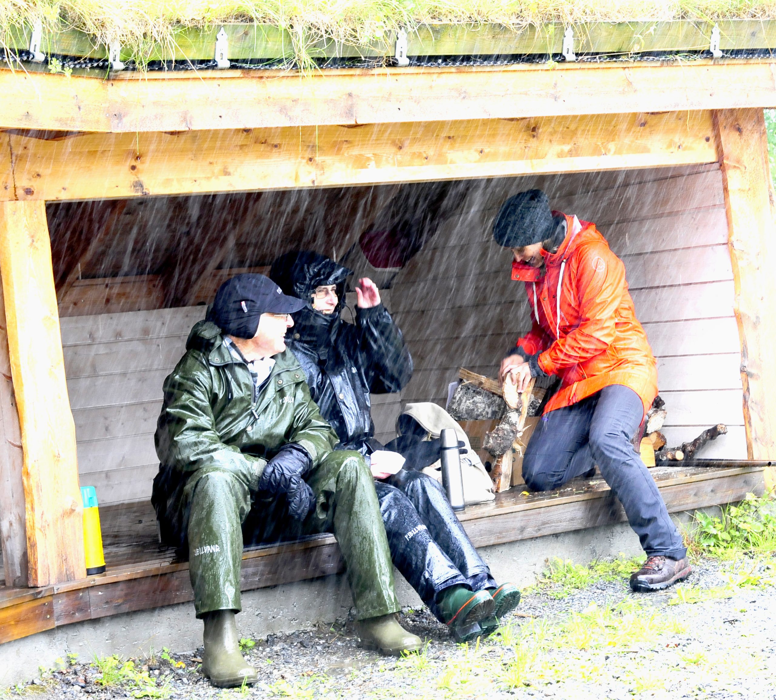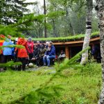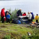 En tømmerlavvo fungerte som arken; der kunne vi sitte delvis tørt og innta lunjsmatpakke, kako, kaffe og te – og de som ville kunne grille matpakka på bål – og det ville mange. Godt smakte det også, selv med brunost! Noen gikk en litt lengere tur enn andre, og noen lekte og noen sparket fotball. Mens det regnet og regnet og regnet.  Men det regnet også flott og godt fellesskap, inspirasjon og mange gode samtaler i tillegg til lek og aktiviteter. Og ingen fulgte innlandsemissærens oppfordring til kystbedehusfolket om å kaste anker i nådens bunnløse hav…