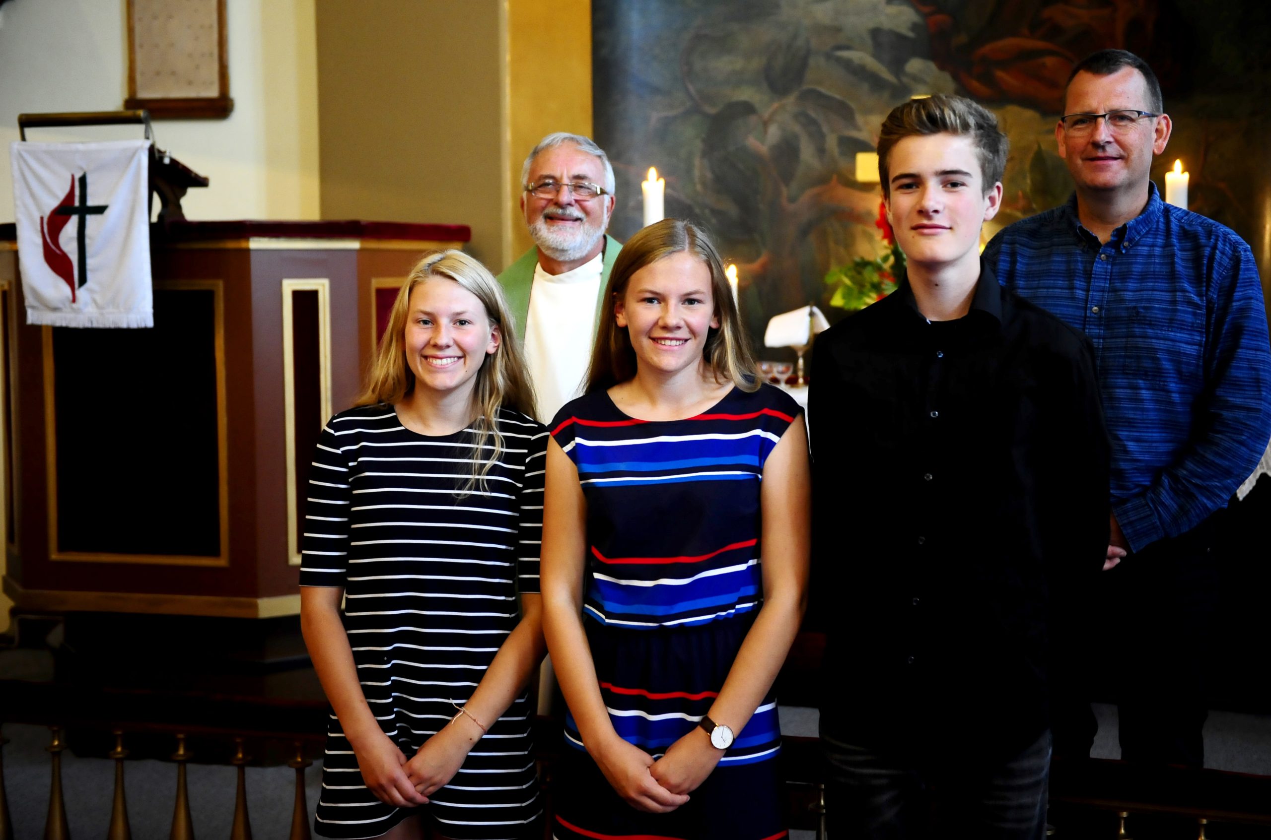 De nye medlemmene i Trondheim menighet og den internasjonale the United Methodist Church, er Hanna Burkeland, Annie Burkeland og Aasmund Nørsett. (På bildet over ser vi foran fra venstre Annie, Hanna og Aasmund. Bak står pastor Kjell W. Rødder og Jon Løvland.)