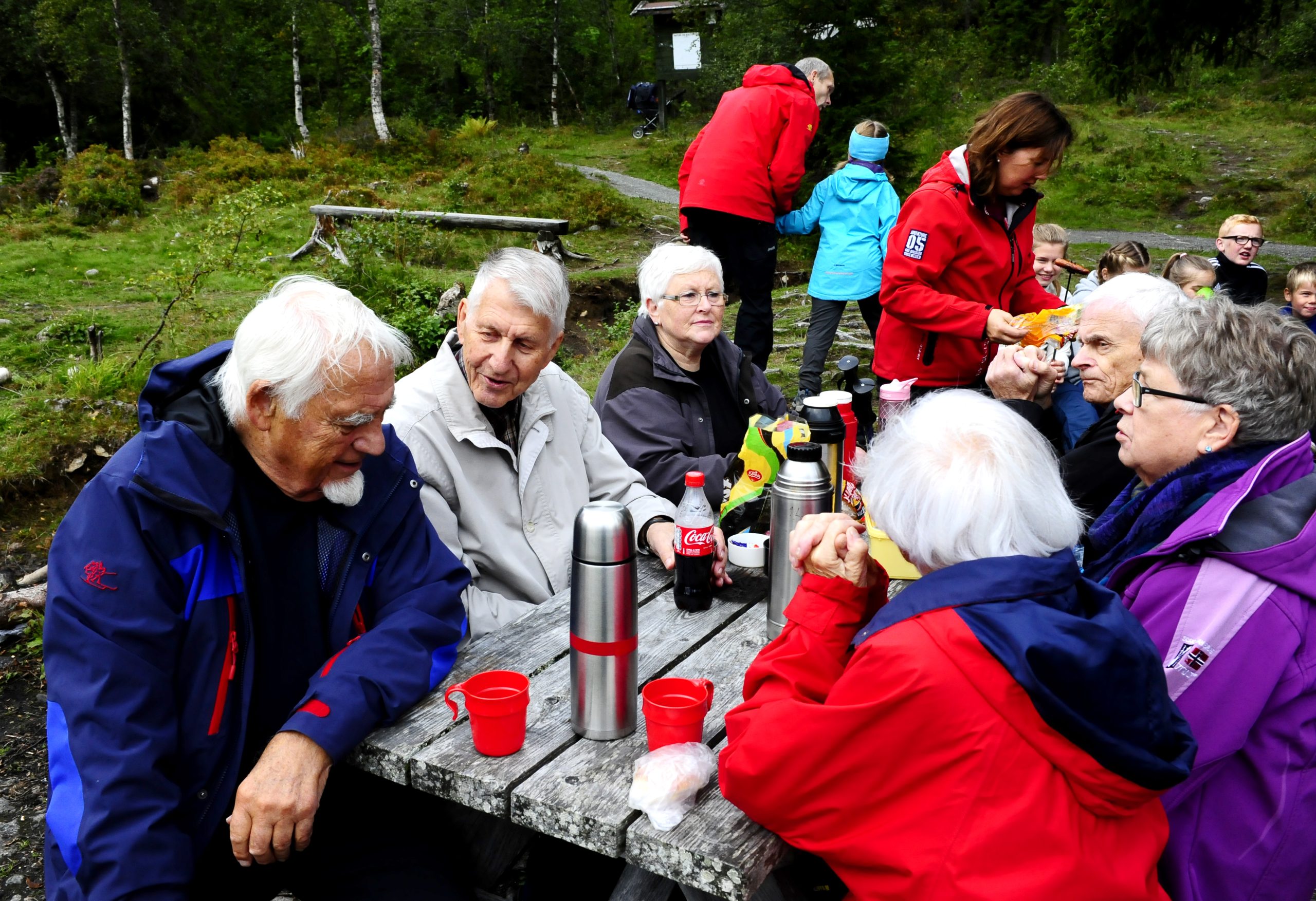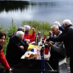 trhumc-søndagstur11Og ettersom det ikke var vanlig gudstjeneste i kirka denne søndagen, ble spreke Peder med oss på tur! Det ble et hjertelig gjensyn, ikke minst med hans jevngamle Trondheimsvenner, Agnes og Bjørge Nilsen.  3 x 88,5 = 265,5 år!! Mye metodisthistorie og -erfaring samlet rundt kaffe og Twist på den bordenden ved Kobberdammen! (Se foto over) Ja, Bjørge hadde båret med seg tørr ved i sekken, og kunne ønske oss andre velkommen til et bål som allerede brant lystig i vannkanten! Spreke, uendelig trofaste metodister, rollemodeller og forbilder!
