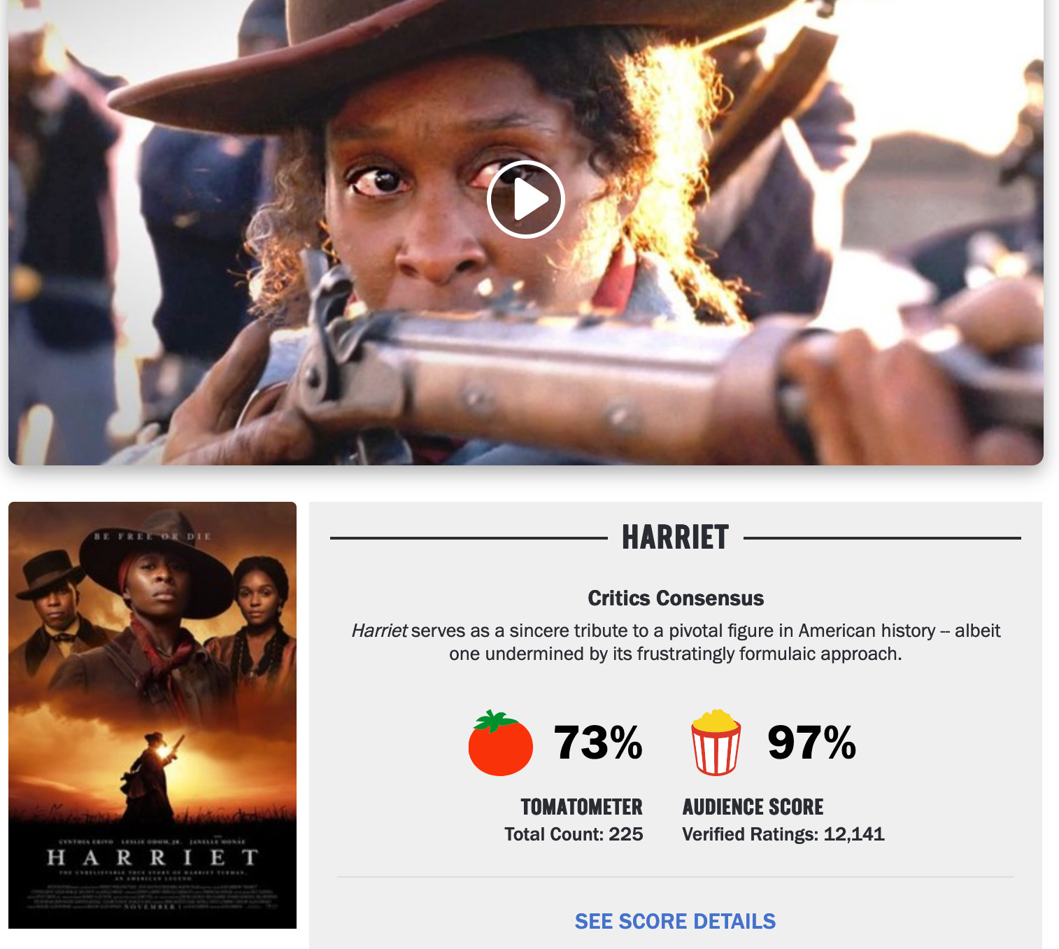 «Harriet» har blant annet 97% publikumsscore på filmnettstedet Rotten Tomatoes. Filmen oppnådde også A+ på CinemaScore, noe bare 56 filmer har klart på denne siden av tusenårsskiftet. Filmen har siden premieren 1. november 2019, spilt inn ca 43,3 millioner dollar ( ca 373 millioner norske kroner ) – mens den kostet ca. 145 millioner kroner å produsere. Et klart overskuddsprosjekt, med andre ord. Under kan du se traileren for filmen, og høre det flotte tittelsporet fra soundtracket.
