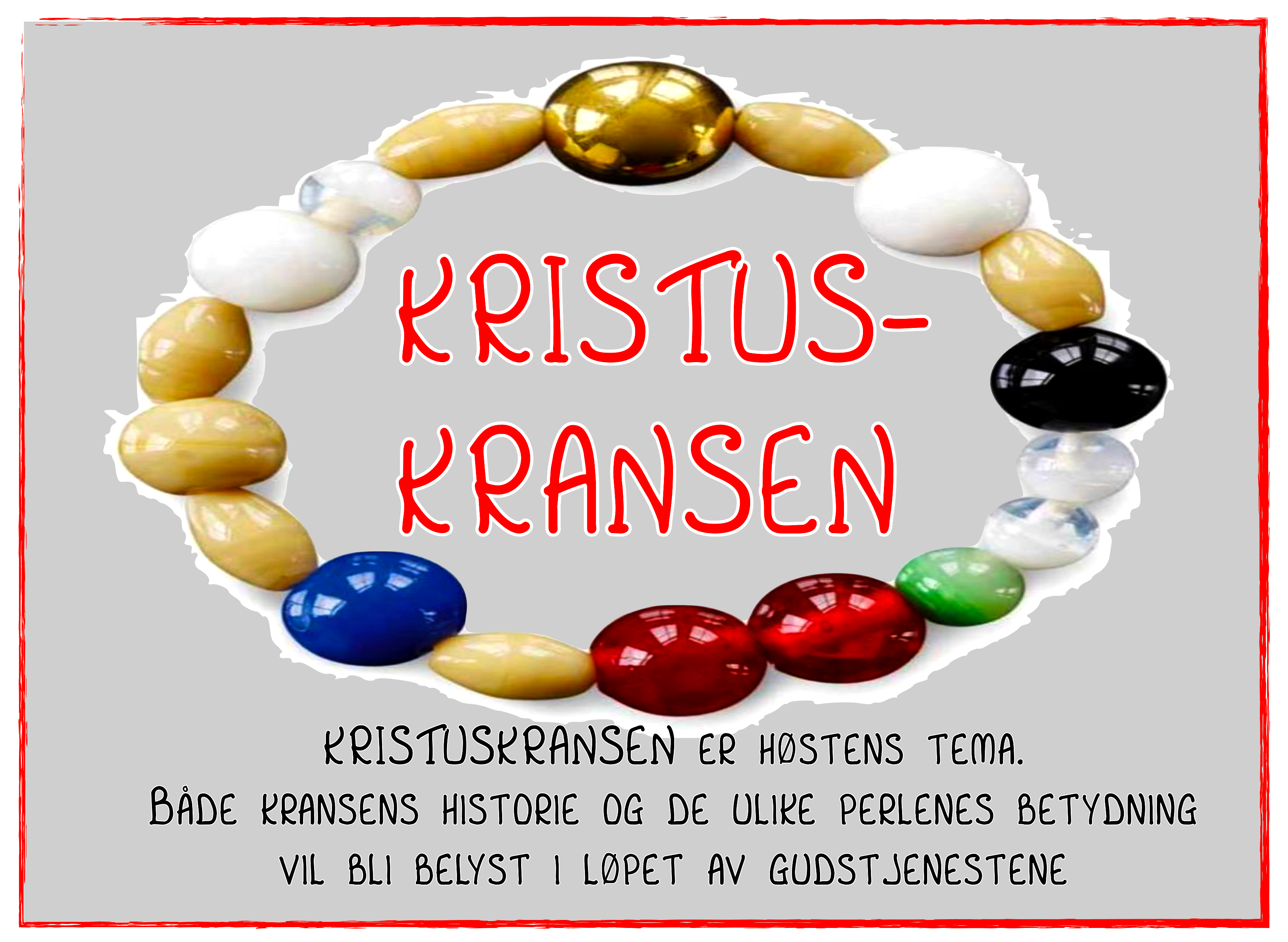 I løpet av høsten skal vi alstå sammen se nærmere på Kristuskransen og hvordan den kan være til hjelp i hverdagslivet både for den enkelte og for menighetsfellesskapet vårt.Kristuskransen er et perlearmbånd som har fokus på forskjellige sider i det kristne livet og troen vår. Har du allerede en egen Kristuskrans, kan du med fordel ta den med til gudstjenestene i høst.Ønsker du en egen Kristuskrans, kan du ta kontakt med presten.