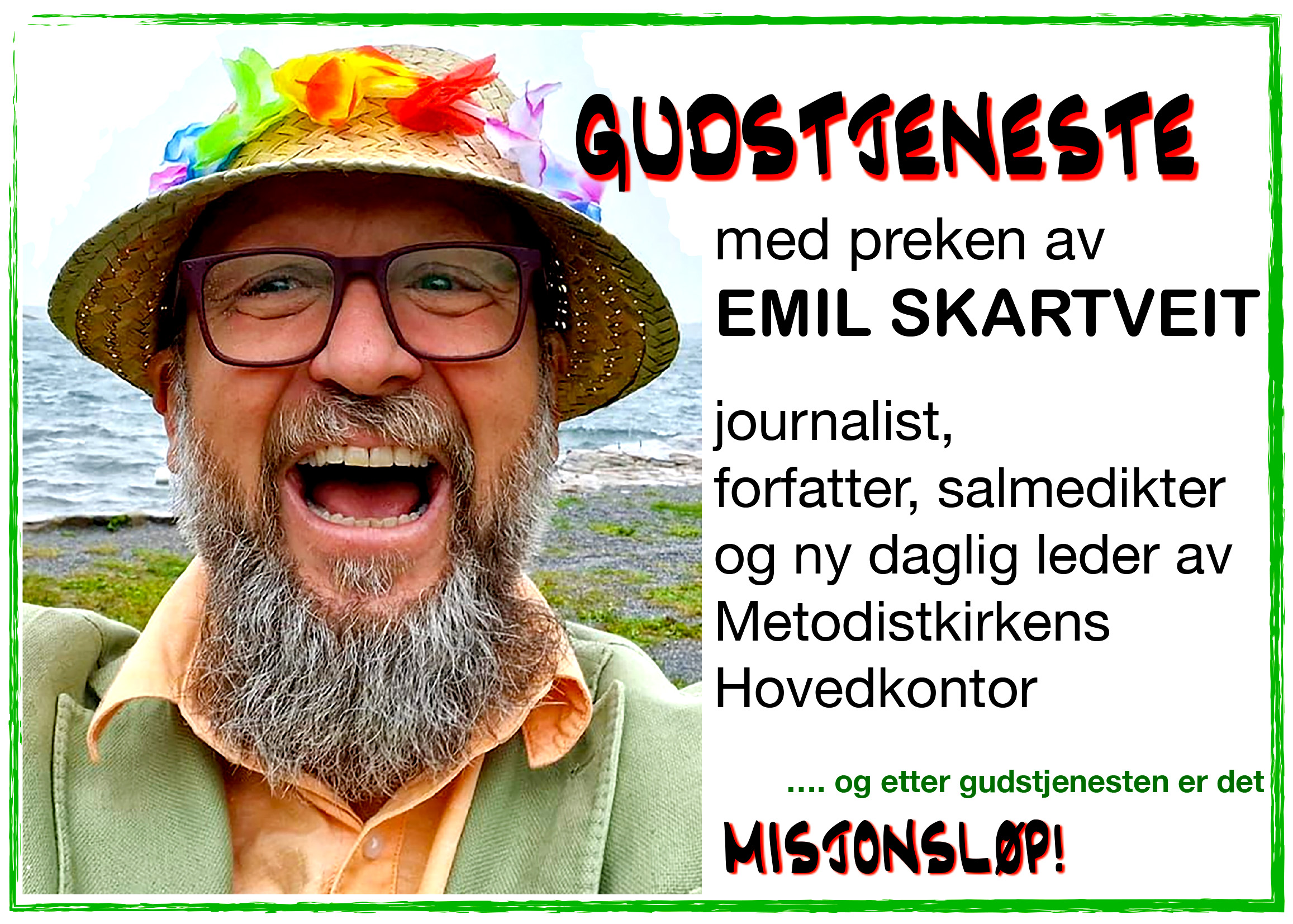 Søndag 2. oktober kl. 11.00 er du hjertelig velkommen til gudstjeneste. Vi får besøk av den nye daglige lederen ved Metodistkirkens Hovedkontor, EMIL SKARTVEIT. Hans preken har tema: «Å elske din neste som deg selv». Emil er oppvokst i Frelsesarmeen, og har selv vært offiser der. Men han kom til jobben i Metodistkirken fra stillingen som daglig leder i Fredrikstad Domkirke. Emil er en så allsidig og kreativ person at vi i stedet for å ramse opp, henviser til denne linken: https://no.wikipedia.org/wiki/Emil_Skartveit