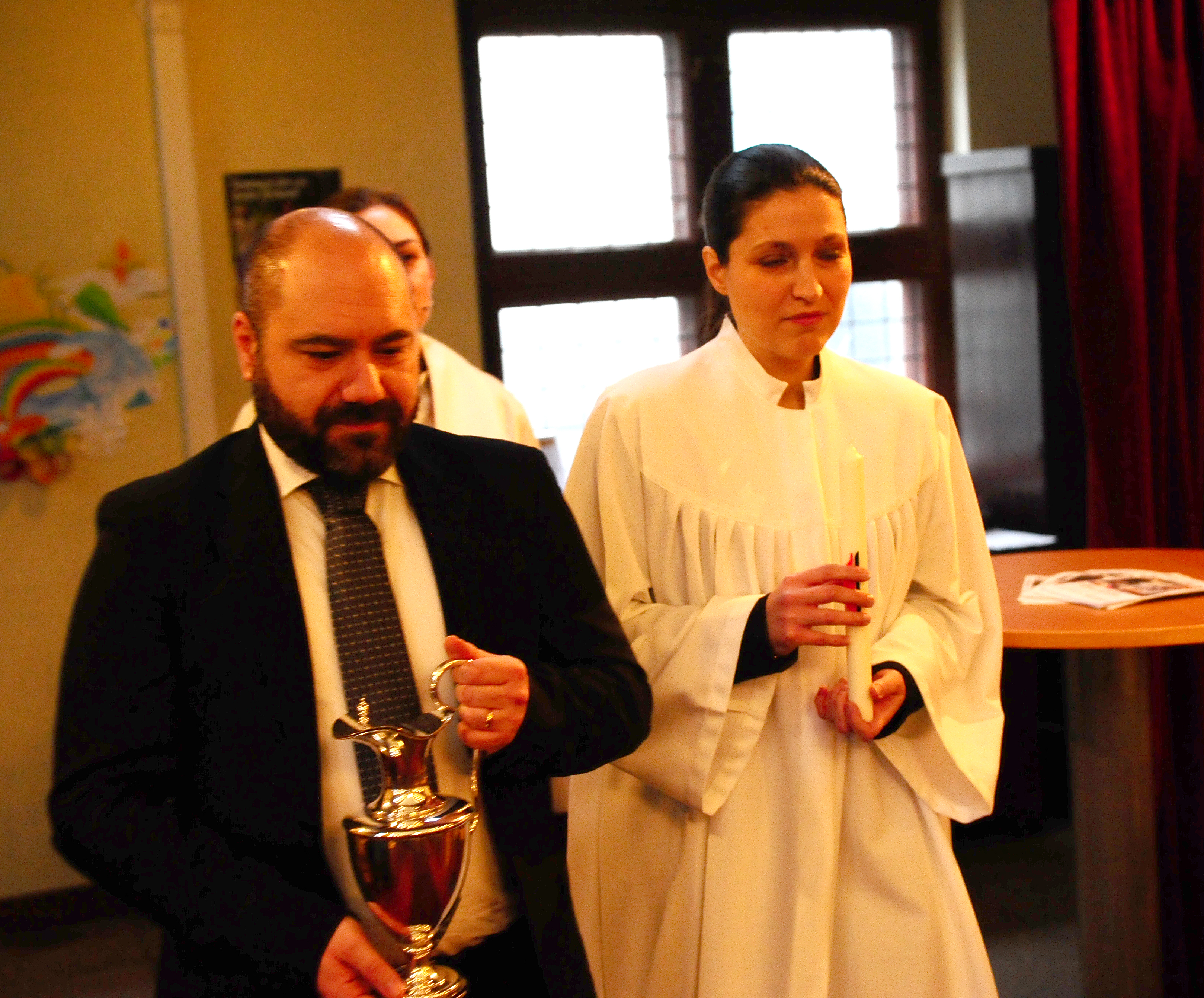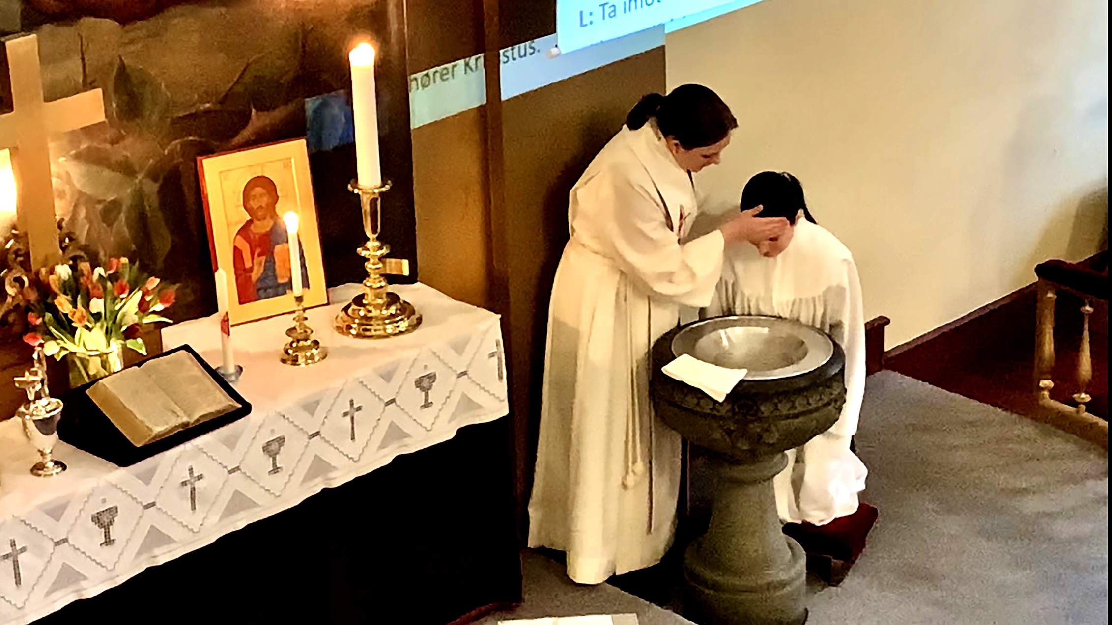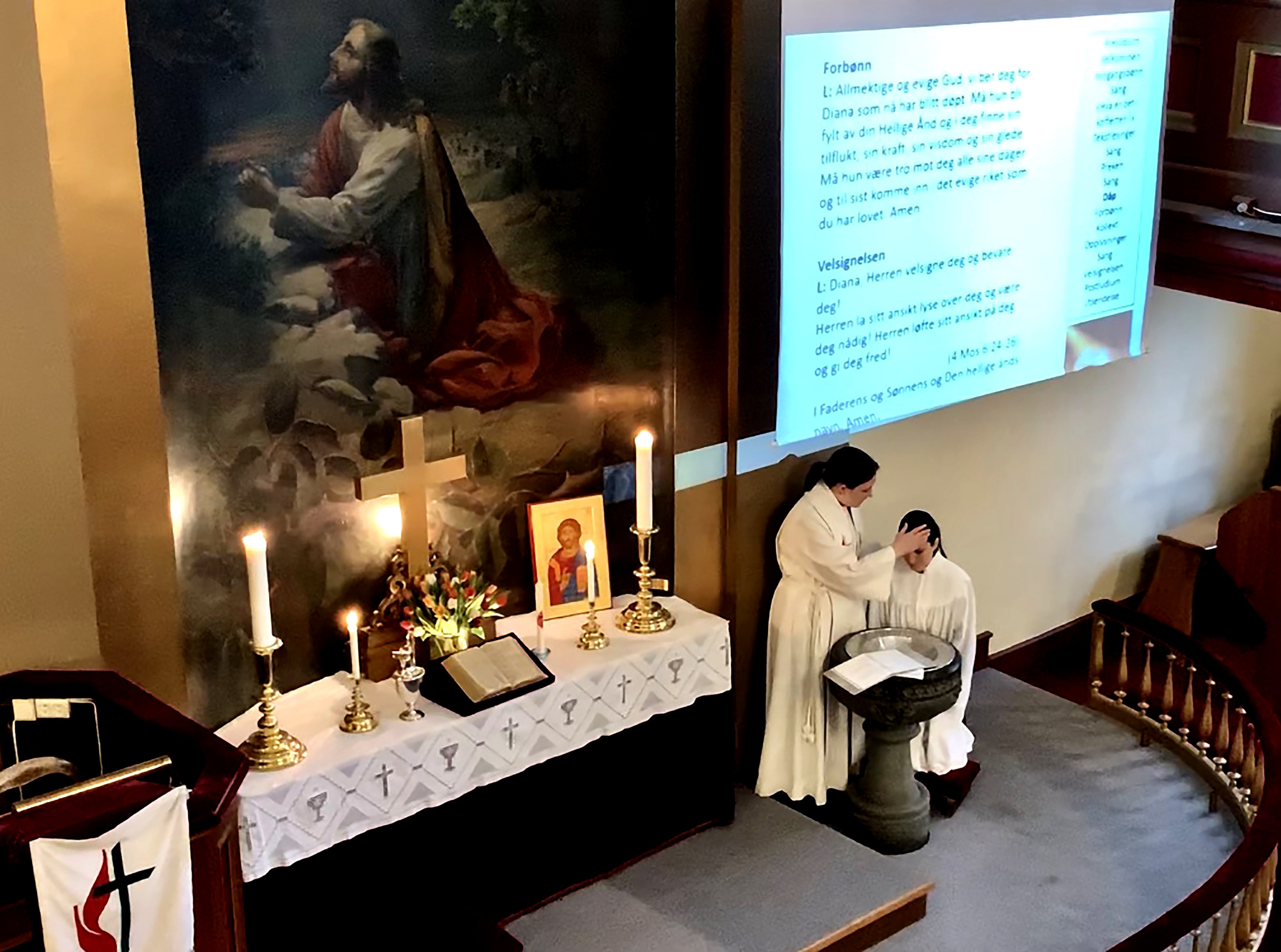 Gudstjenesten ble innledet med en liten prosesjon hvor dåpskandidaten Diana Di Giampaolo under preludiet gikk sammen med sin ektemann Paolo Pisciella og pastor Christina Thaarup. Diana bar dåpslyset, og Paolo kannen med dåpsvannet. Dåpen fant sted mot slutten av gudstjenesten. I dåpsritualet bekreftet Diana sin kristne tro før hun knelte ved døpefonten og ble døpt og velsignet av pastor Christina. Sterkt og flott! Hjemmesidens referent er jo ikke akkurat kjent for hyppig bruk av «hallelujah», men tar altså sjansen på å bruke årskvoten allerede før januar er omme! Etter dåpshandlingen sang vi, etter Dianas ønske, salmen «Nærmere deg min Gud».