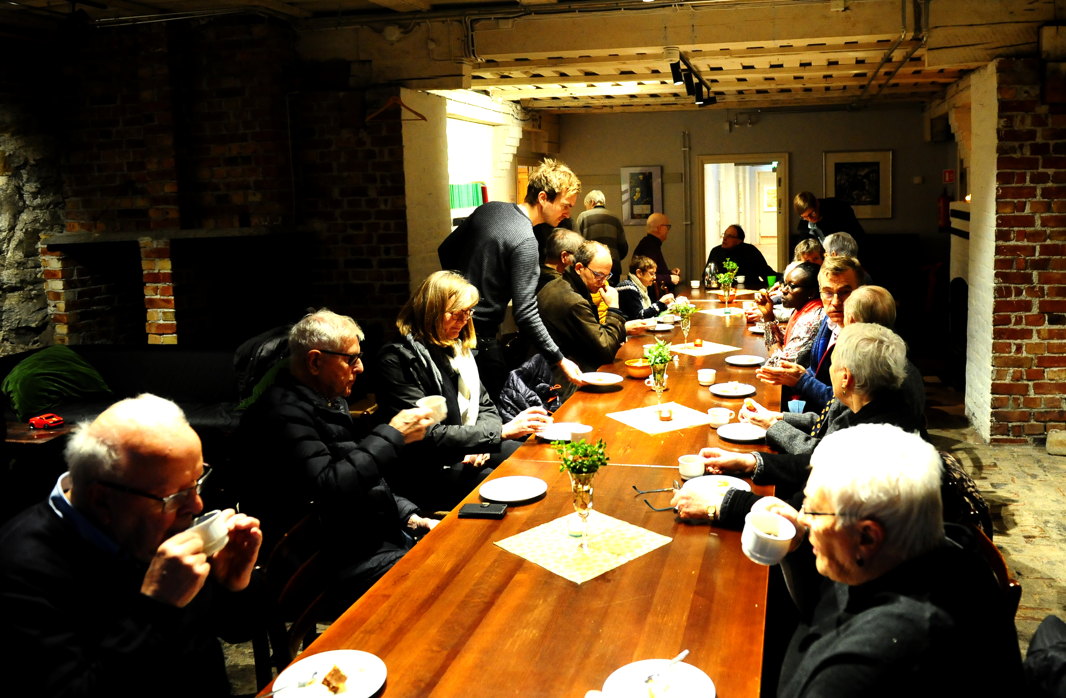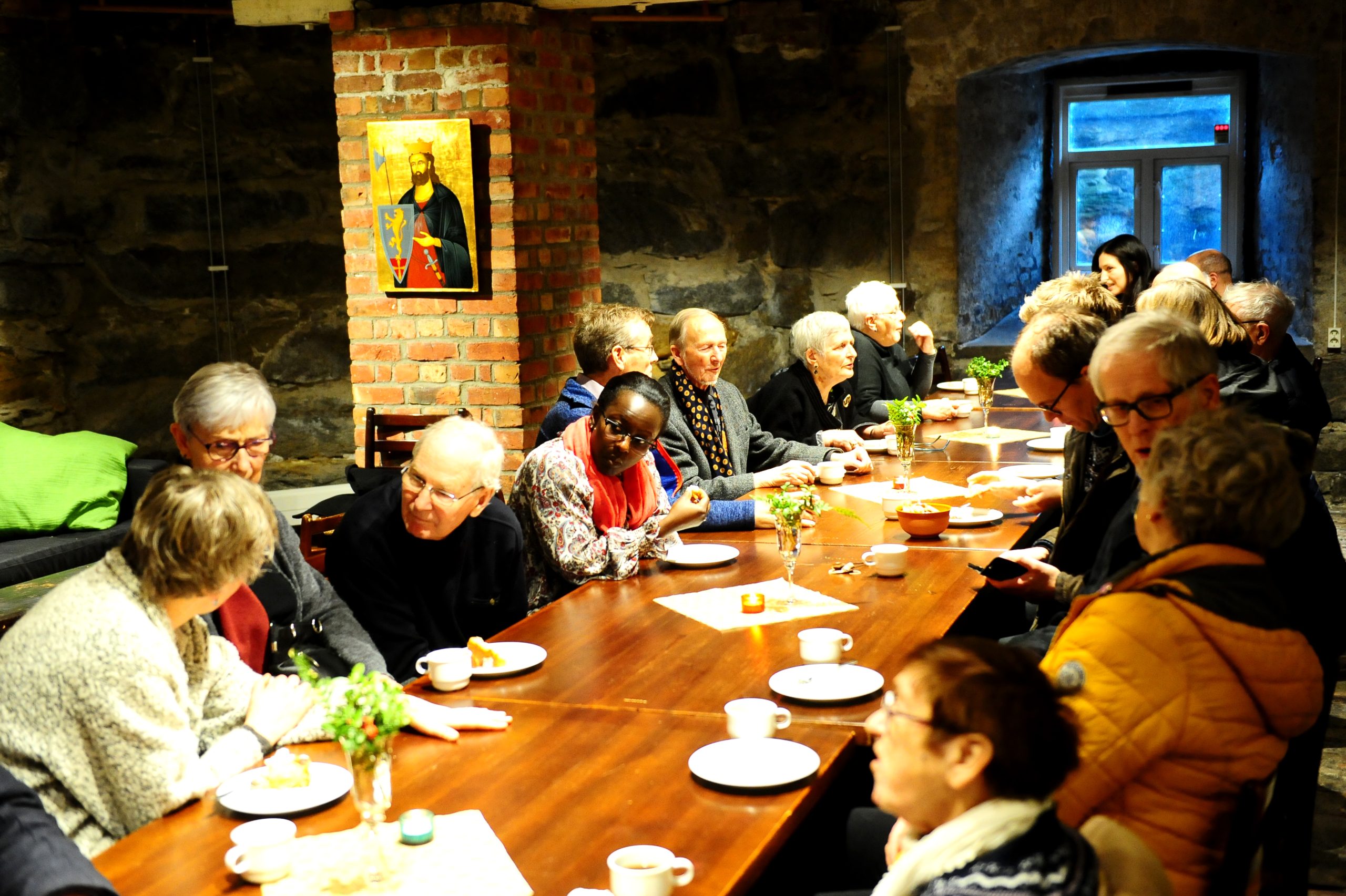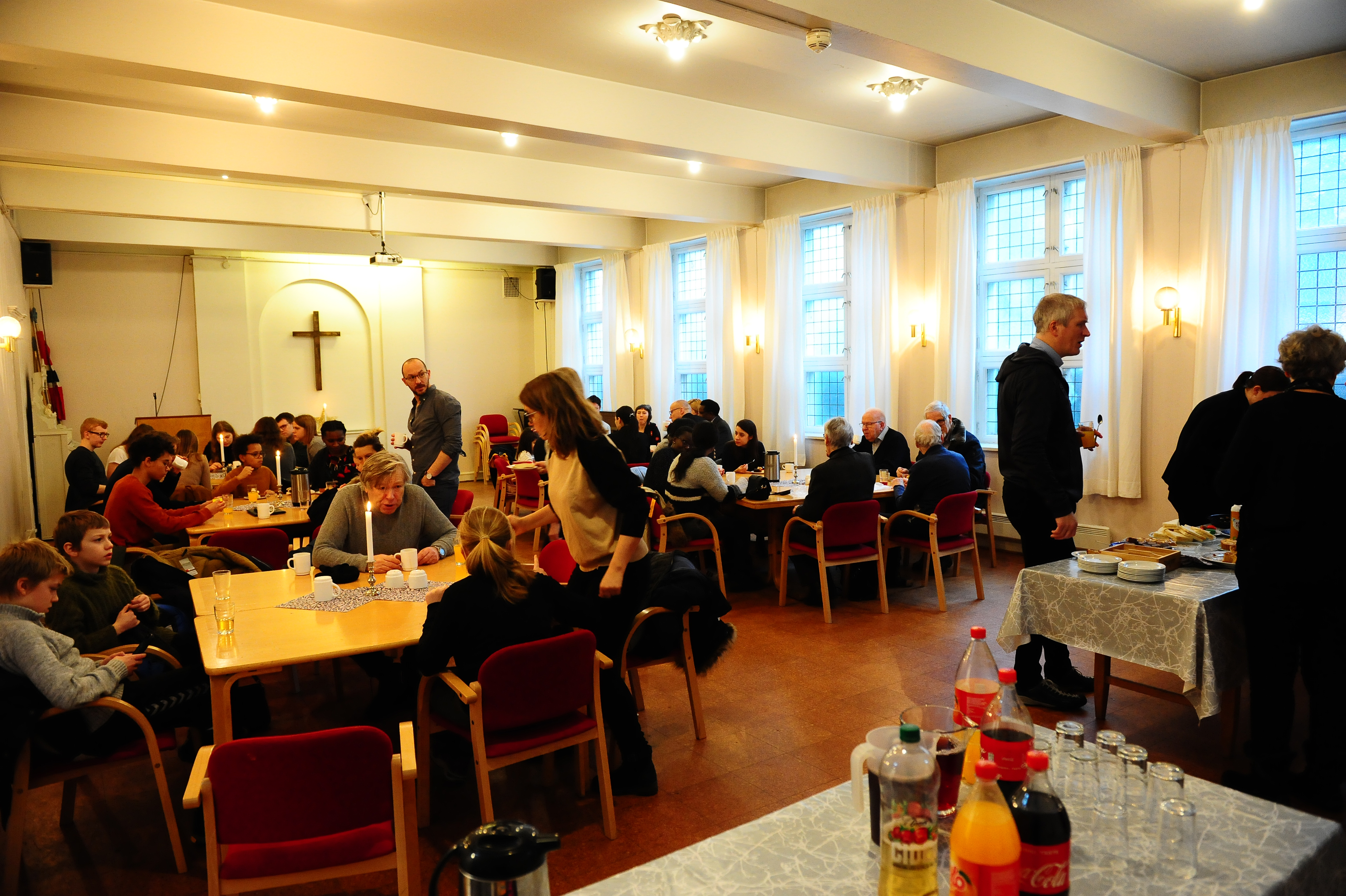 Etter høymessen var det sosial samling nede i Ilen kirkes vakre og stemningsfulle kirkekjeller. Det var ingen mangel på kaffe, og praten gikk livlig mellom lutheranere og metodister. Et nådens fellesskap. Neste år kommer Ilen-folka til oss, og vi gleder oss allerede.