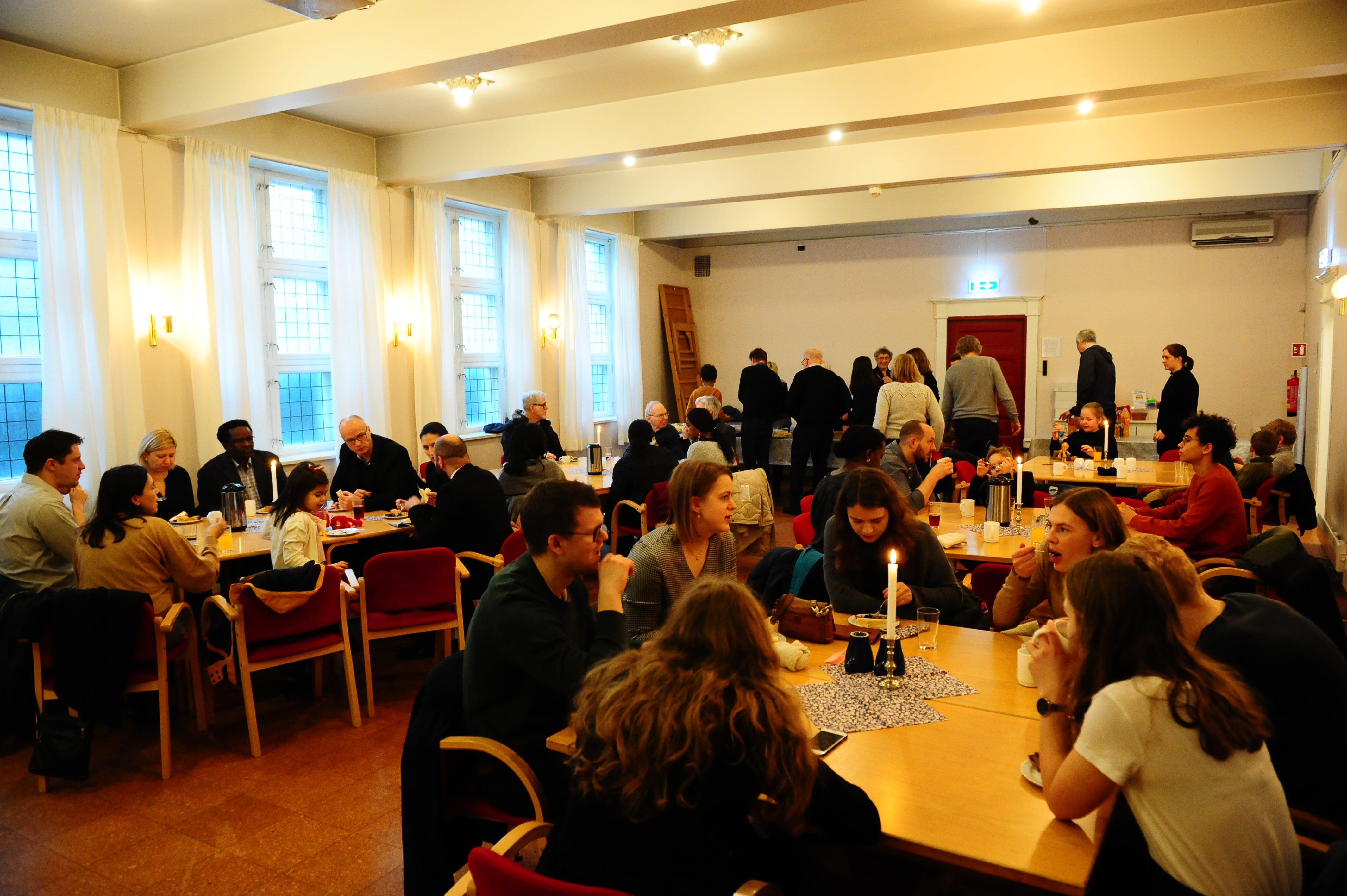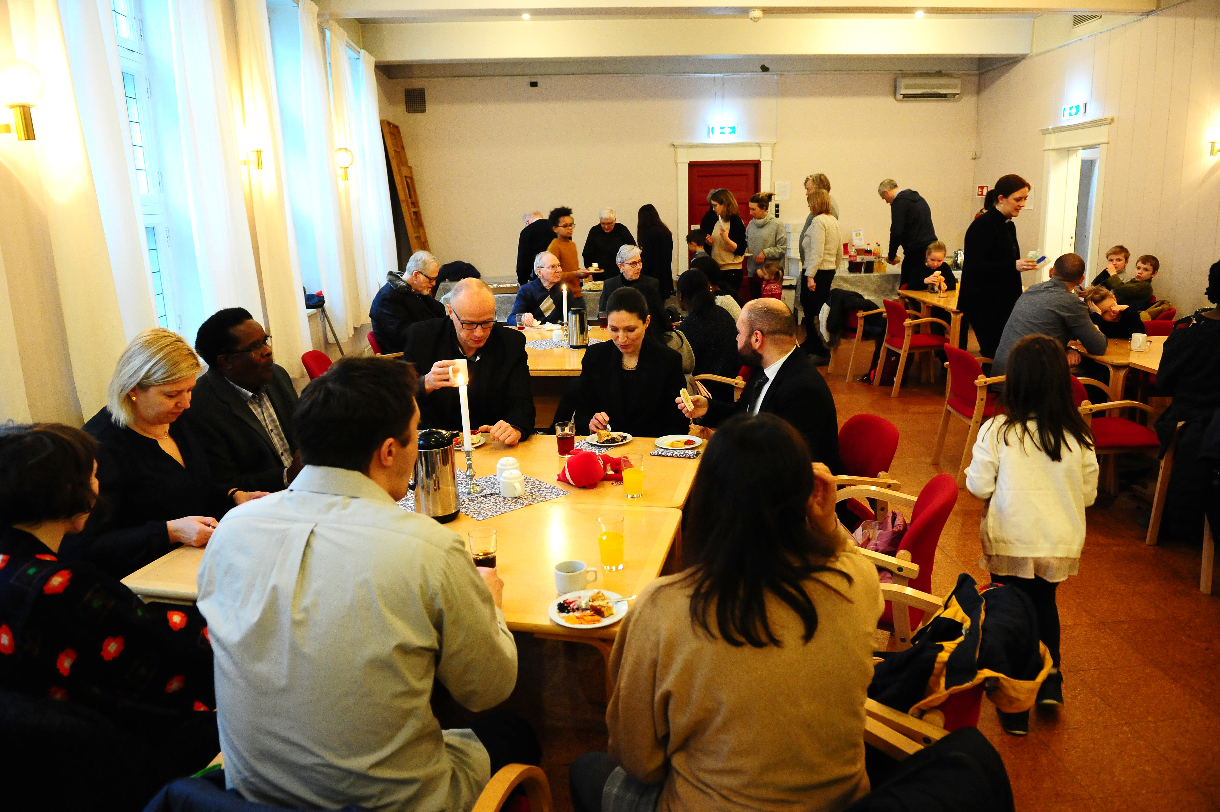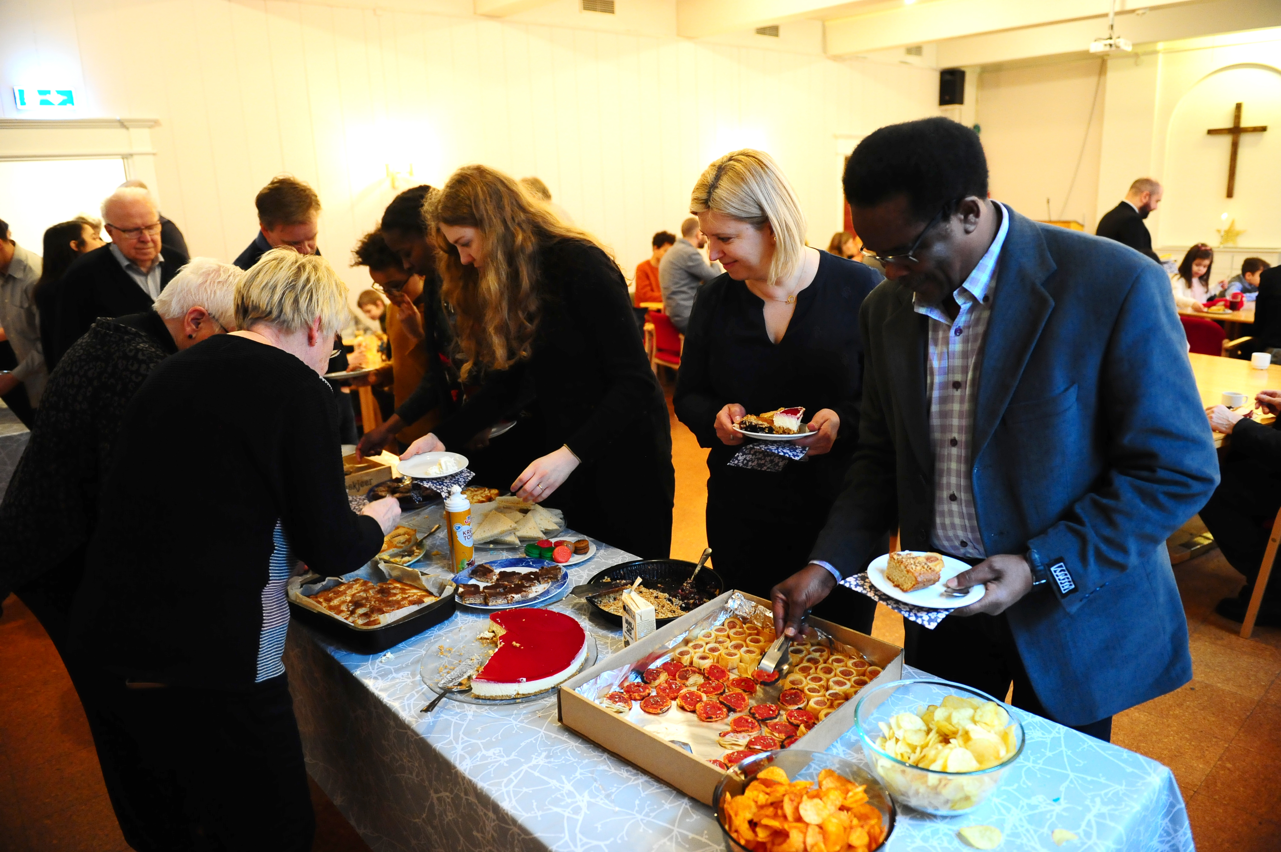 Etter høymessen var det sosial samling nede i Ilen kirkes vakre og stemningsfulle kirkekjeller. Det var ingen mangel på kaffe, og praten gikk livlig mellom lutheranere og metodister. Et nådens fellesskap. Neste år kommer Ilen-folka til oss, og vi gleder oss allerede.