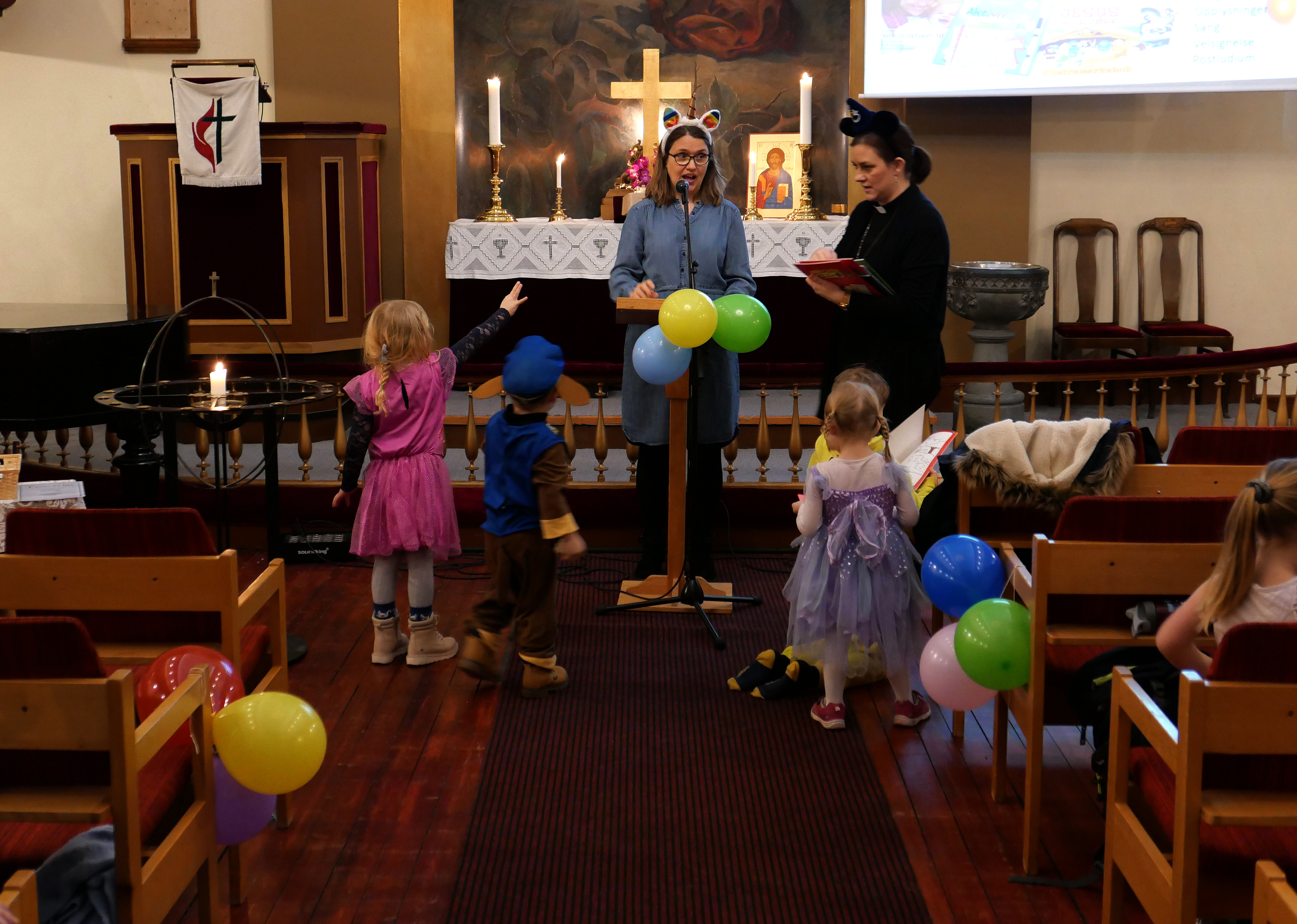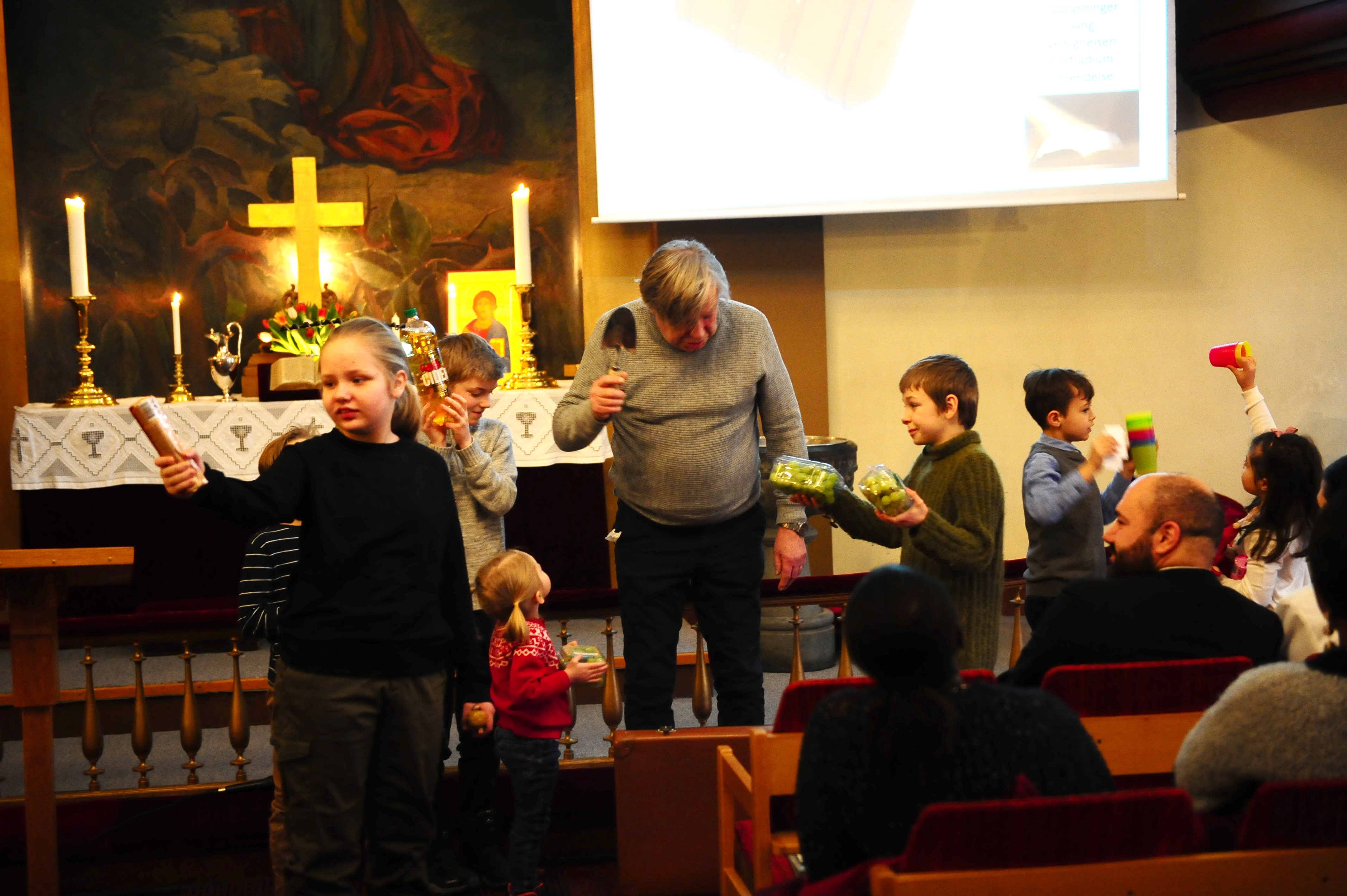 Som et «eksperiment» startet karnevalsgudstjenesten kl. 16.00. Det er vanskelig ( og meningsløst ) å trekke en konklusjon etter én gang. Vi nøyer oss med å konstatere at frammøtet var omtrent på snittet – men med betydelig flere barn enn vanlig. Og alle barna fikk med seg en bok fra kirken. Det var nemlig bokutdeling til alle dåpsbarn fra de siste 15 årene – og andre barn som var tilstede.