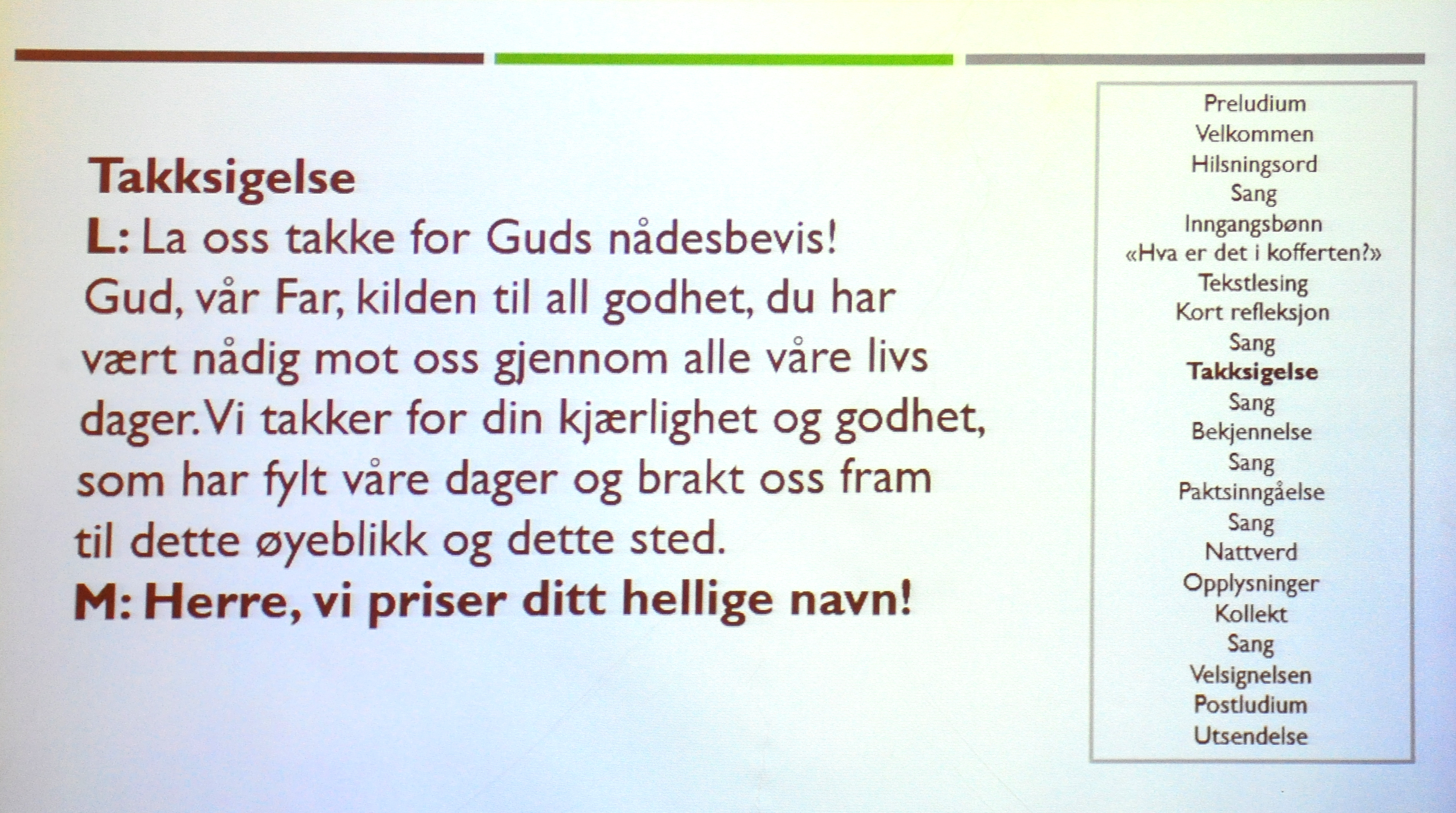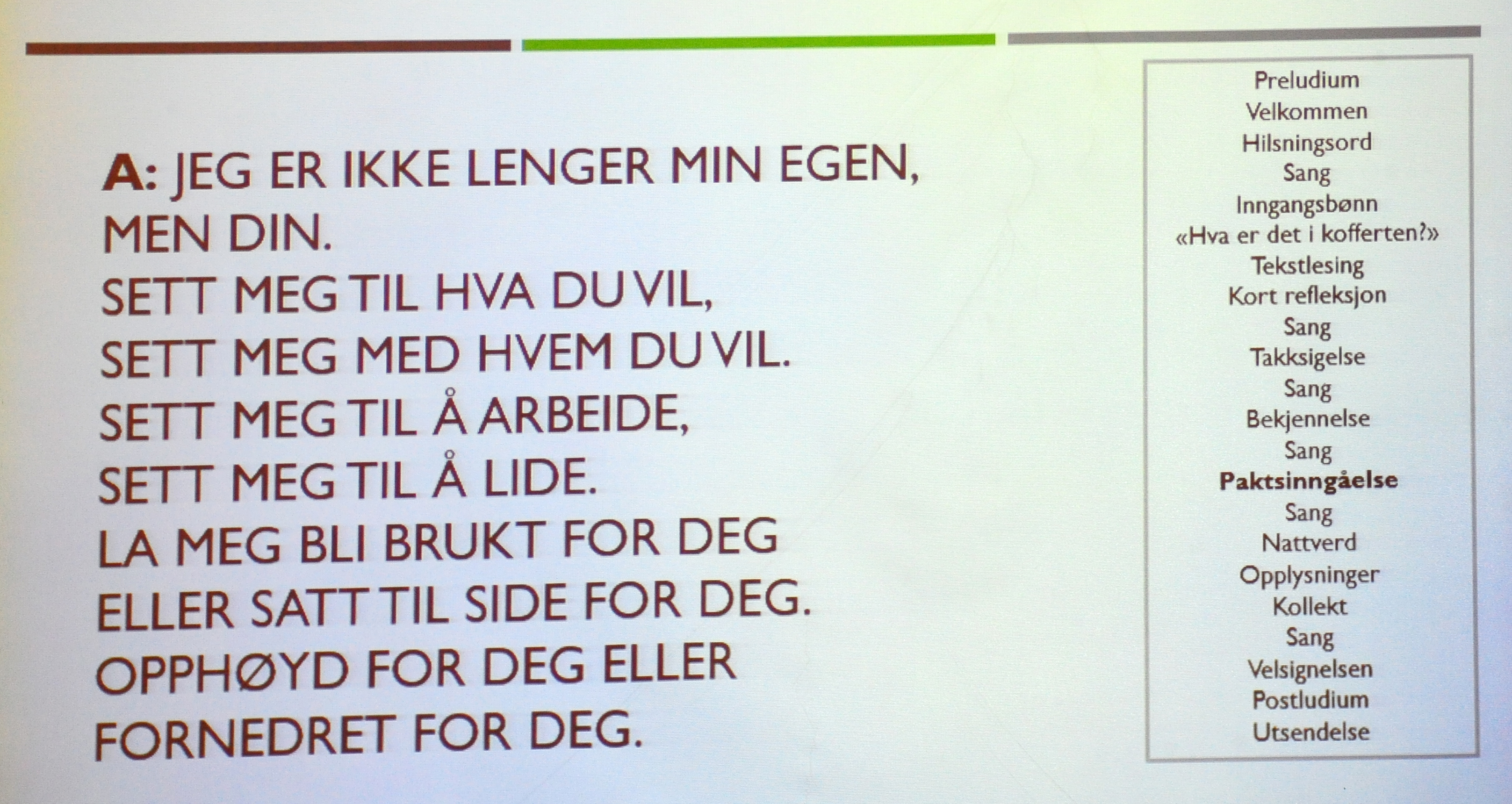 Gudstjenesten var inndelt i tre hovedledd som ivaretok til intensjonene i den opprinnelige wesleyanske paktsgudstjenesten: «Takk» – «Bekjennelse» – «Paktsinngåelse». Mellom leddene sang vi passende salmer som «Dra meg og Jesus, inn i din favn», «I surrender all» og «Vi kommer på ditt ord».