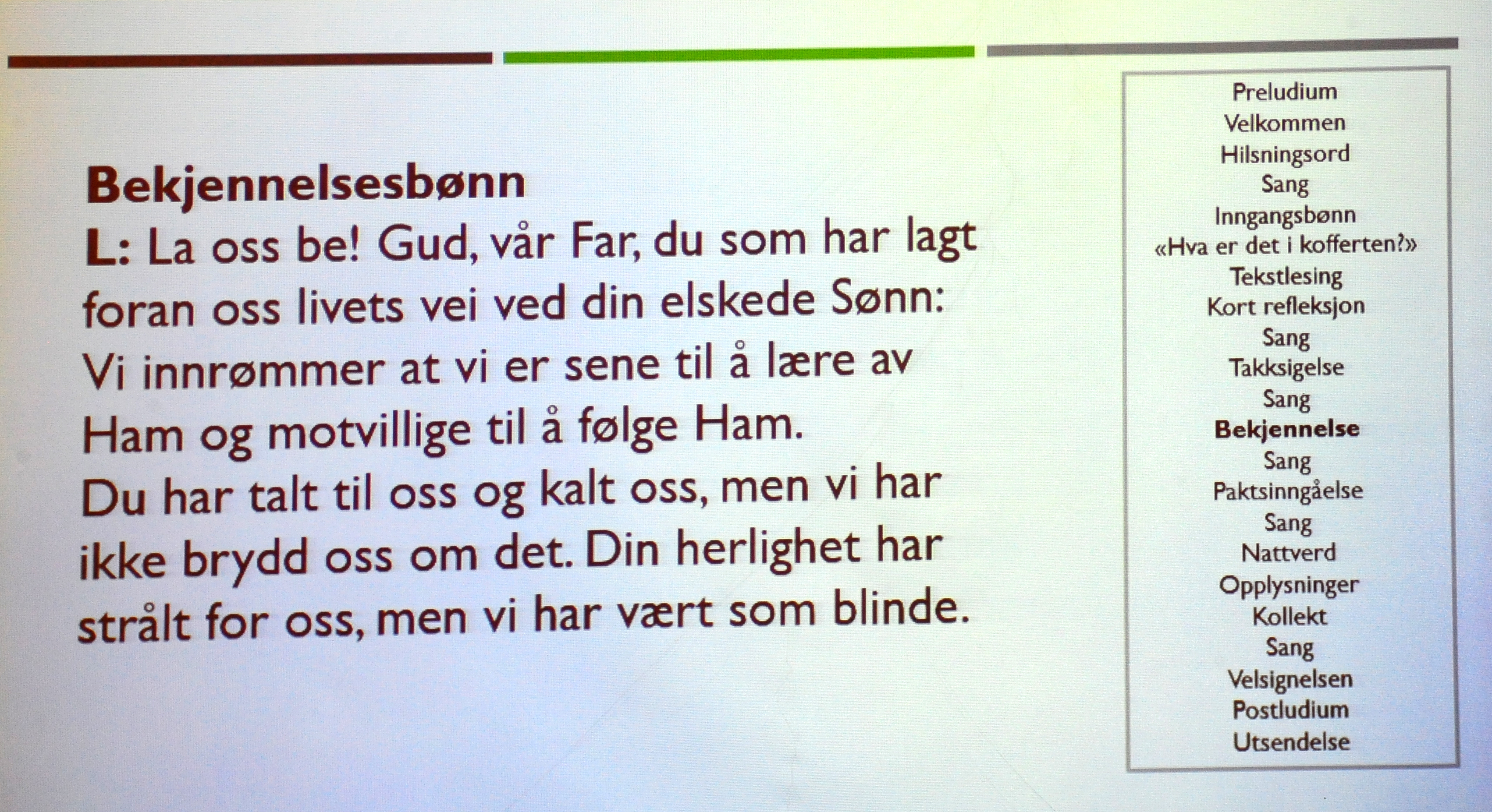 Så fortsatte det med kofferten, hvor barna fant et samisk flagg før de fulgte med Åse-Karen Mortensen opp til søndagsskole på kirkeloftet. Og dagens bibeltekster ble lest fra menighetens samiske bibel, av Tone-Merete Øverby. Hun er vitenskapelig assistent ved NTNU, og har i mange år jobbet med registrering og bevaring av samiske kulturminner for både Sametinget og ved Sørsamisk museum og kultursenter i Snåsa. Eidith og Syvert Nørsett var kirkeverger. Takako Ueno spilte orgel, og Rune L. Hoggen styrte teknikken.