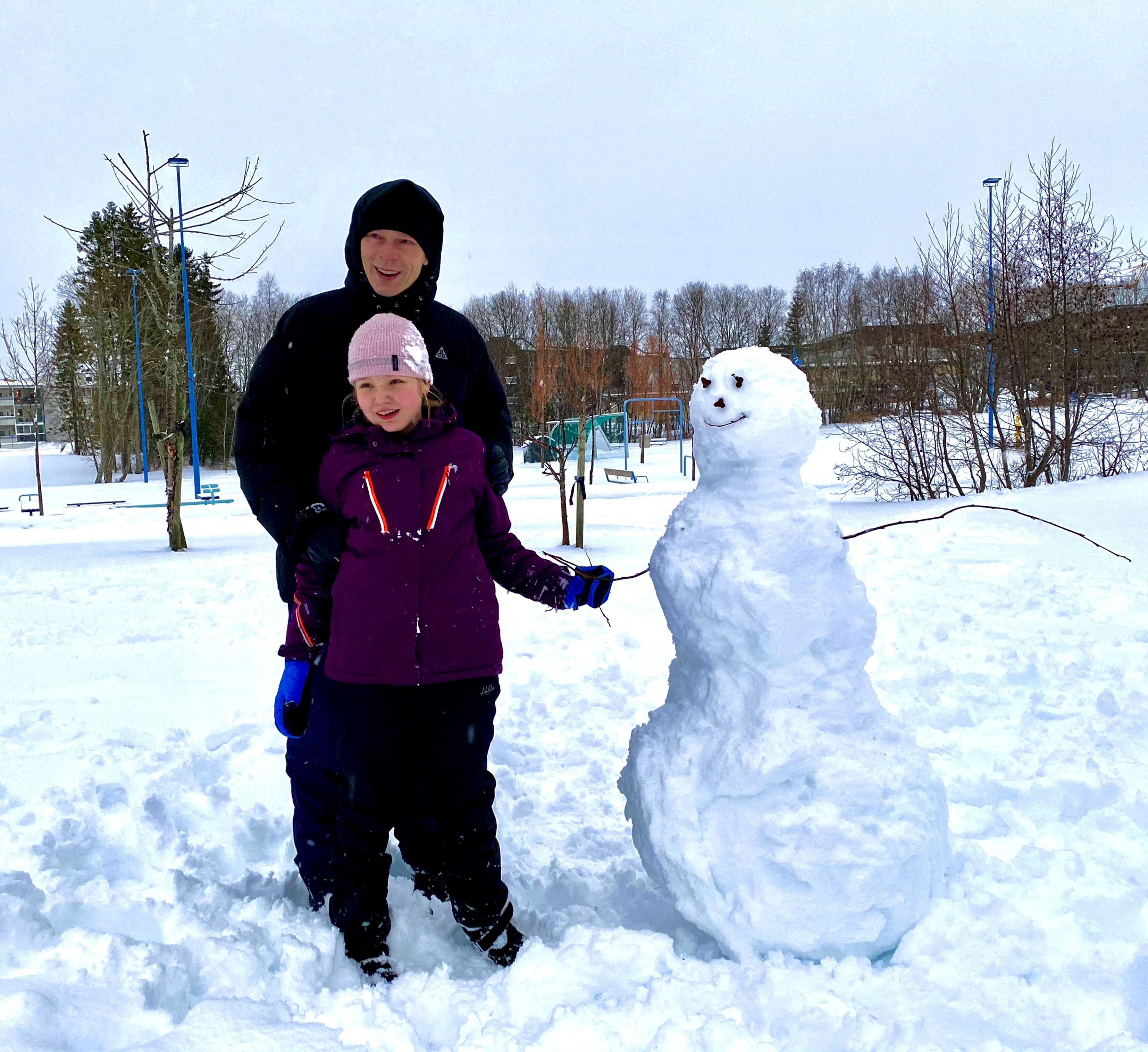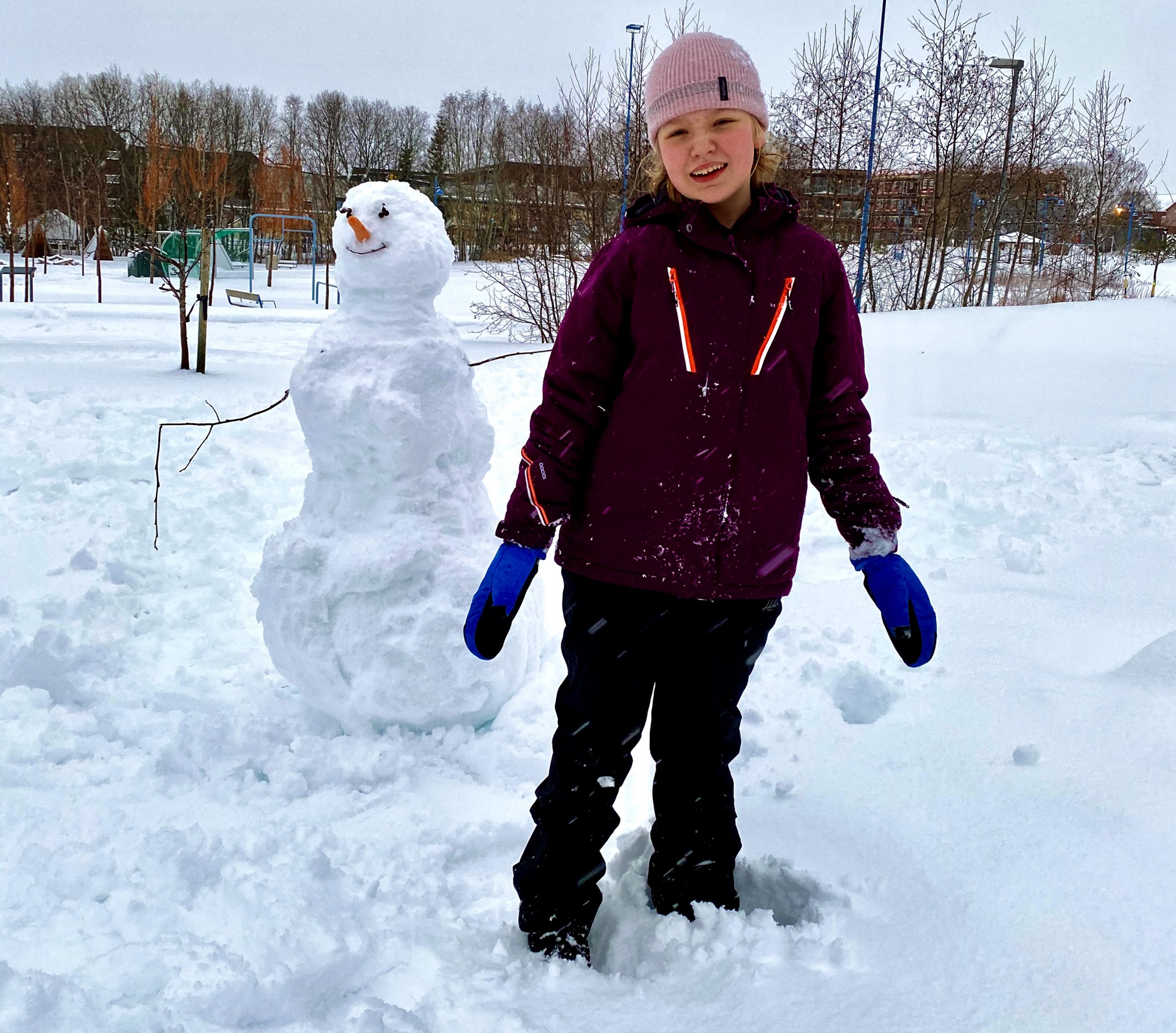 Arvid (Strømme) og Solvår (Sivertsen) sørget for at deltakerantallet kom opp i 27! Tar vi ikke mye feil, heter snømannen i disse «Frost-tider», Olaf. Bildet er tatt før han fikk gulrot til nese. Foto: Sylvi Larsen Strømme
