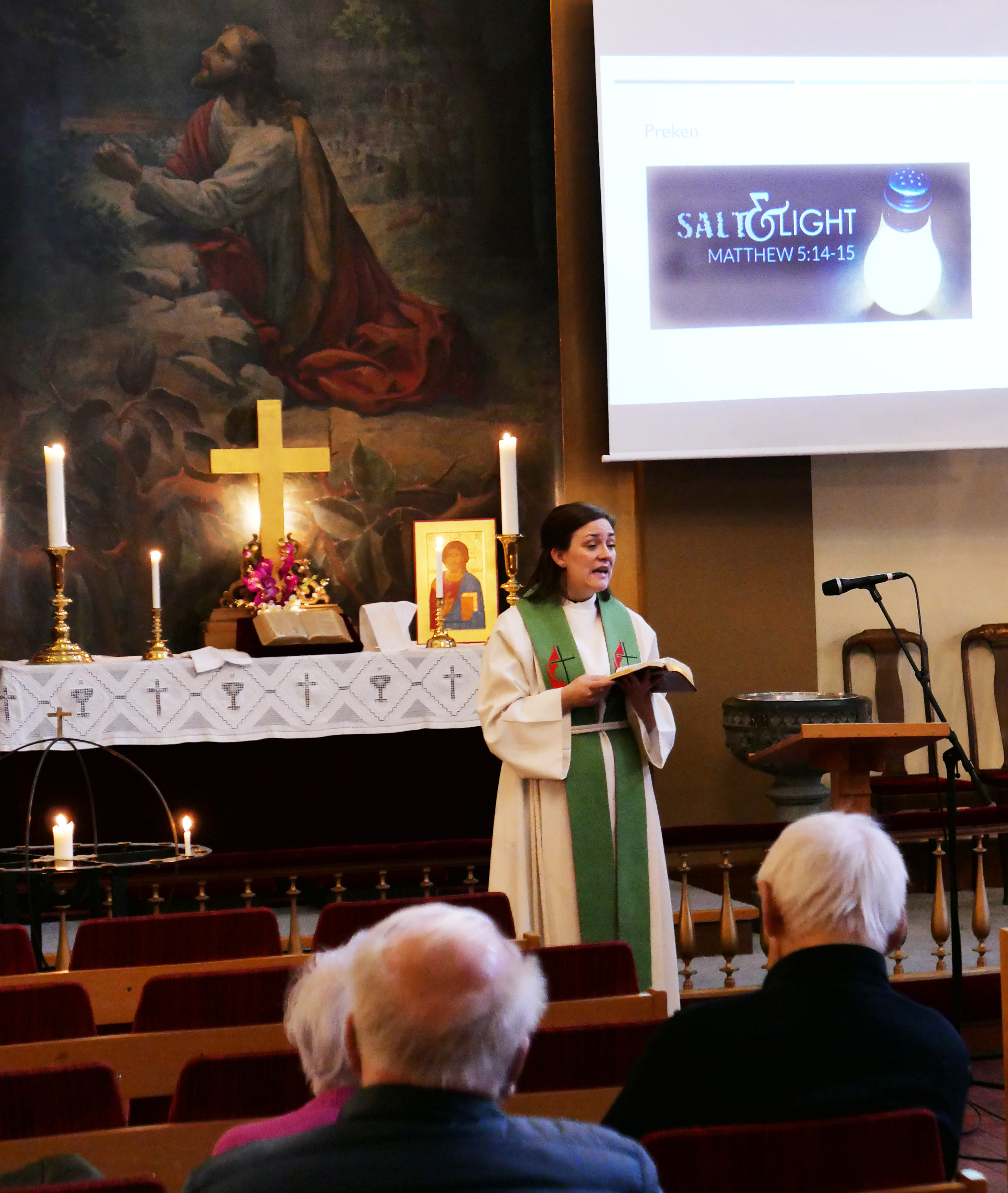 I forhold til selve prekenteksten om jordens salt og lys (Matteus 5:13-16), tok Christina utgangspunkt i saltets funksjon. Ikke bare at det konserverer og gjør holdbart, men også at det setter smak på mat. Når Jesus sier at vi skal være jordens salt, betyr det at vi skal være med å sette smak på folks liv, gjennom gudsrikets framvekst i blant oss. Vi skal bevare hans ord – og dele det.