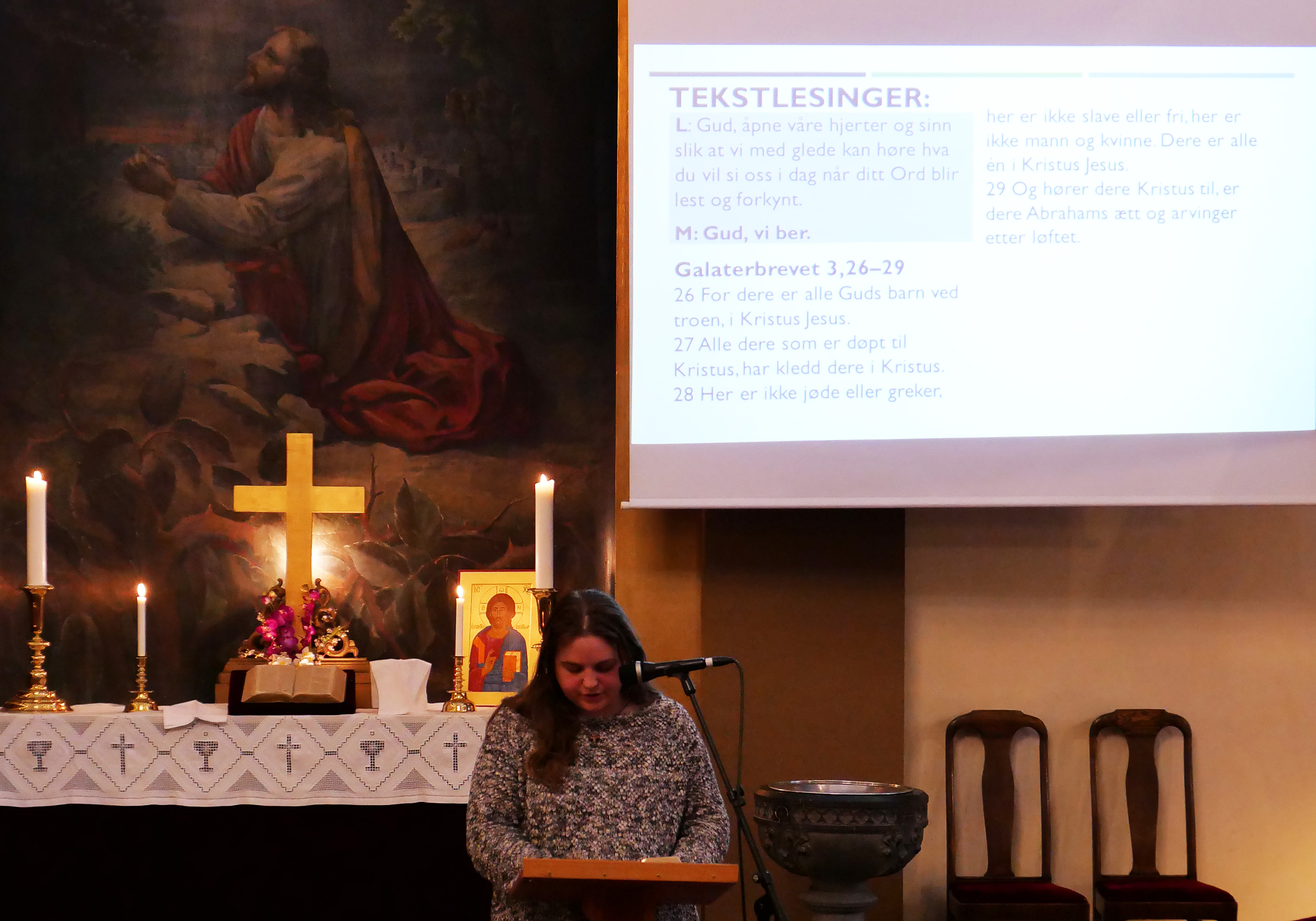 Gudstjenesten ble ledet av ungdommene Hannah (Burkeland) og Trygve (Sivertsen). Sven Nørsett bidro med vakkert pianospill og salmekomp. Kirkevert var Synnøve Sivertsen som også leste dagens bibeltekst. Vi markerte i tillegg at det var Bibeldagen, og ga et offer til Bibelselskapets aksjon for bibelspredning i Kina.