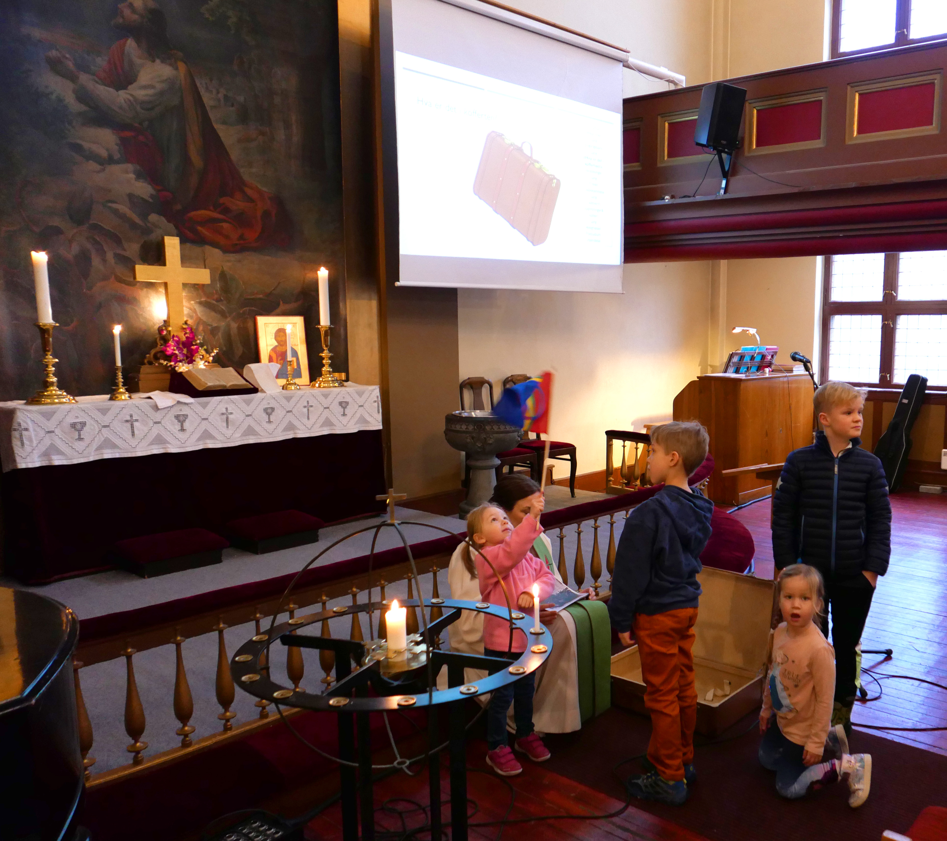 Også denne gudstjenesten ga selvfølgelig rom for åpning av «kofferten». Der hadde pastor Christina lagt pysjamasen sin, slumbershades («sovebind» for øynene) og en vekkerklokke. Dette som en introduksjon til dagens søndagsskoletema: Hva som skjedde da Jesus sov i båten under stormen. Og det Åse-Karen Mortensen videre med på kirkeloftet. Men også barna fikk med seg en understrekning av dagens hovedtema gjennom trønderversjonen av «Når det stormer». Bjørg Burkeland og Amelie Abudeaa Hagan var kirkeverter. Bjørg leste tekstene. Takako Ueno var organist.