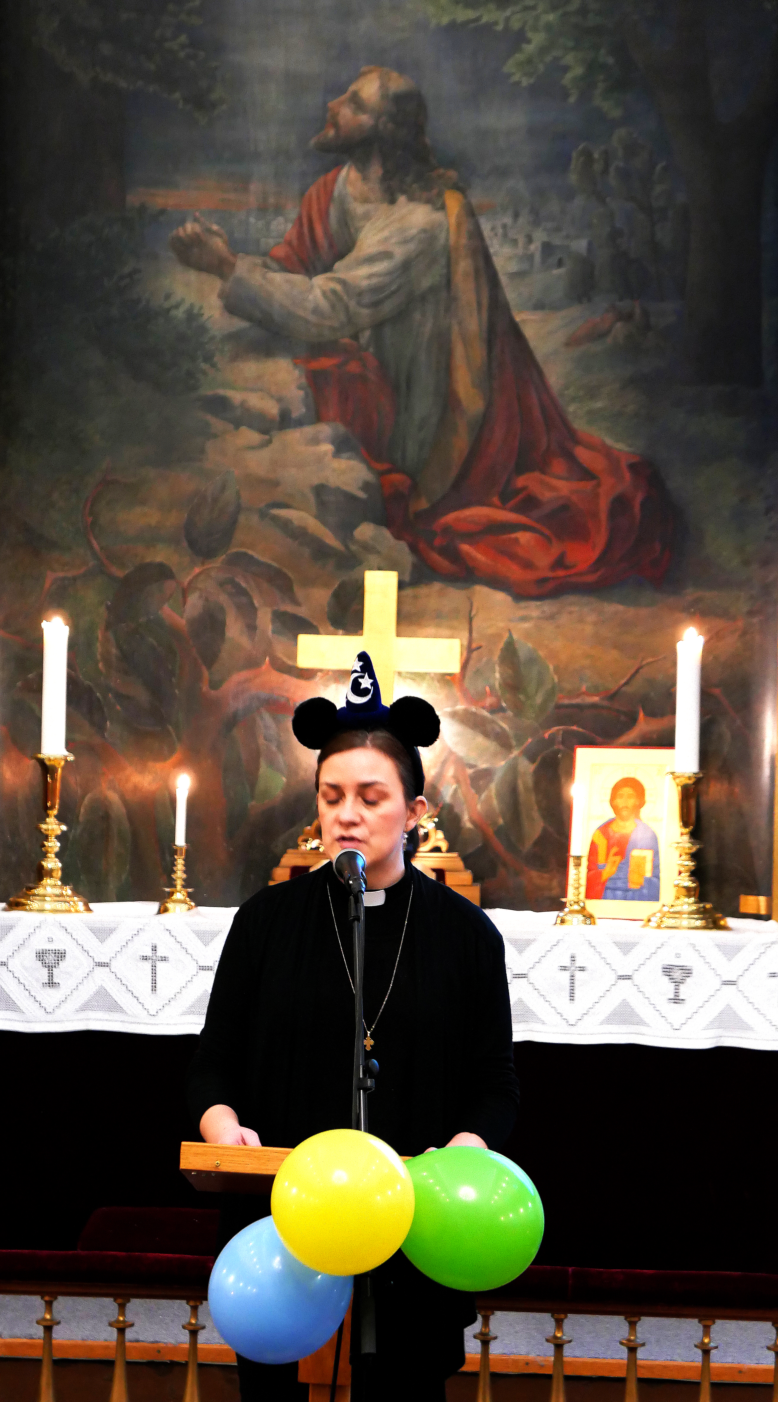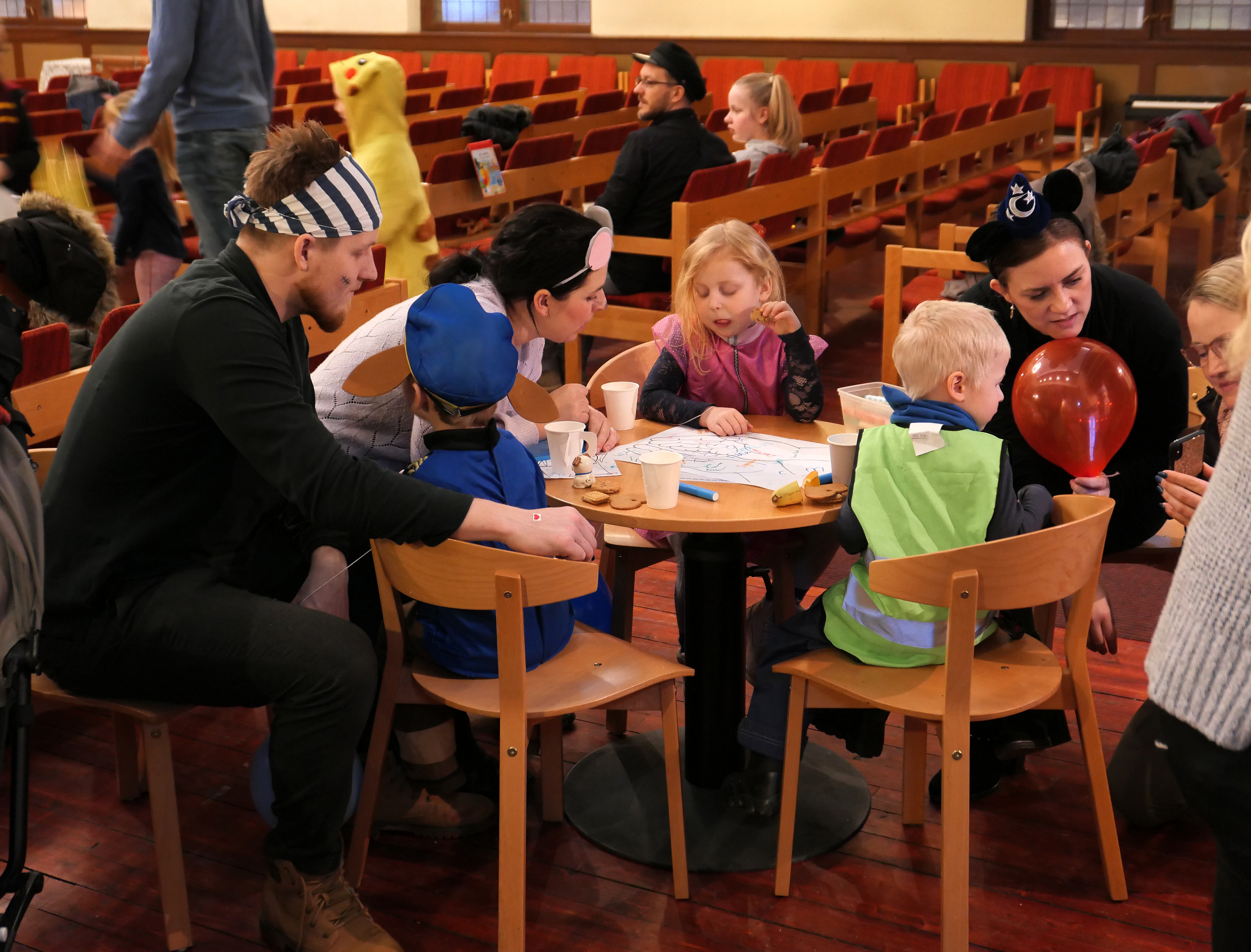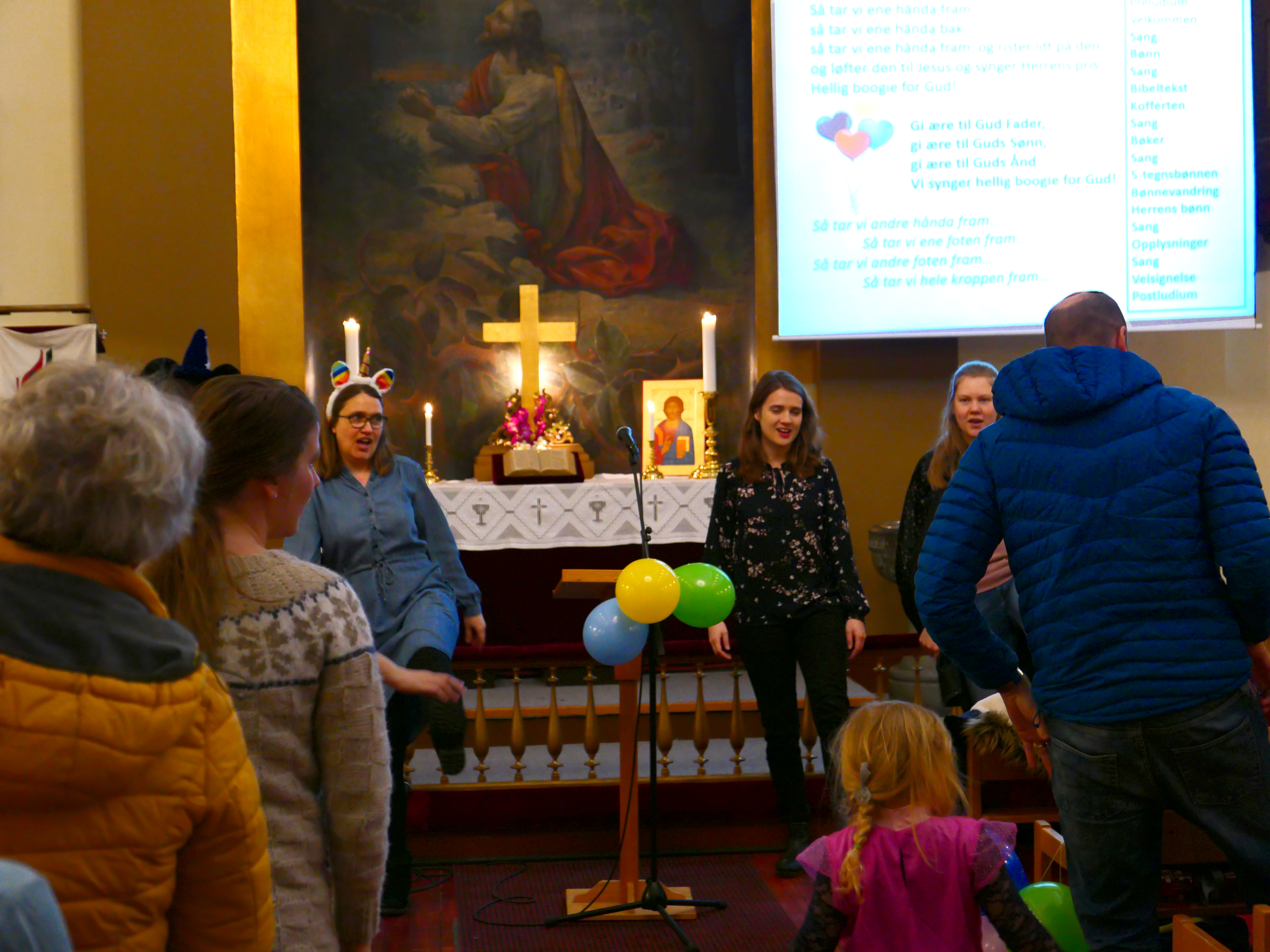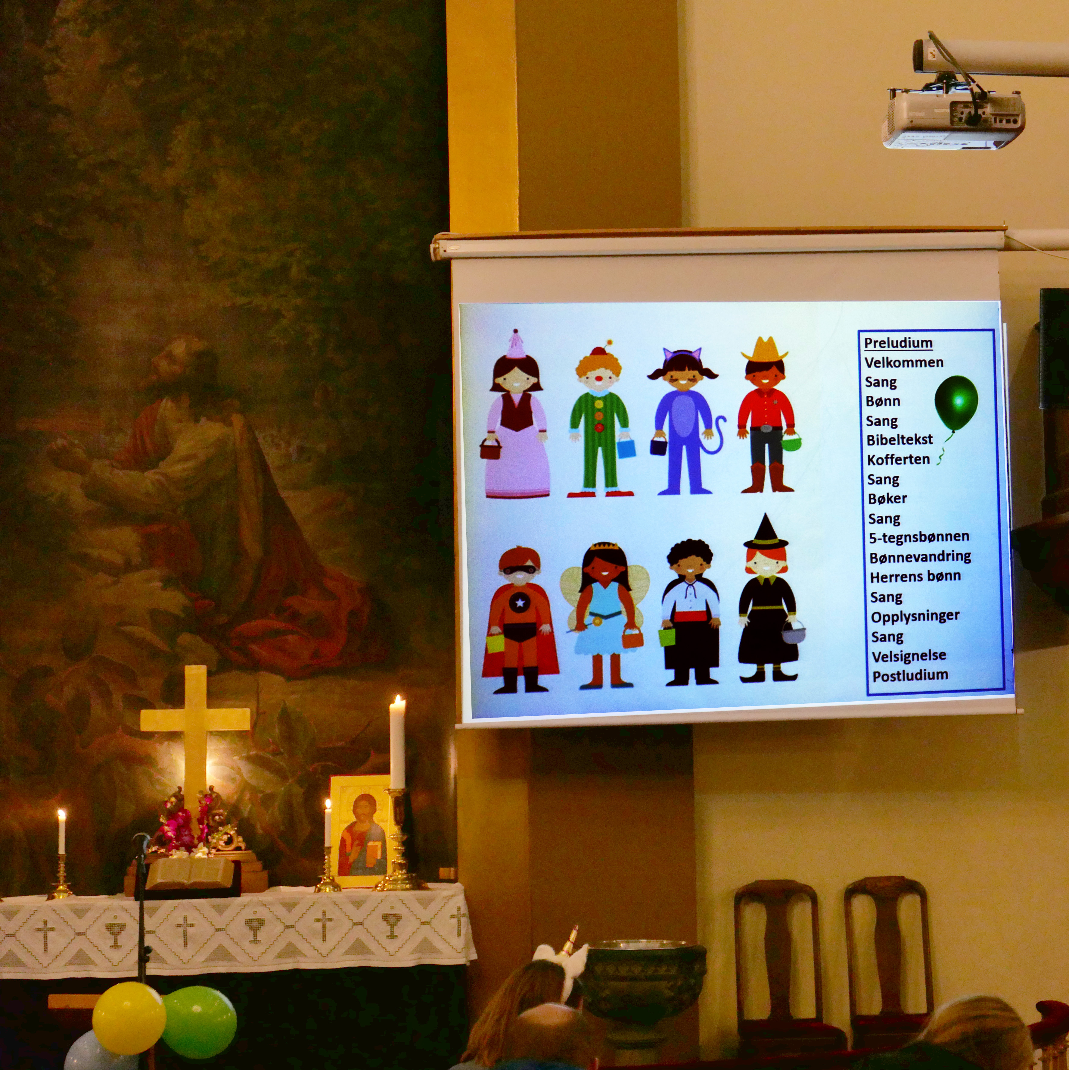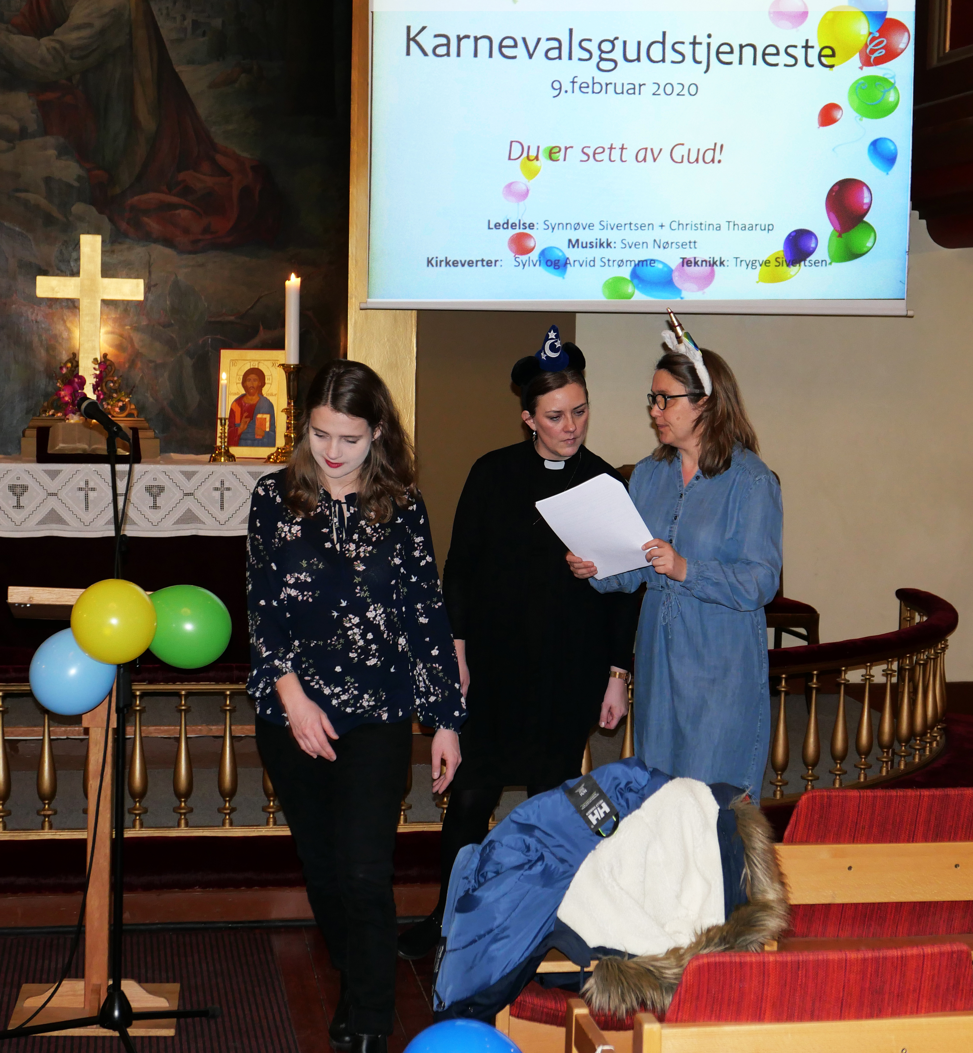 Karnevalsgudstjenesten var planlagt og ble ledet av Synnøve Sivertsen. Det var opptil flere flotte, morsomme kostymer å se, fra prinsesser til sjørøver og Harry Potter. Andre nøyde seg med hodepynt ala «museører» og masker, mens mange også kom akkurat slik som de er/var. Og alle ble del av et livsglad fellesskap. Kirkevert var Arvid Strømme, mens Sven Nørsett trakterte flygelet.