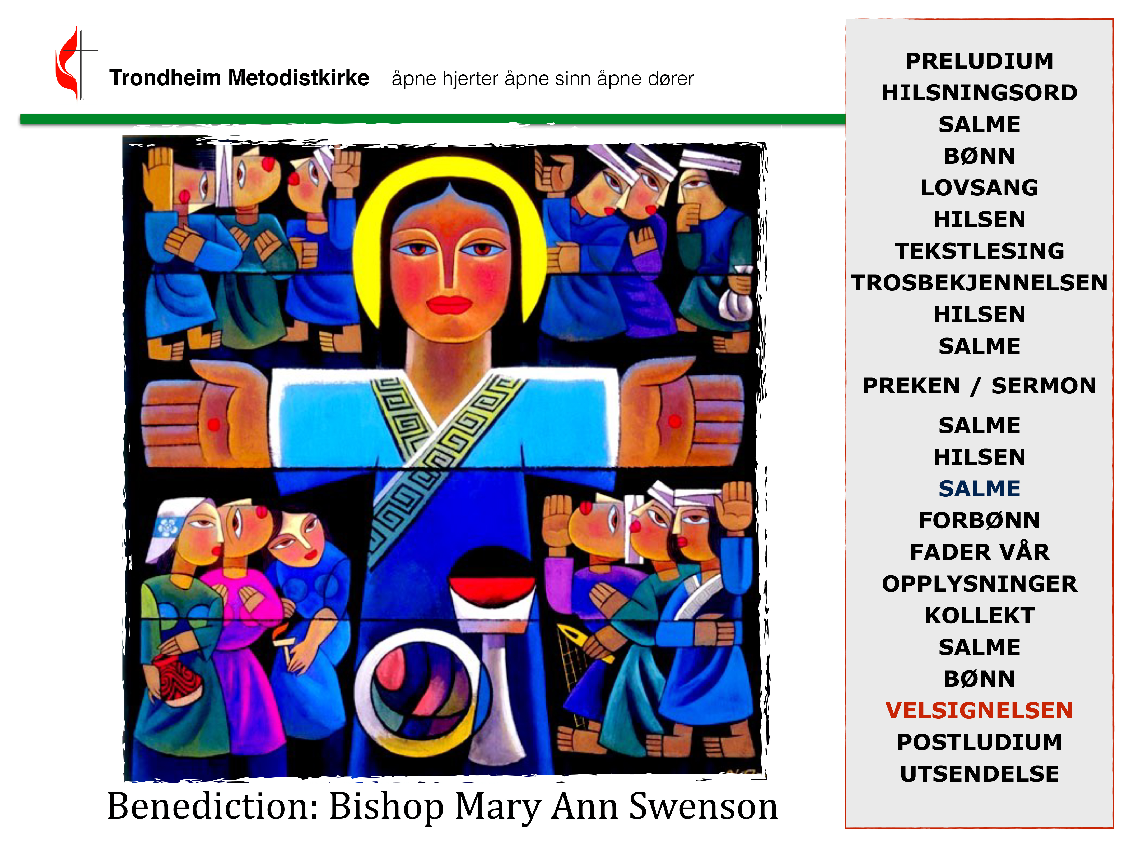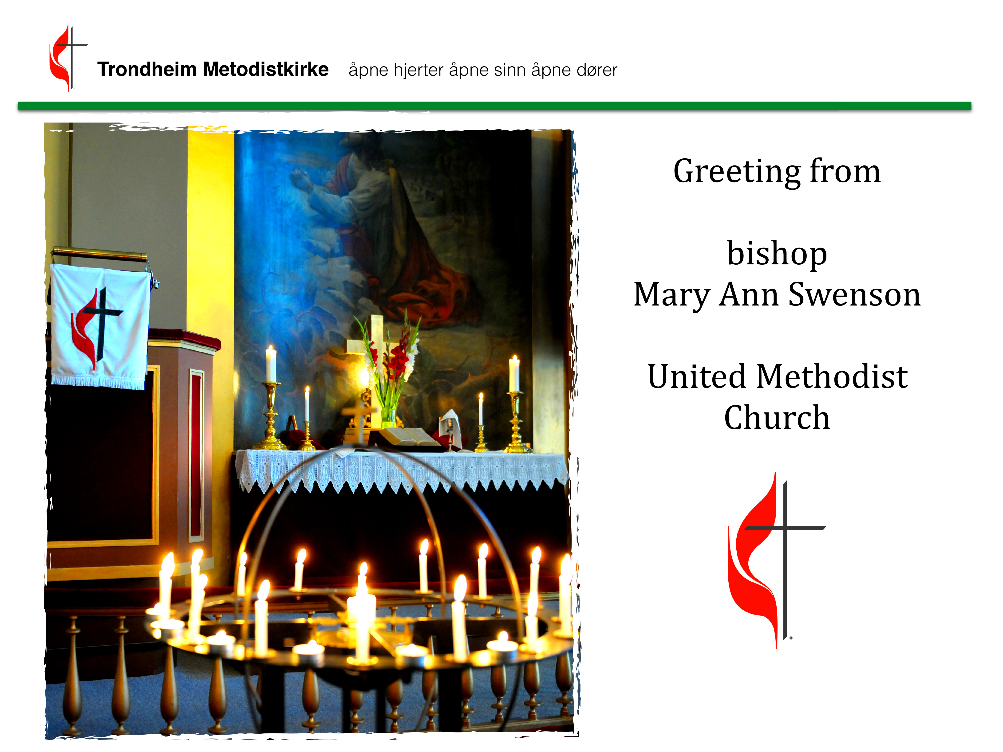 Den som beskriver menigheten vår slik, er biskop Mary Ann Swenson (74). Hun er ganske fantastik selv! Innimellom sykehusbesøk til sin mann, har hun funnet tid til å sende Trondheim Metodistkirke en videohilsen, fem år etter at hun deltok på den spesielle gudstjenesten i kirken vår, som samlet mange deltakere fra Kirkenes Verdensråds sentralkomite.