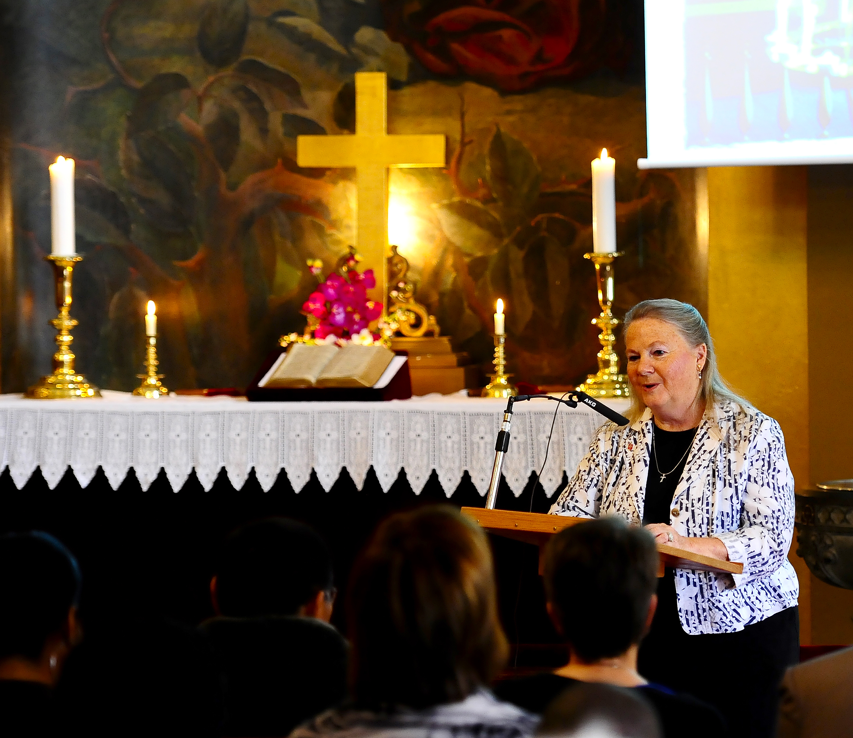 Sally Dyck var i Trondheim som medlem av Kirkenes Vrdensråds sentralkomite, som hadde lagt sitt møte til byen vår i slutten av juni 2016. Vi hadde invitert de 14-15 representantemne for ulike metodistkirker; de tok med seg kolleger fra sentralkomoiteen slik at vi hadde 40-50 internasjonale gjester på gudstjenesten. (du kan lese mer om denne helt spesielle gudstjenesten her: https://wordpress.com/post/trondheimumc.com/12088