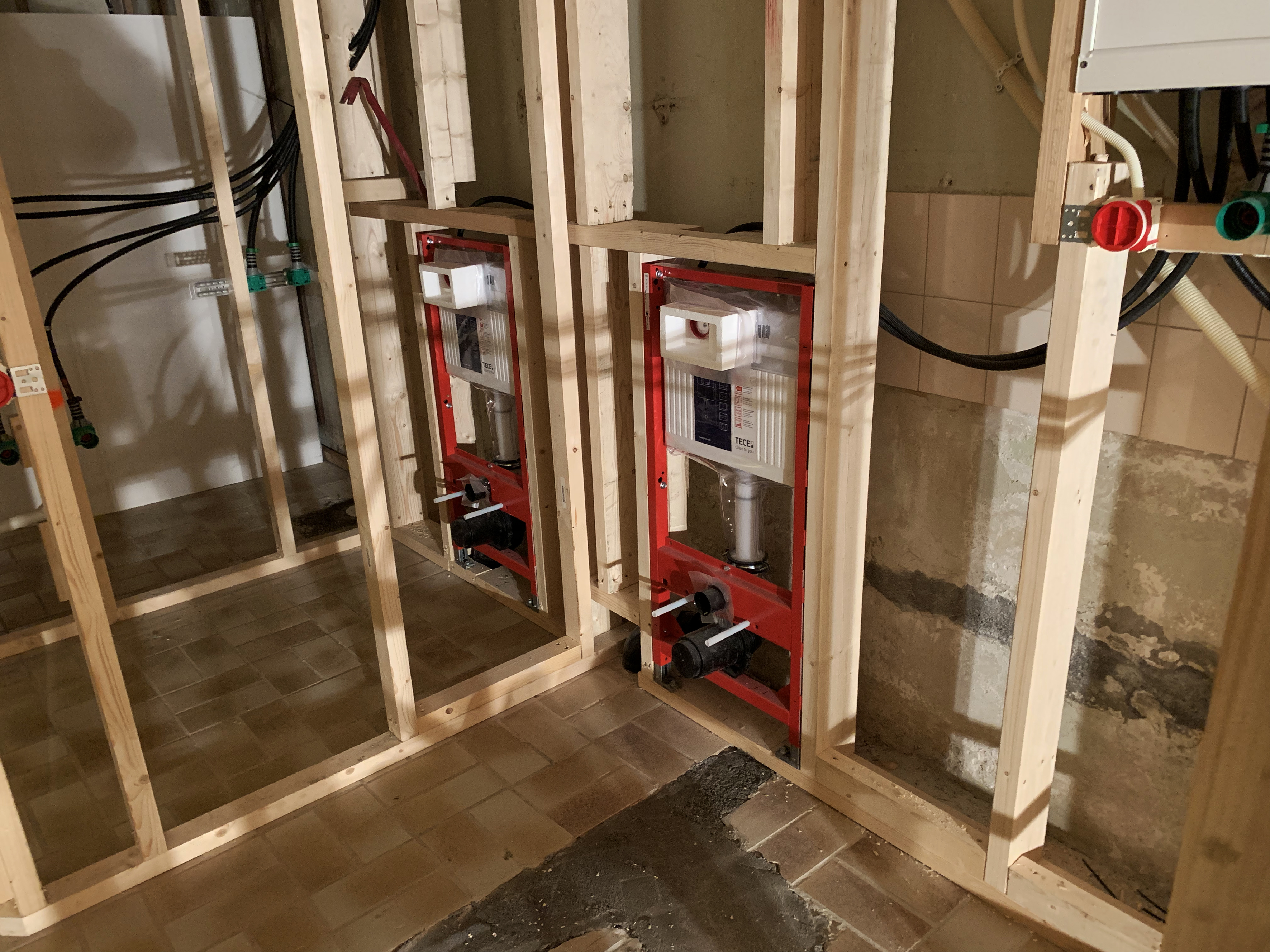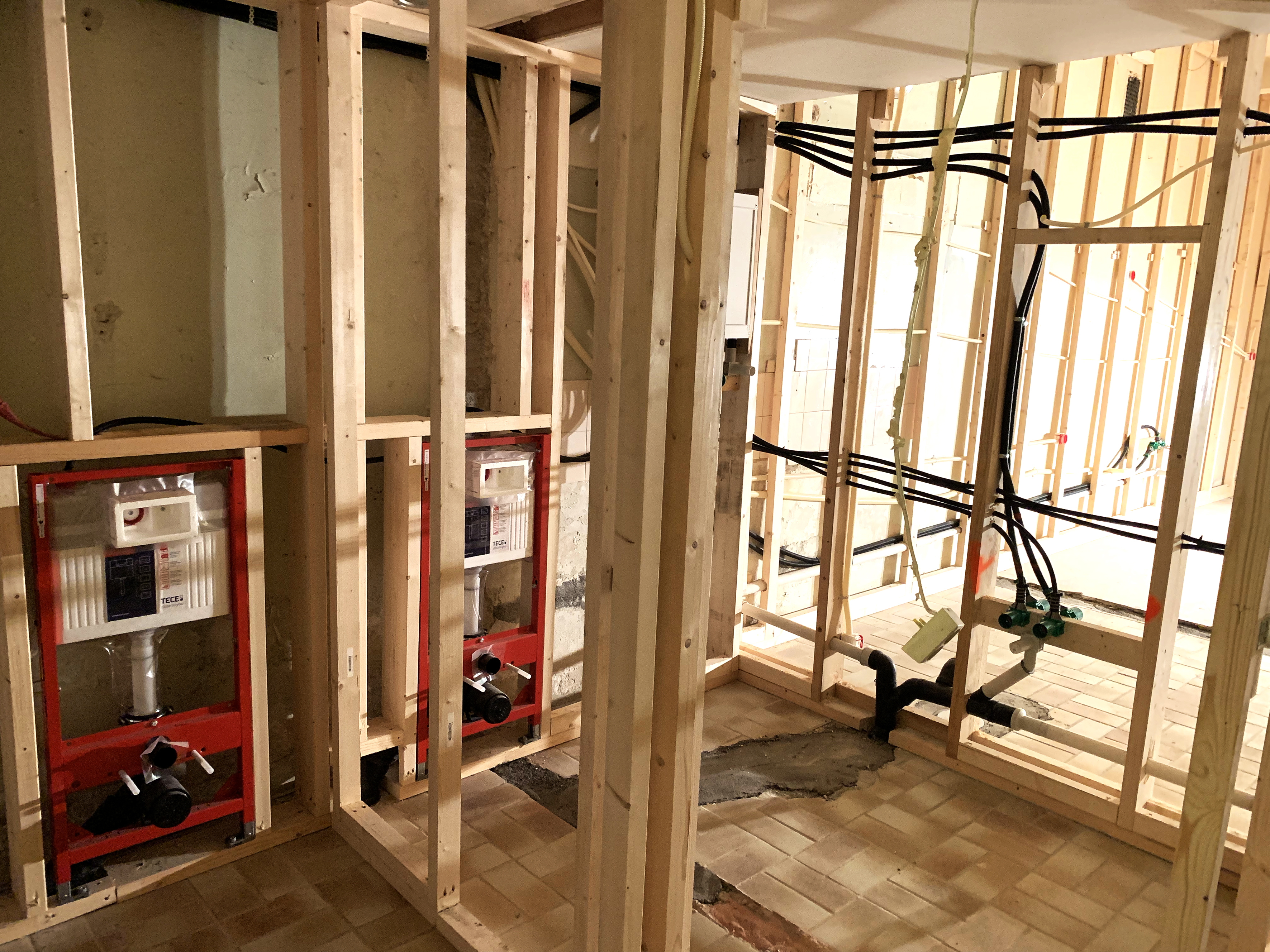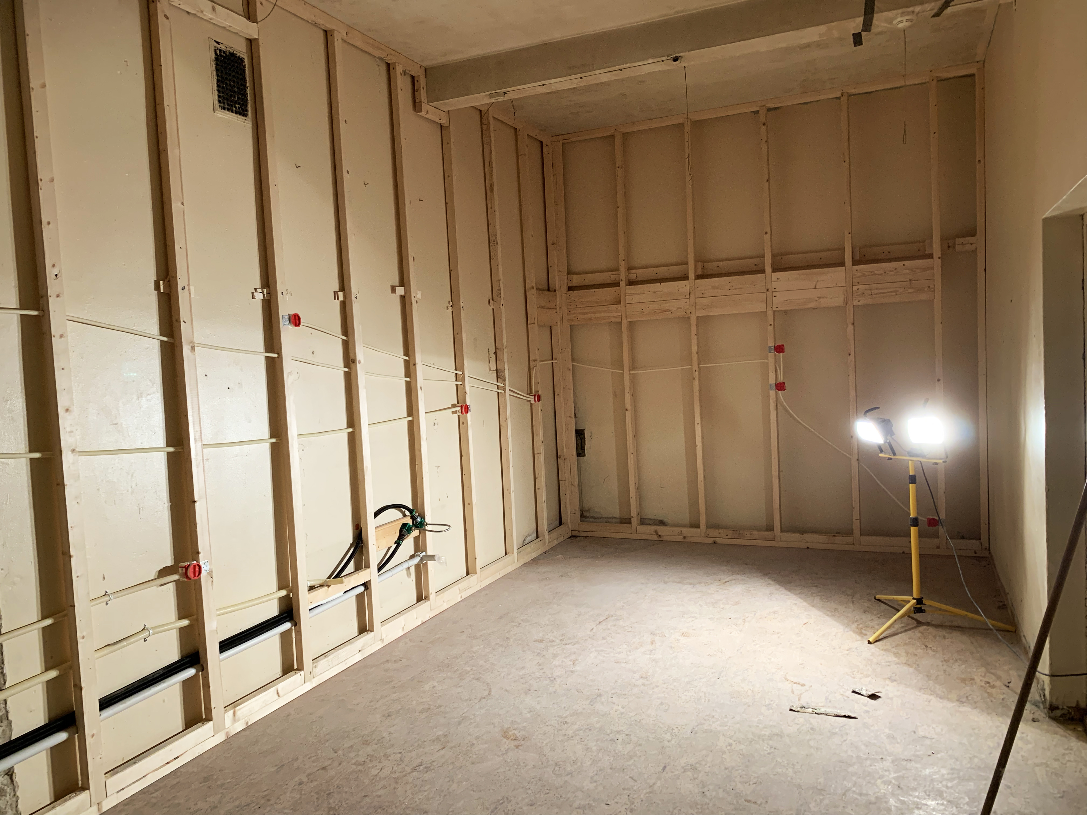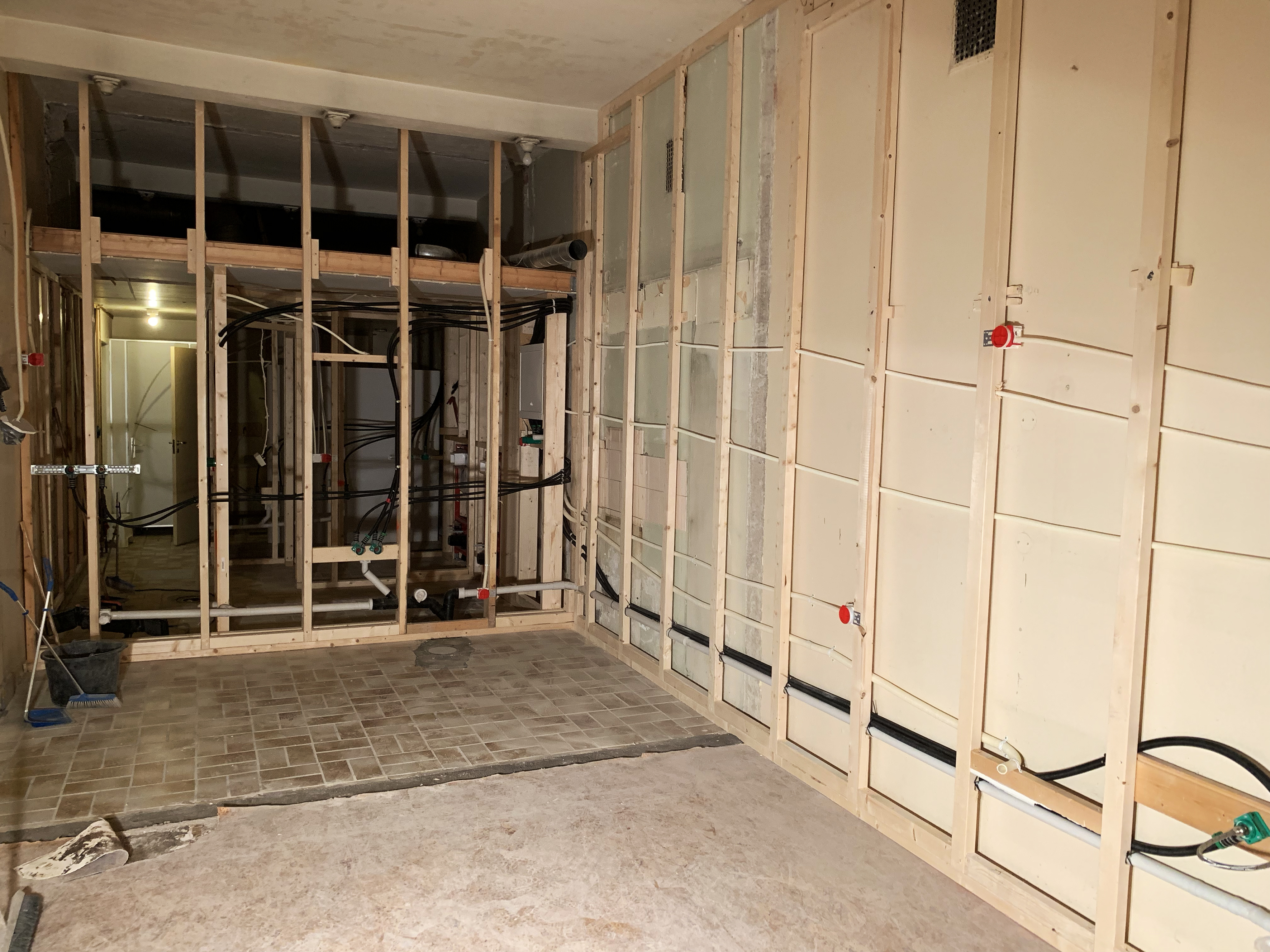 Kombinasjonen av god planlegging, effektivt dugnadsarbeid og meget dyktige fagfolk gjør at byggeprosjektet går på skinner, og vel så det. Etter at menighetsmedlemmer fikk fjernet 7-8 tonn murstein, har håndverkerne virkelig gjort vei i vellinga. Fredag skal det støpes nytt gulv både i kjøkken/toalett og korridor-arealet. Veggene er allerede lektet ut og skjult elektrisk- og røranlegg montert; vegghengt toalettopplegg er på plass, slik at veggene kan kles igjen i neste uke! Kjøkkenutstyret/innredningen er bestilt og vil bli levert uten noen forsinkelse.
