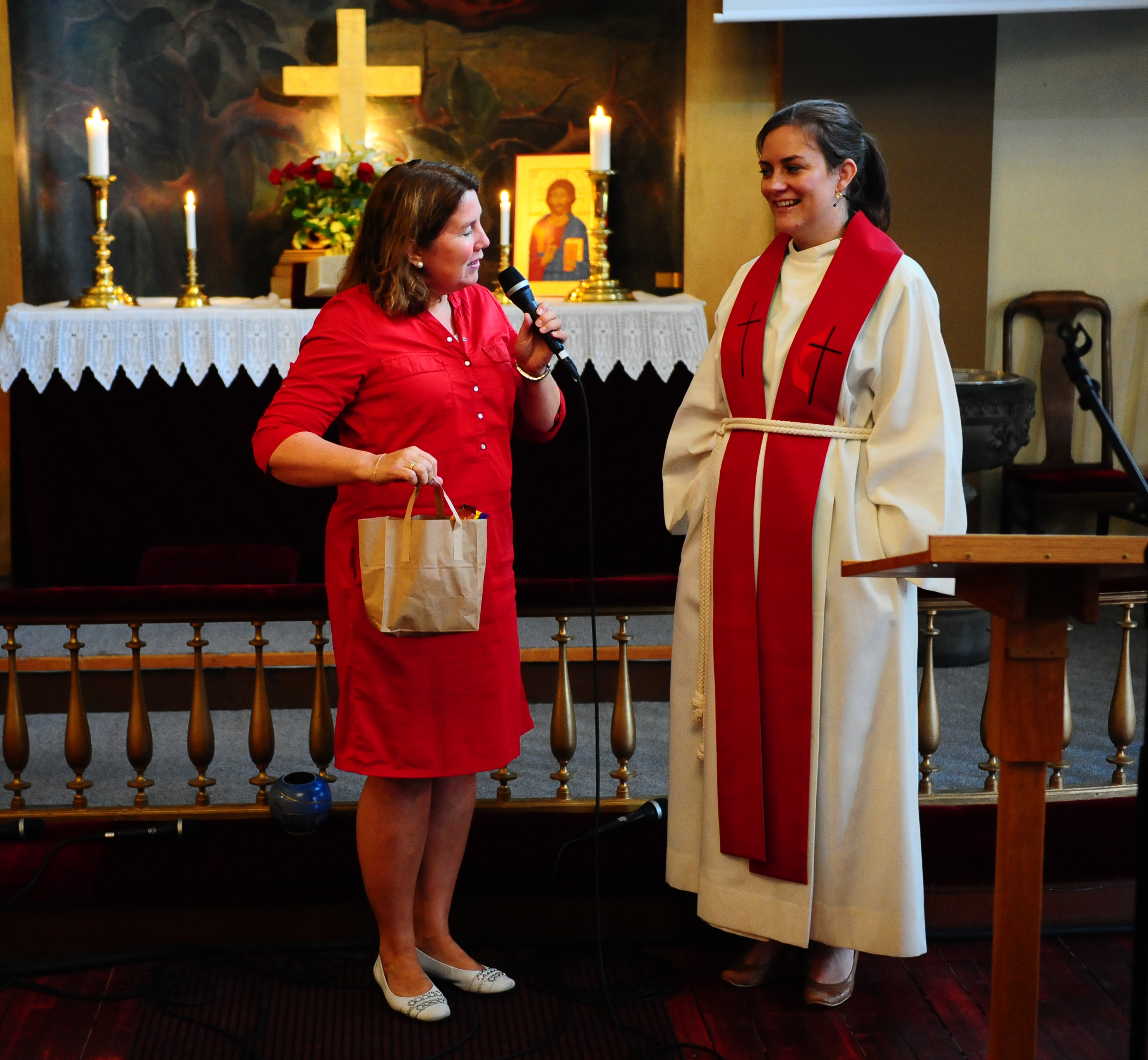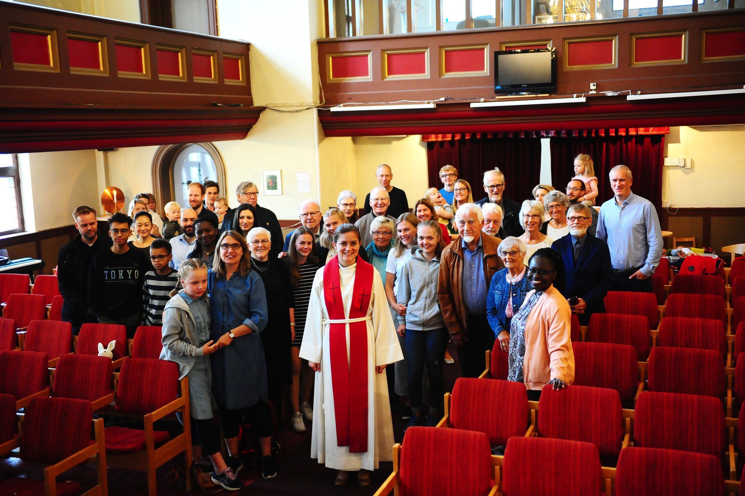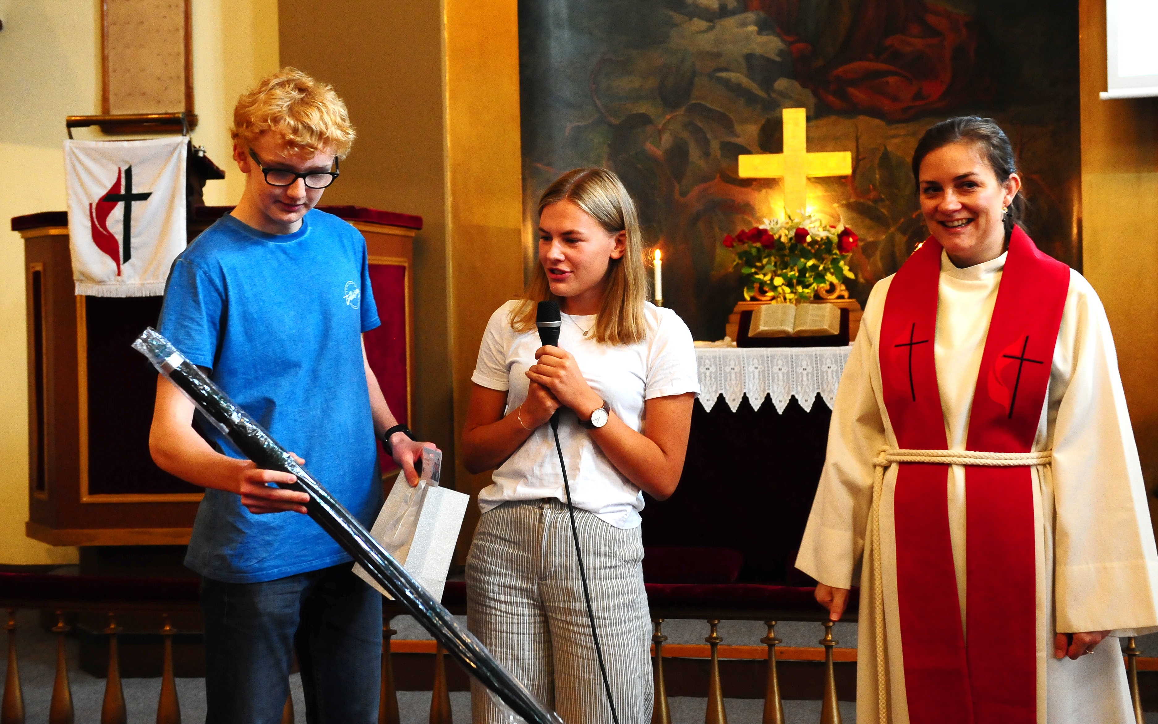 To av våre flotte ungdommer, Hannah (Burkeland) og Trygve (Sivertsen) ledet gudstjenesten. De hilste umiddelbart Christina velkommen ved å overrekke henne et trøndersk «survival-kit» bestående av en stor paraply, et par hvite tennissokker og en samling med løsbarter. Senere i gudstjenesten fikk hun fra menigheten en pose med ulike «hjemmehygge»-artikler, overlevert av personalkomiteens leder Sylvi (Larsen Strømme). Takako Ueno høynet som vanlig gudstjenesten med sitt orgel- og pianospill. Flott med lovsangs/forsangergrupp, denne gange bestående av Henriette (Strømme) Hannah (Burkeland) og Synnøve (Sivertsen). Har du lyst til å bidra med sang/musikk i gudstjenesten, så nøl ikke med å si fra!! Kirkeverter var Torun og Ole-Einar (Andersen)