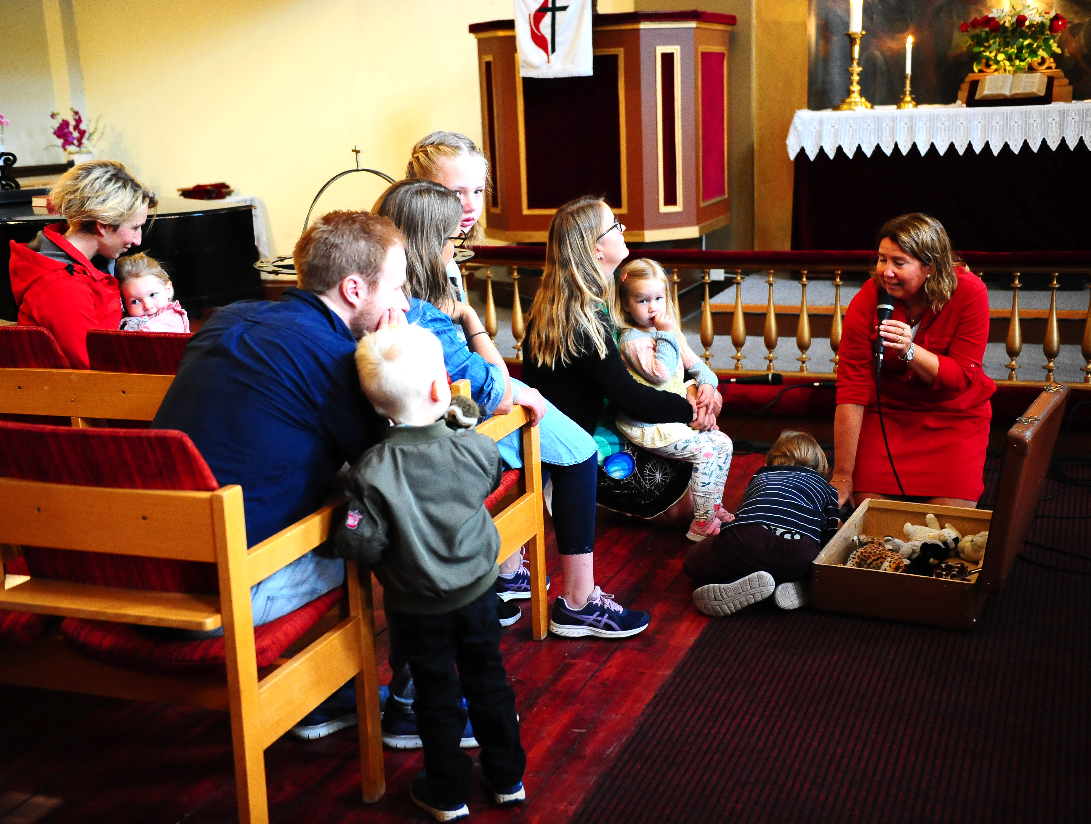 Vi var 45 på samlingsgudstjenesten, fra babyer til veteraner på 90+. Veldig hyggelig gjensyn med Ulf Arne Meistad, som var på feriebesøk i hjembyen. Inntrykk gjorde det også å ha besøk av Hermann (vi oppdaterer med etternavn straks vi får det!) fra Finnmark som var på en «røtter-reise»; hans foreldre var blant de tvangsevakuerte fra Finnmark som bodde i kirken november/desember 1944. Ja, hans mor fødte en av Hermanns brødre under oppholdet i Metodistkirken!