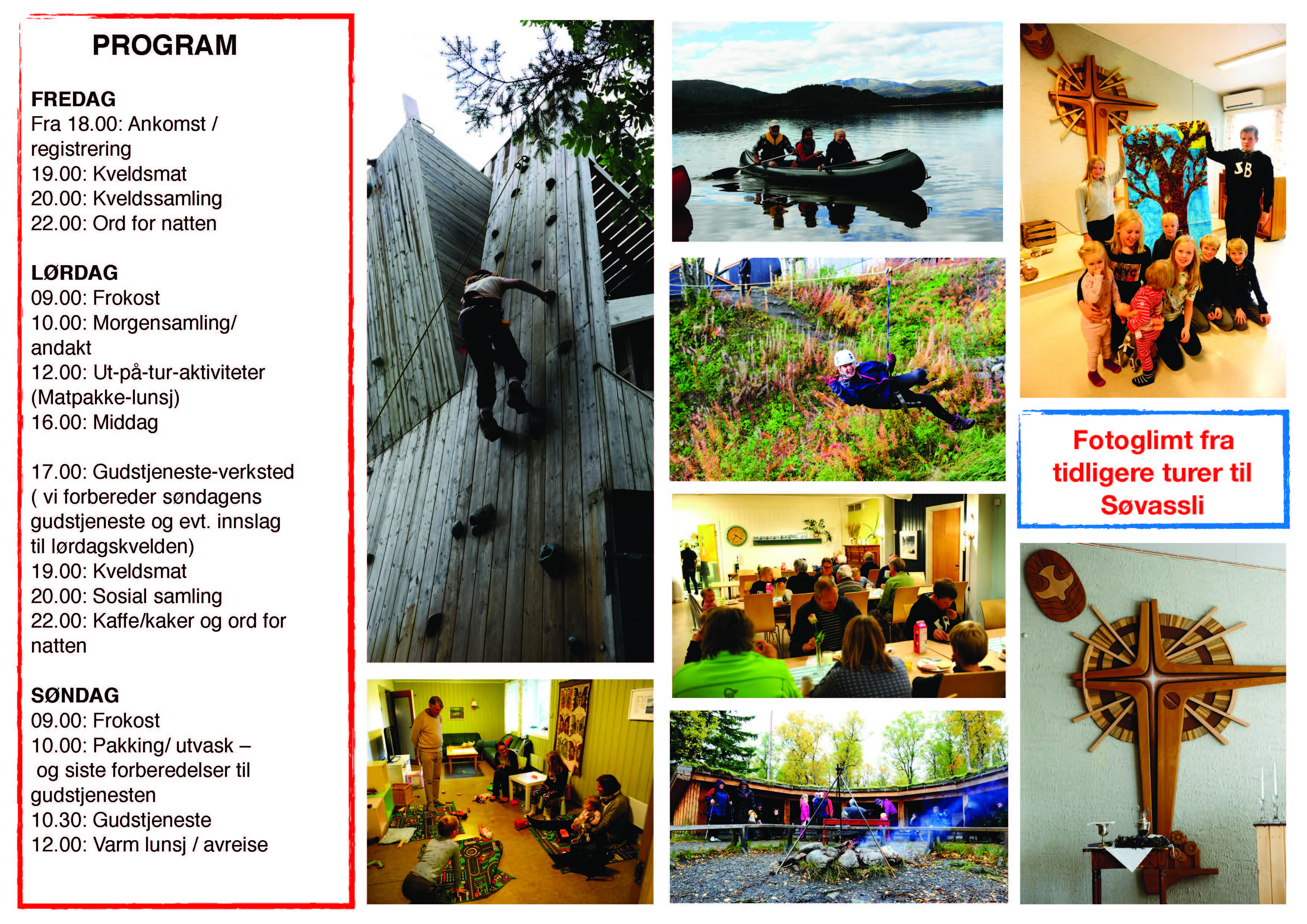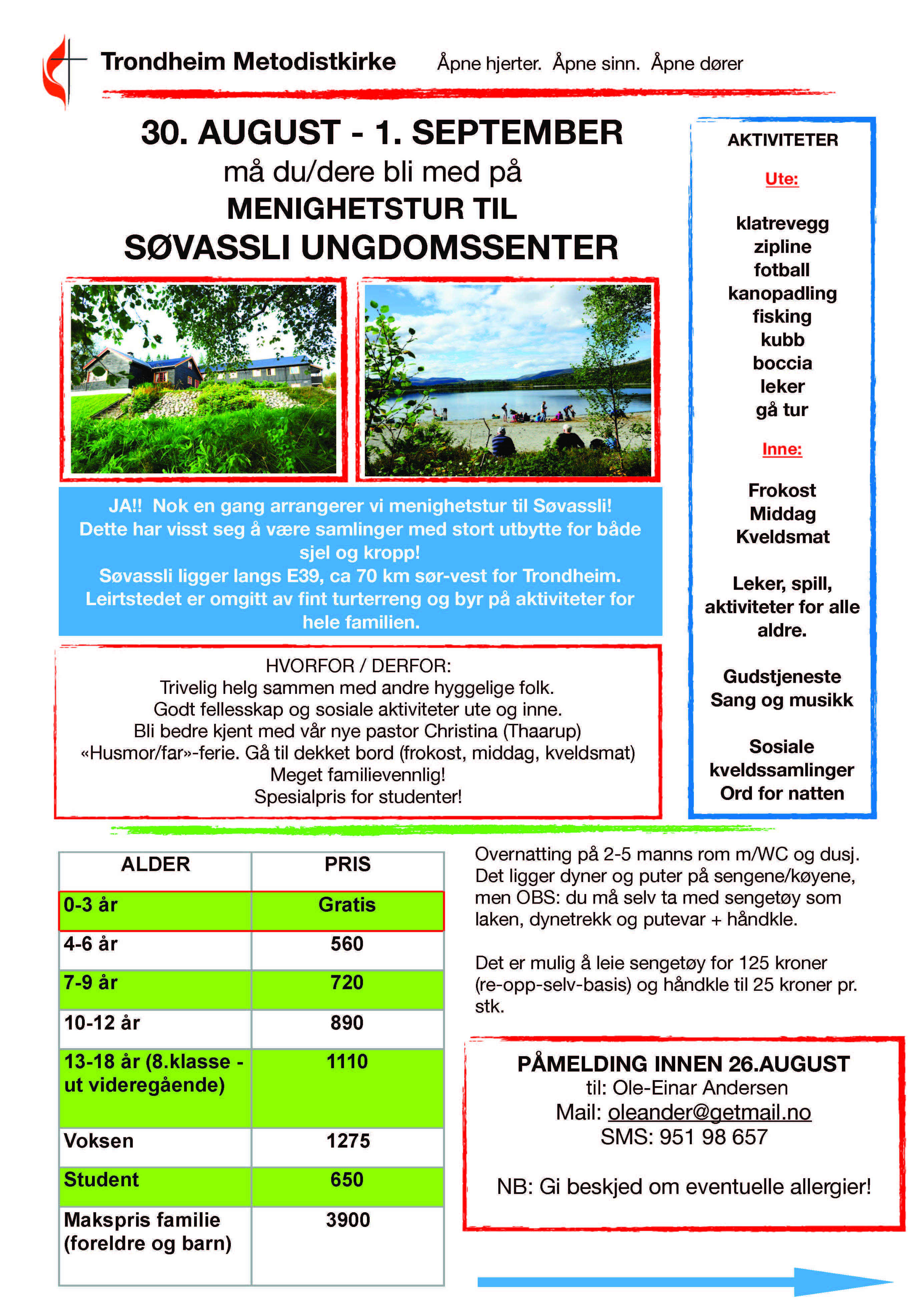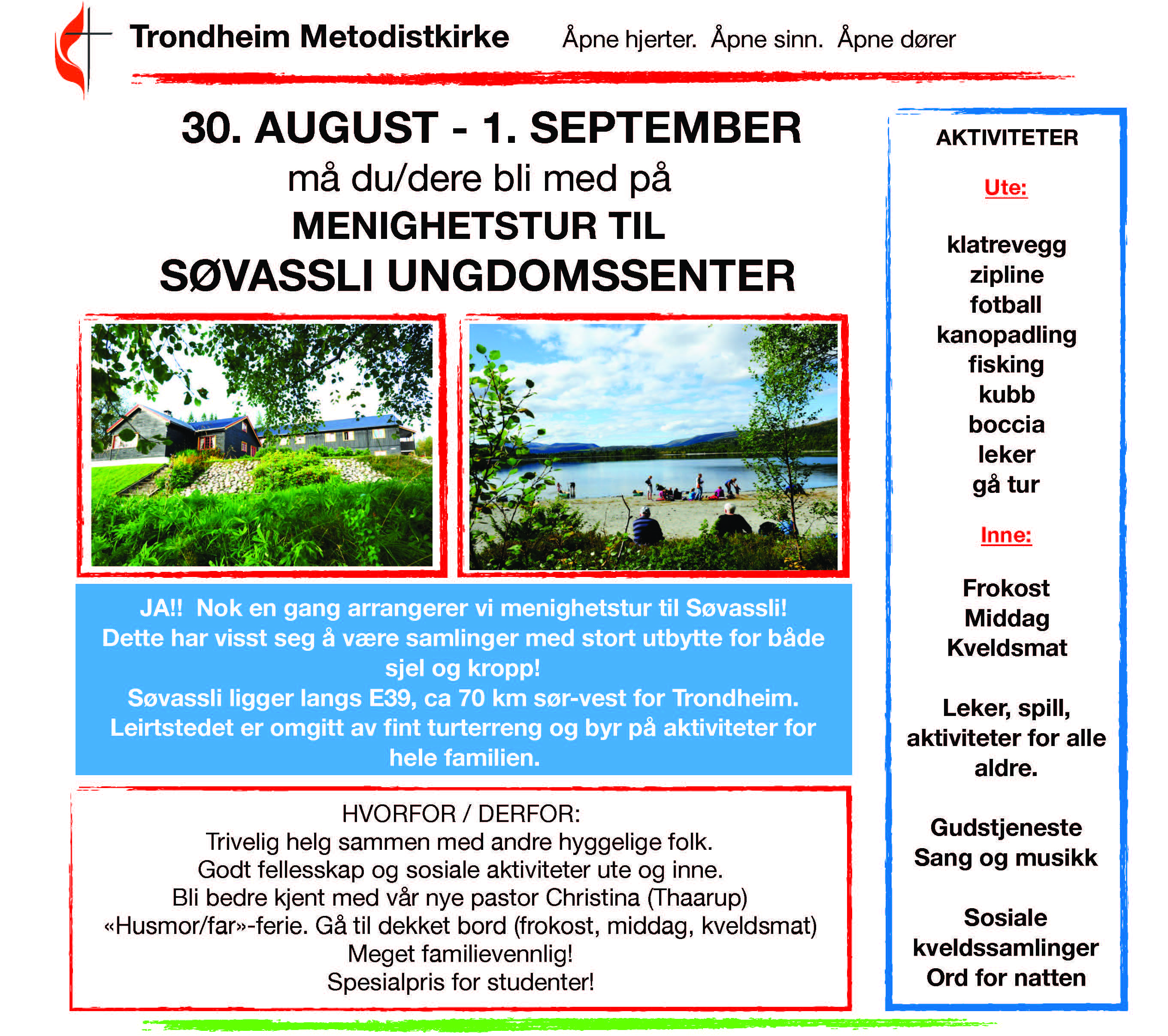 Allerede helga fredag 30. august – søndag 1. september, drar vi på menighetstur til Søvassli Ungdomssenter. Den turen håper vi mange blir med på! Det blir ei helg med flott felleskap på tvers av alle generasjoner! Du kan melde deg på nå!