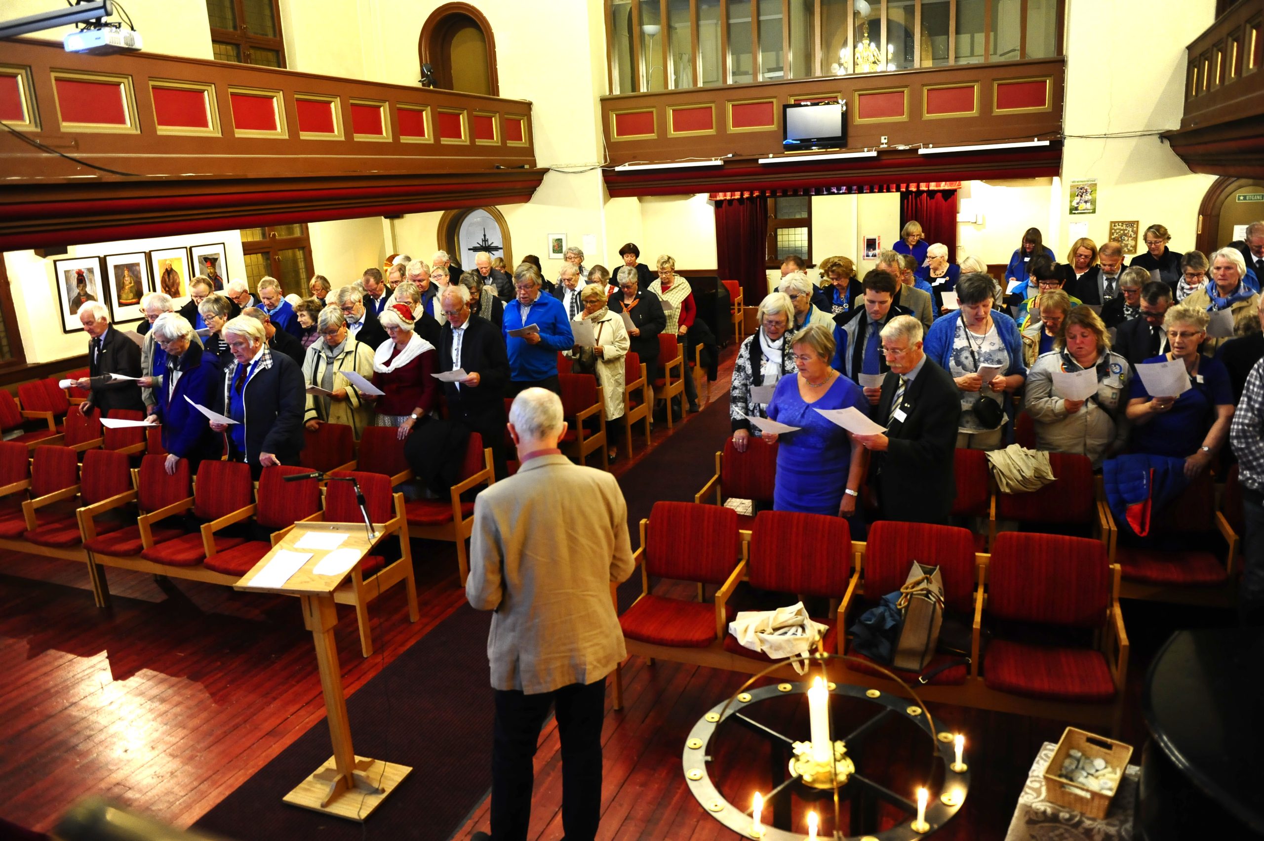 Fullsatt kirke da over 90 utsendinger til St. Georg Gildenes landsting i Trondheim samlet seg til kveldsgudstjeneste i Trondheim Metodistkirke kl. 23.00 lørdag kveld. Det ble et godt gjensyn/hør med vår tidligere pastor Ivan Chetwynd som ledet gudstjenesten.