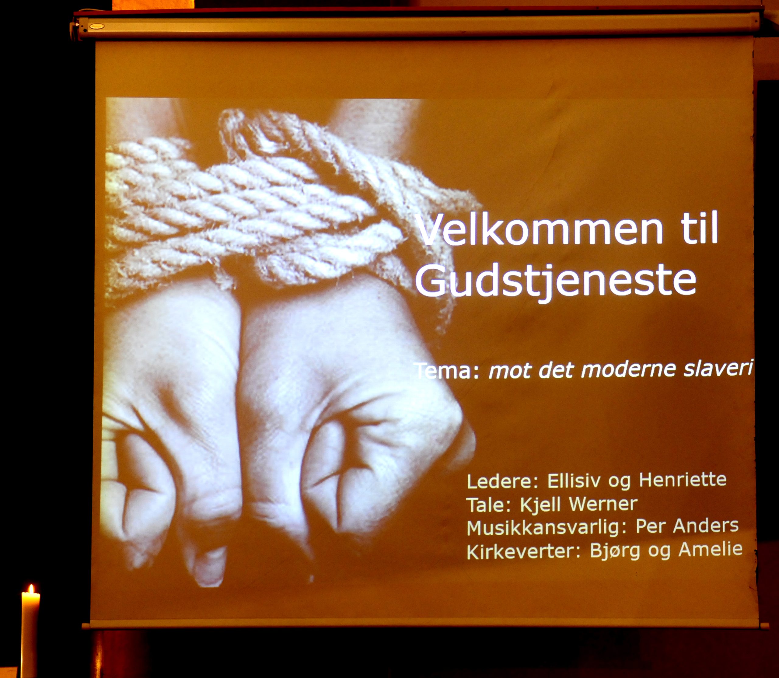 Gudstjenesten med temaet ”Det moderne slaveri” var planlagt, og ble ledet, av to av menighetens ungdommer, Ellisiv Sivertsen og Henriette Larsen Strømme. Og den ble en en meget aktuell start på vårt overordnede november-tema: ”Hellighet – utopi eller et ufravikelig must?” Per Anders Mortensen (piano) ledet en trio som spilte strålende. Vi hadde også besøk av 10 elever fra videregående skole som etter gudstjenesten fikk stilt sin nysgjerrighet om Metodistkirken i en samtale med pastor Rødder.
